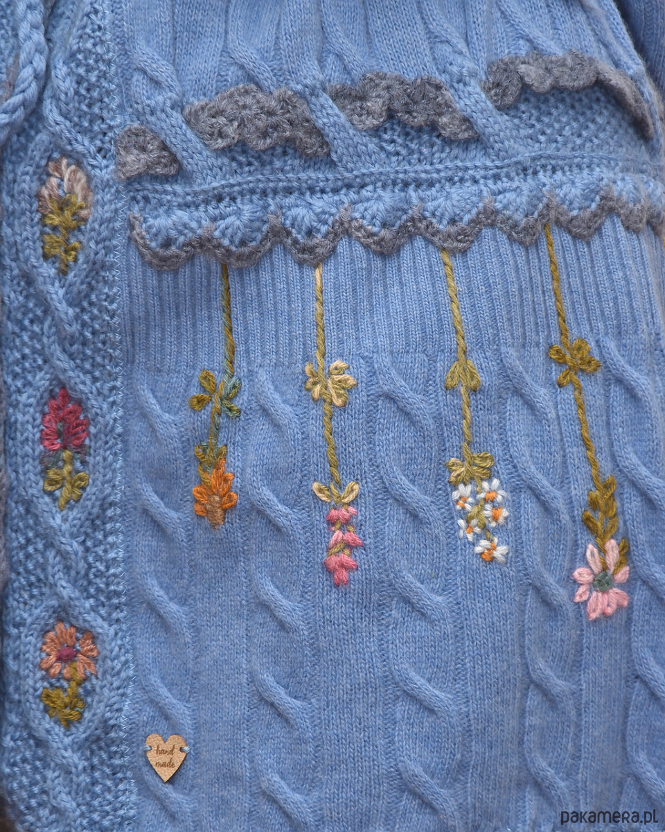 Niebieski kardigan z haftowanymi ręcznie motywami kwiatowymi, wykonany z sercem.