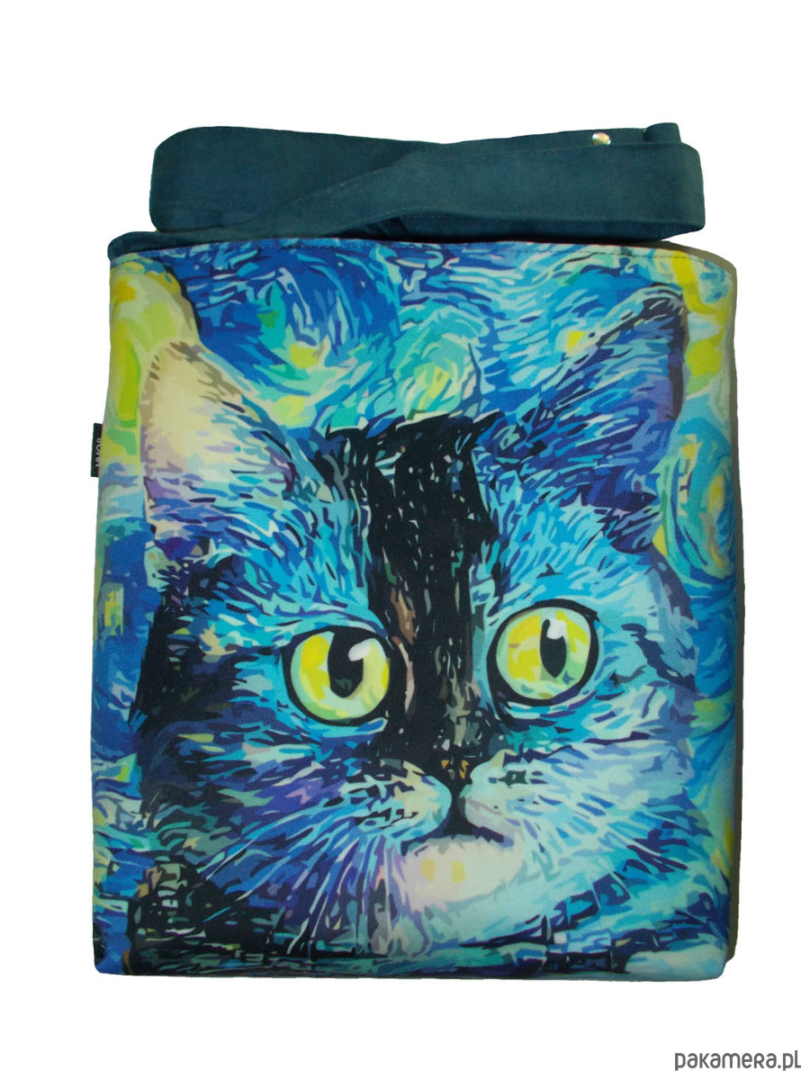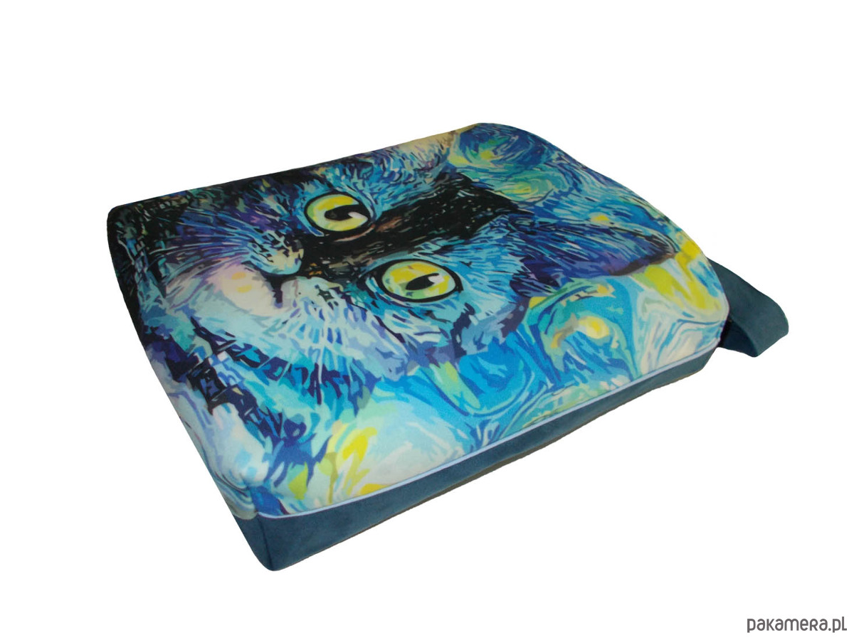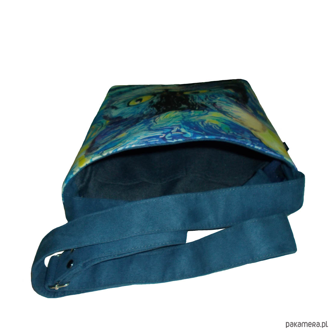 Autorska torba z usztywnionego eko zamszu, zapinana na zamek. Przód z weluru tapicerskiego. Pasek regulowany. Tył w korze paska (niebieski) Torba trzyma fason. Wewnątrz dwie kieszenie - jedna na zamek, druga z miejscem na telefon i coś jeszcze. W szwach wypustka. Denko poszerzone. szerokość 32cm wysokość 30cm plus denko 8cm