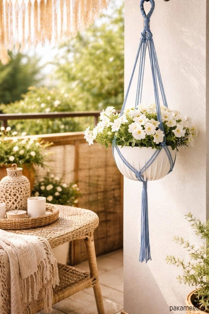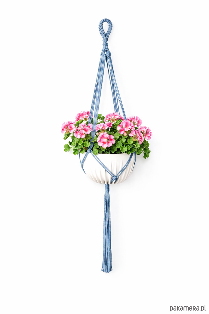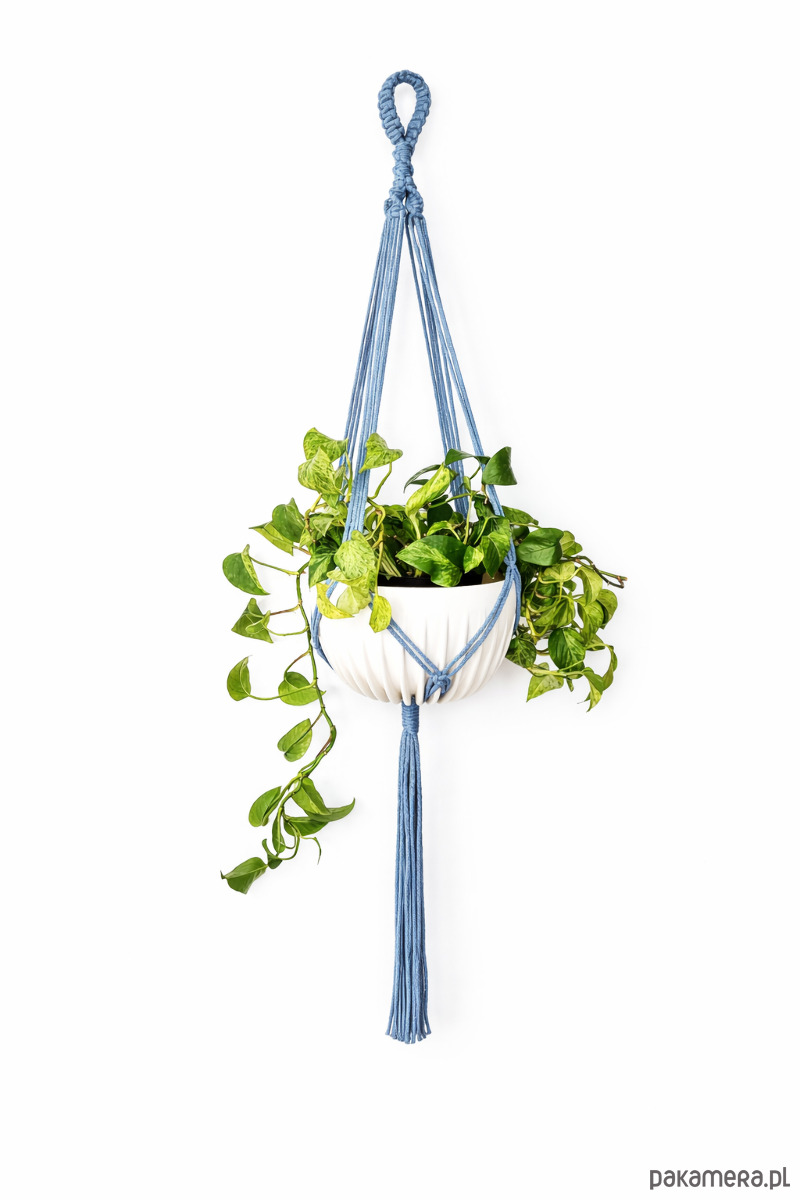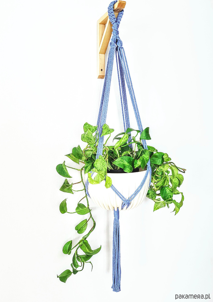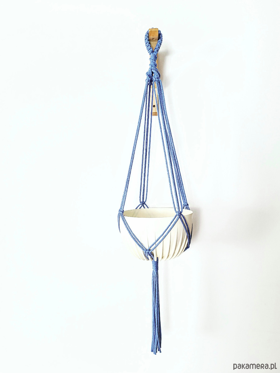 Niebieski kwietnik wiszący, makrama na doniczkę, dekoracja DOM/TARAS