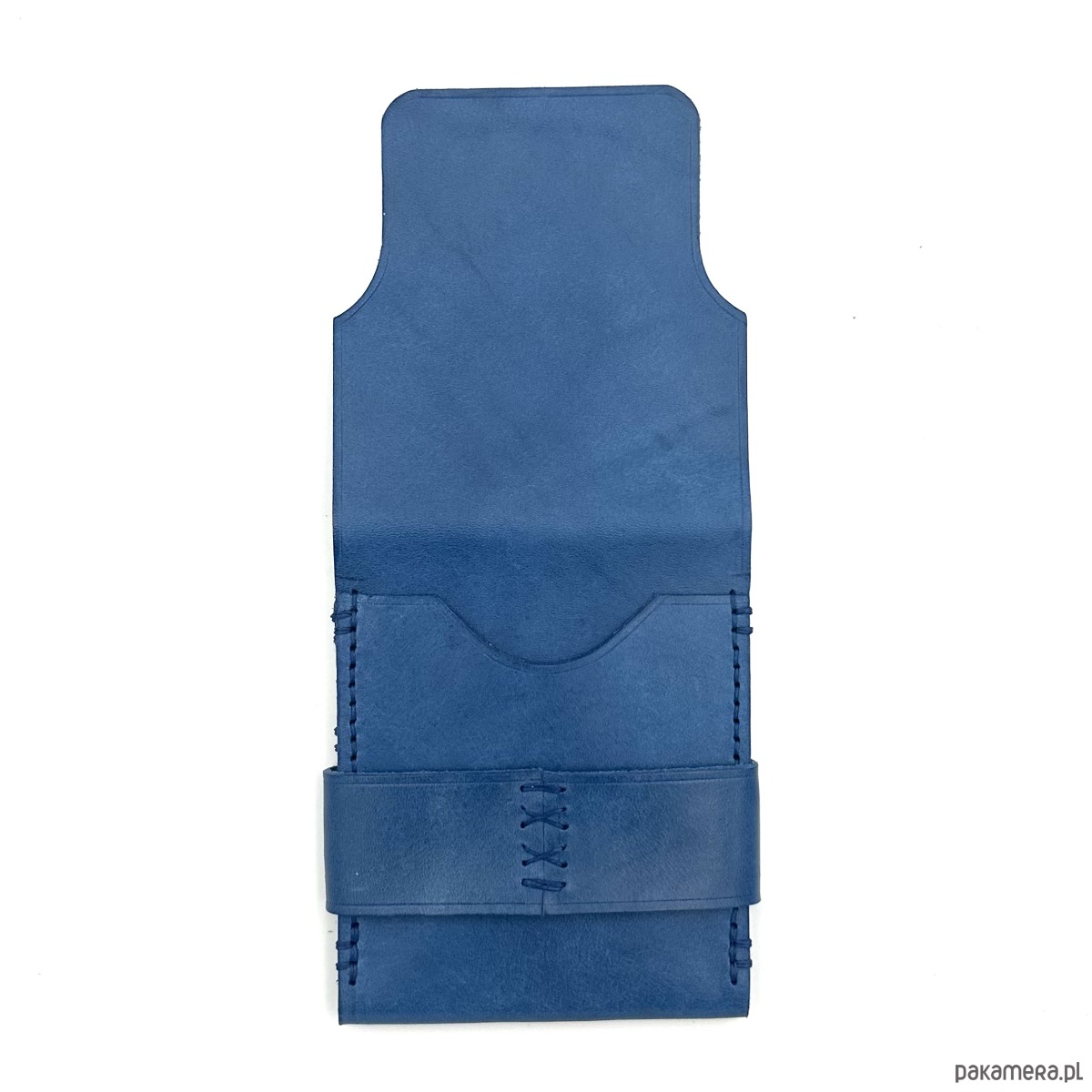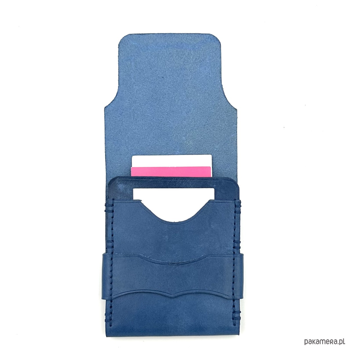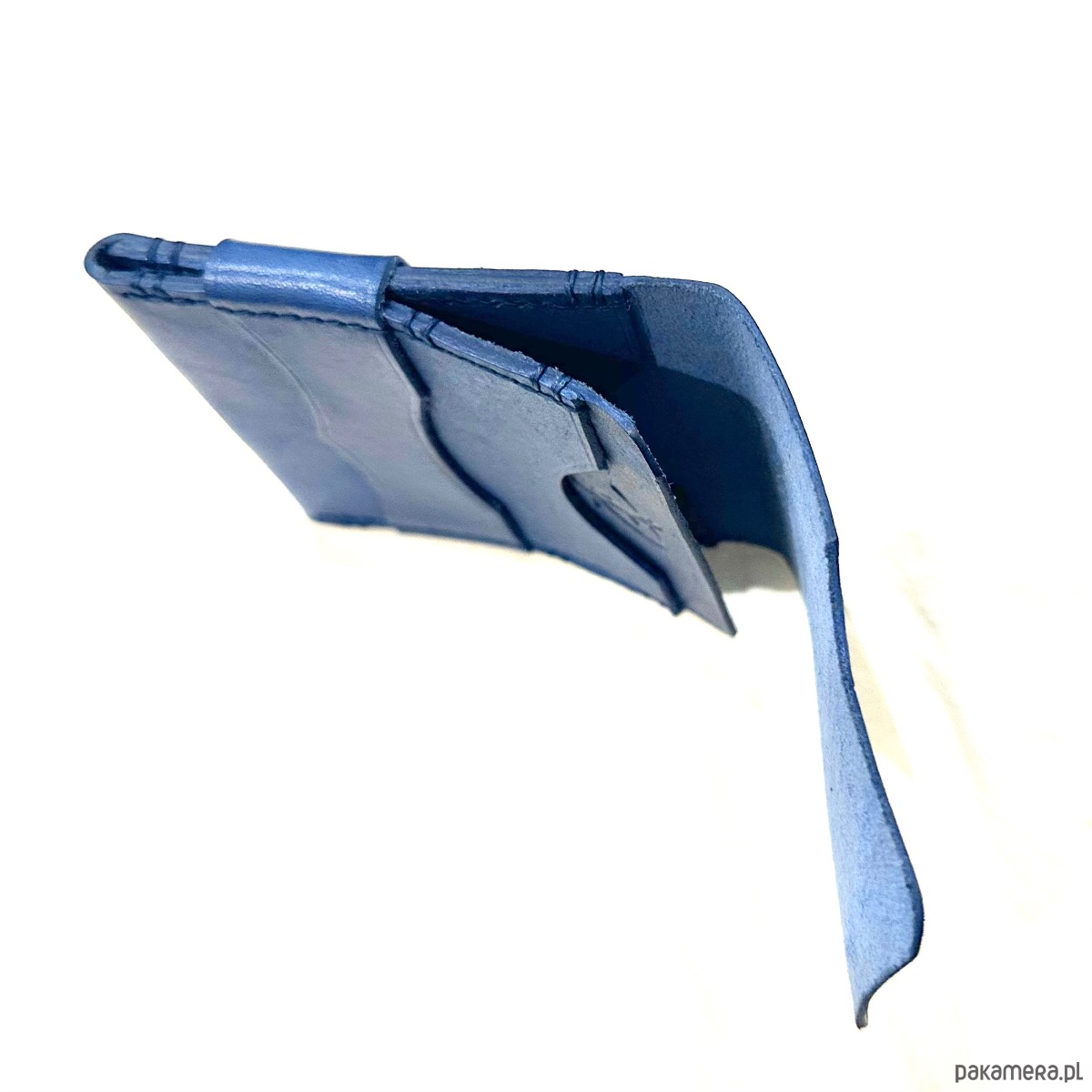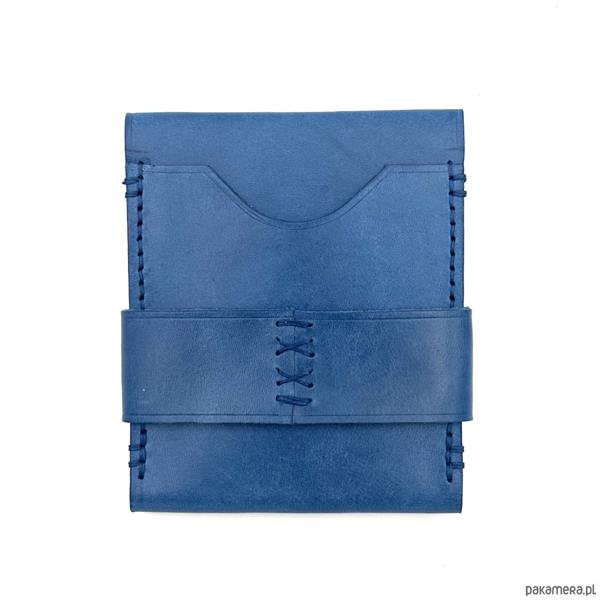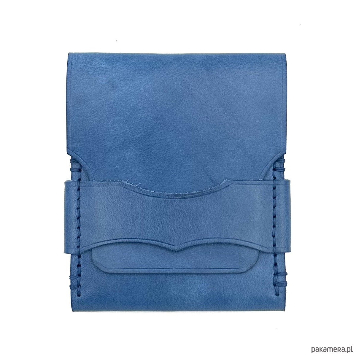 Niebieski portfel skórzany z klapką na karty ręcznie uszyty.