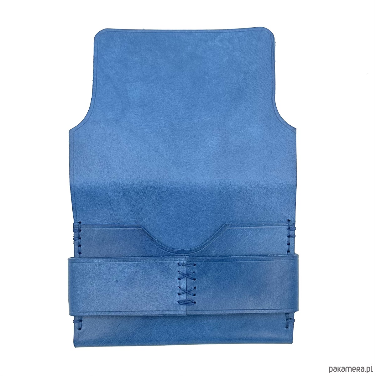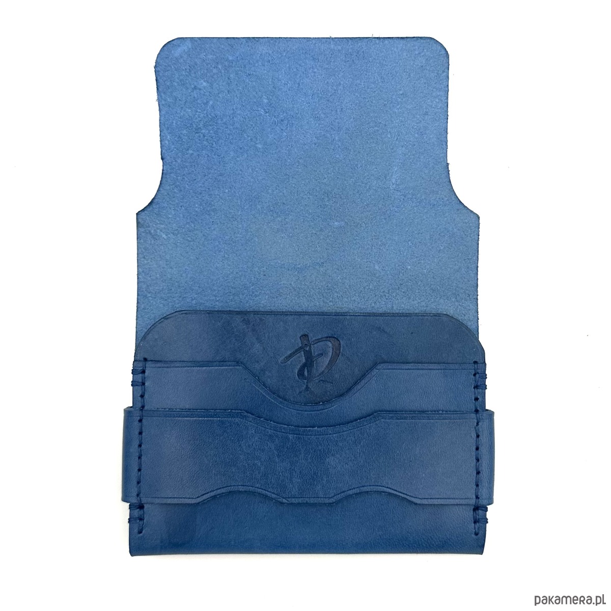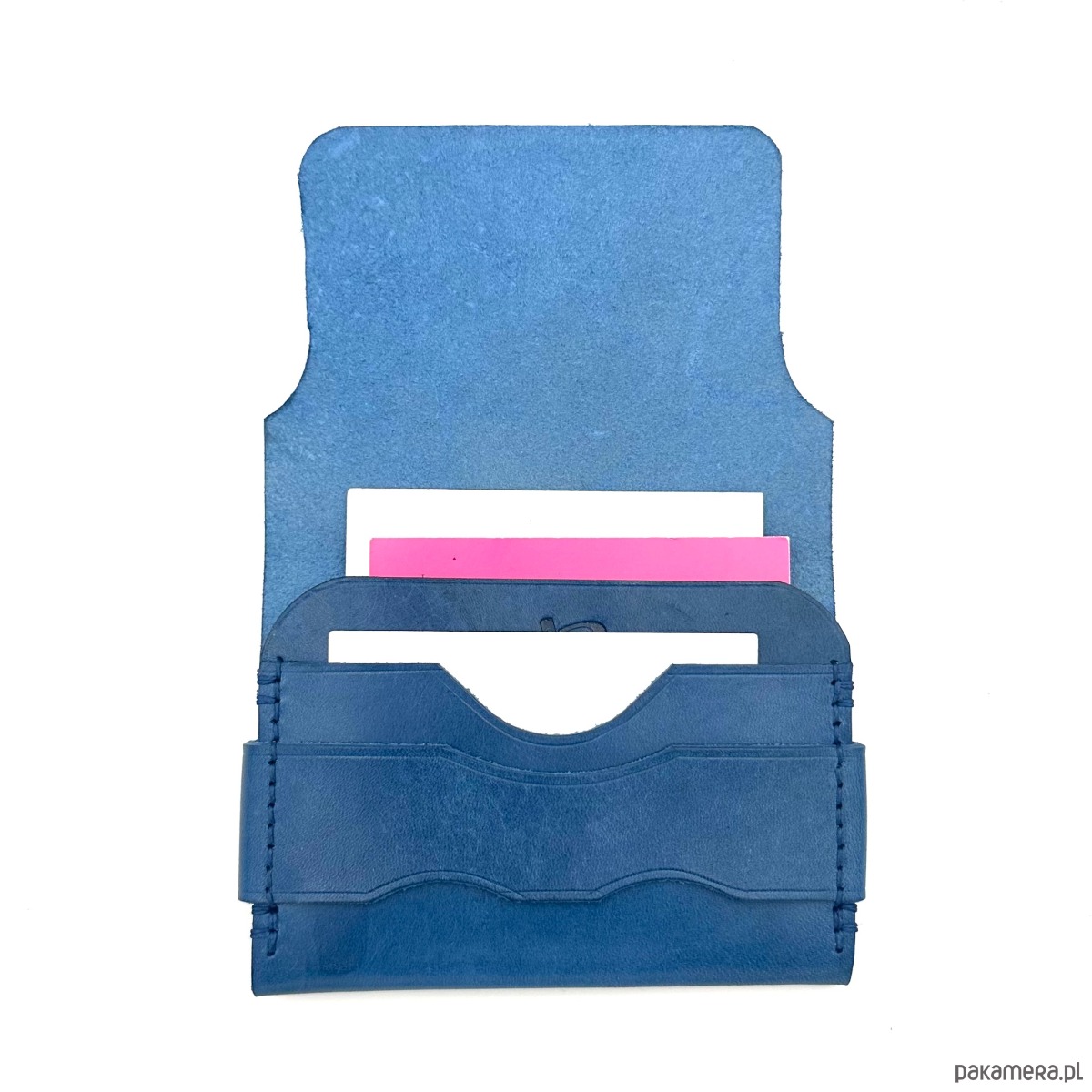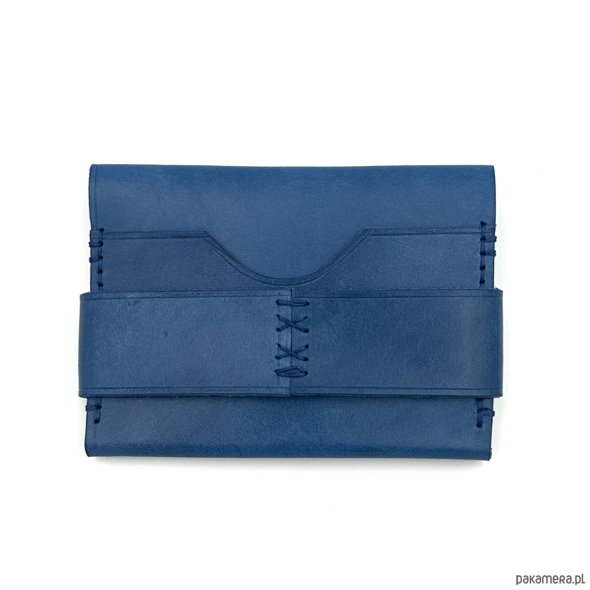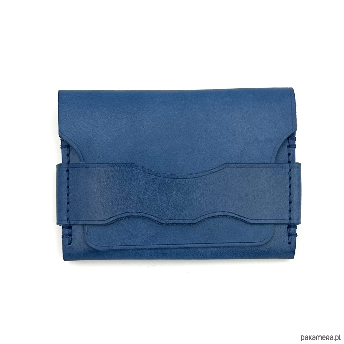 Niebieski portfel skórzany z klapką ręcznie uszyty na karty.