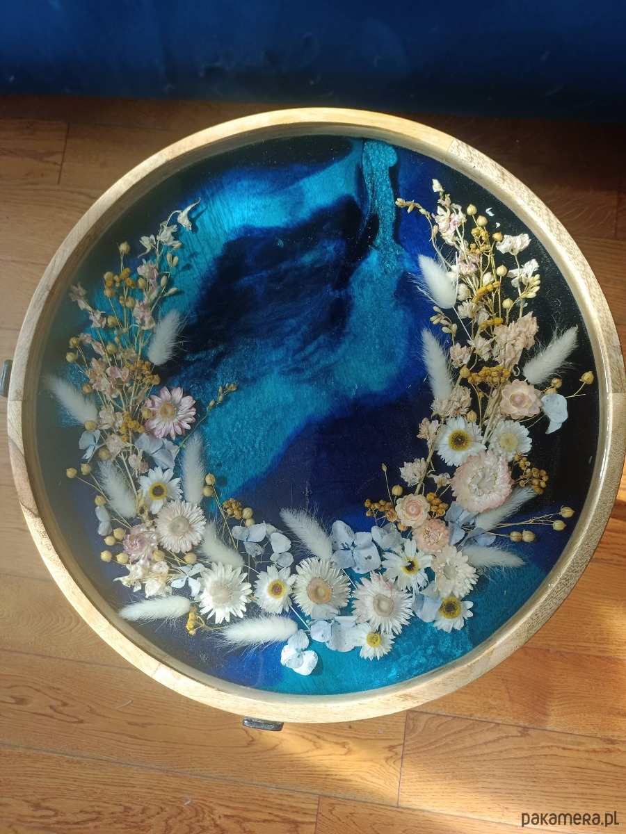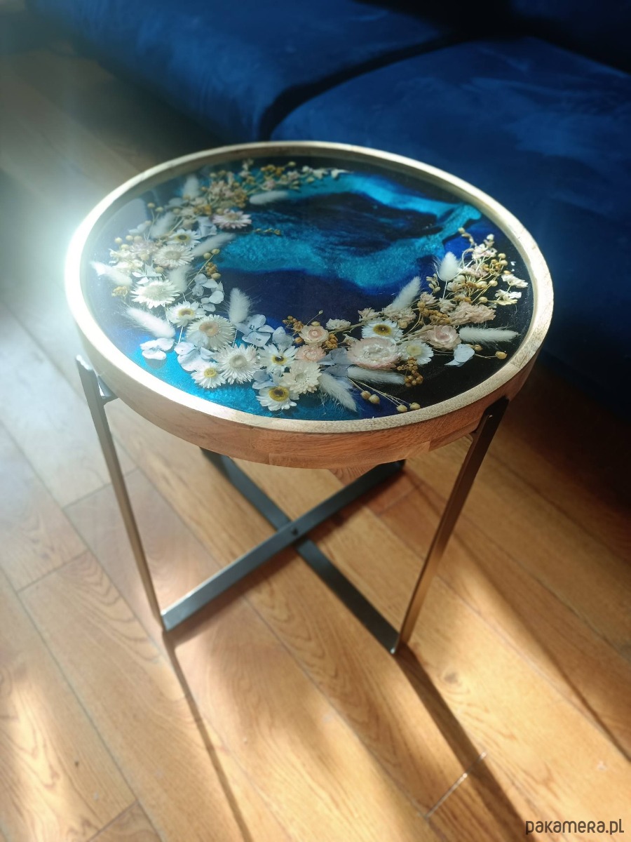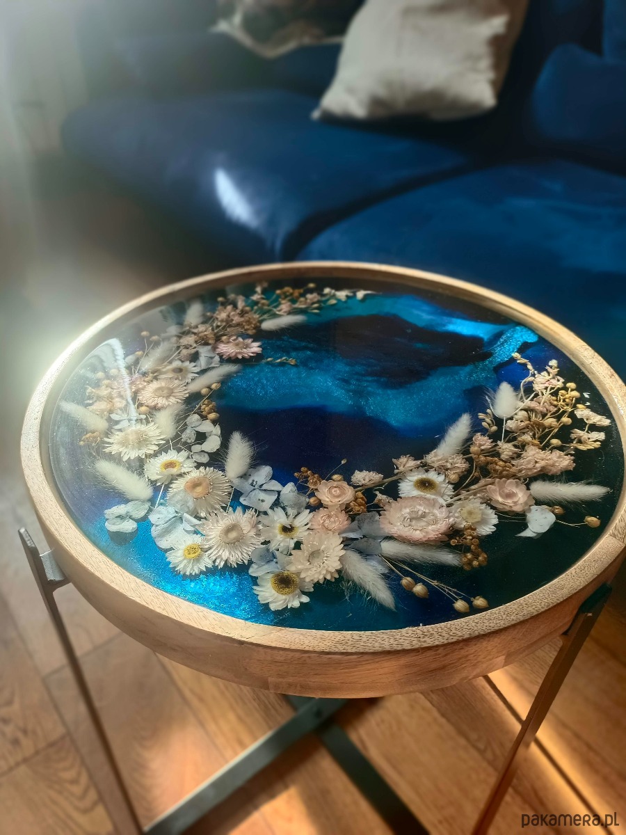 Kompozycja stolika tworzona jest indywidualnie po akceptacji zamówienia – masz wpływ na odcień niebieskiego tła, dobór kwiatów (kocanki, len, lagurus) oraz ich ułożenie. Czas realizacji wynosi około 2 tygodni – to czas potrzebny na staranne wykonanie kompozycji i prawidłowe utwardzenie warstw żywicy.