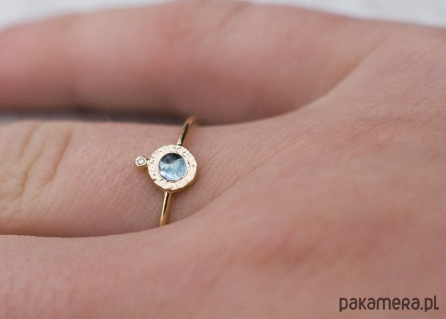 Cudowny, delikatny pierścionek z jasno-niebieskim topazem i brylantem w złocie próby 585.