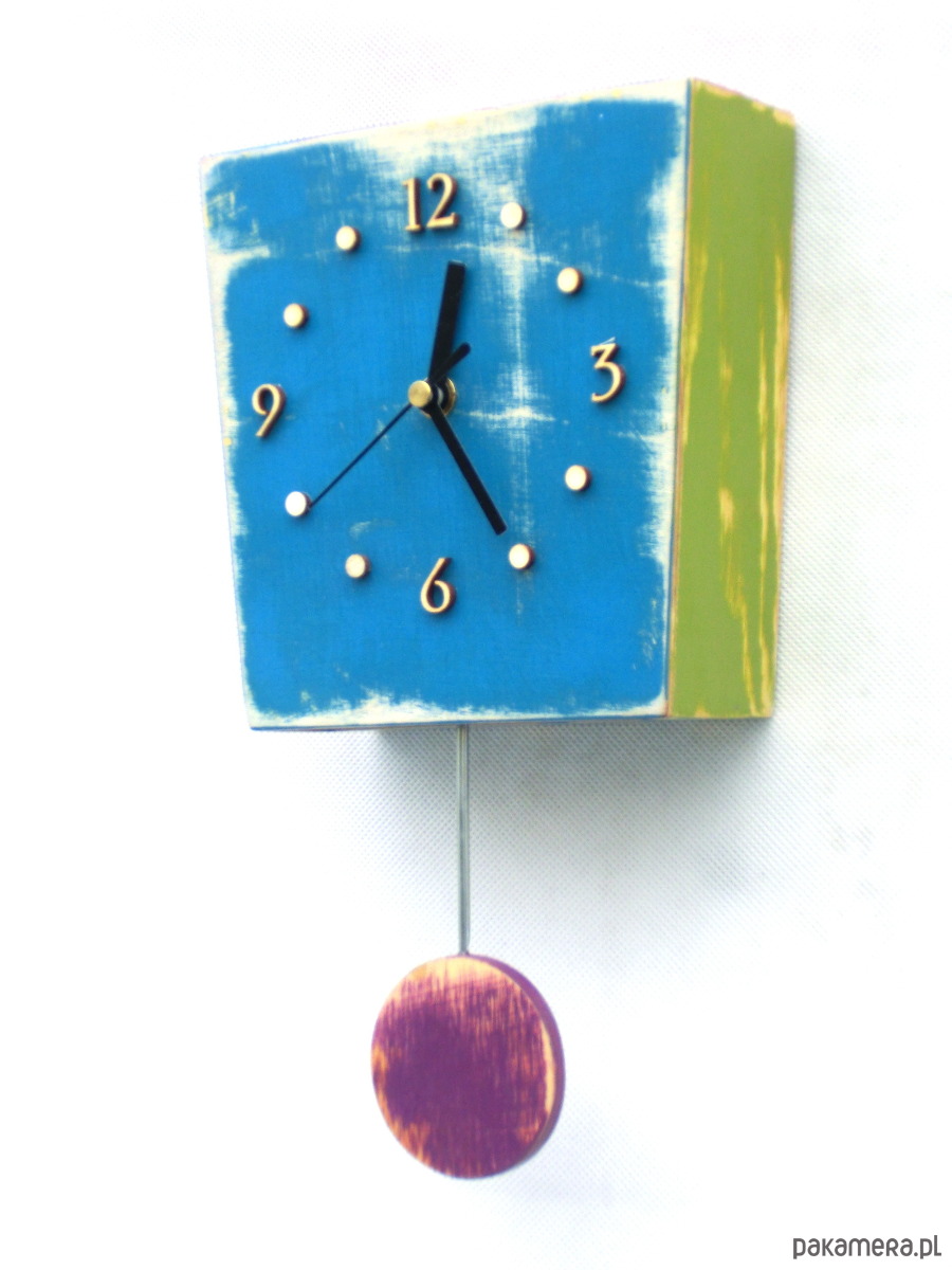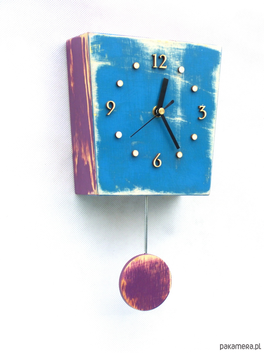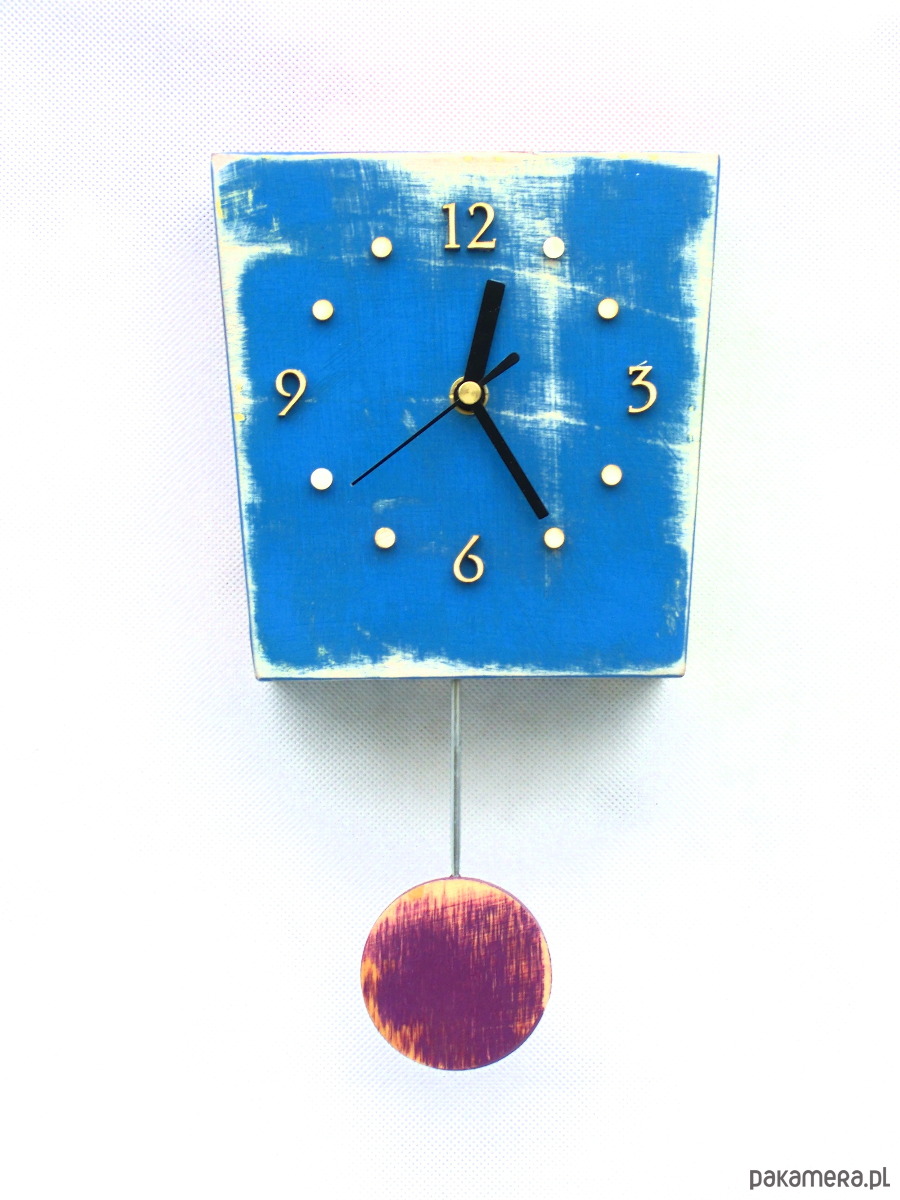 Niebieski zegar z wahadłem, rustykalny zegar z drewna - multikolor