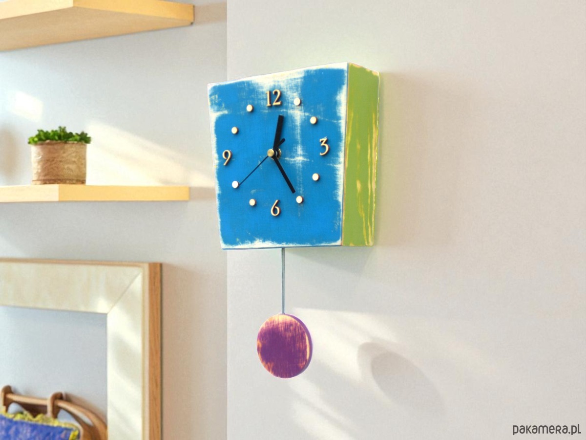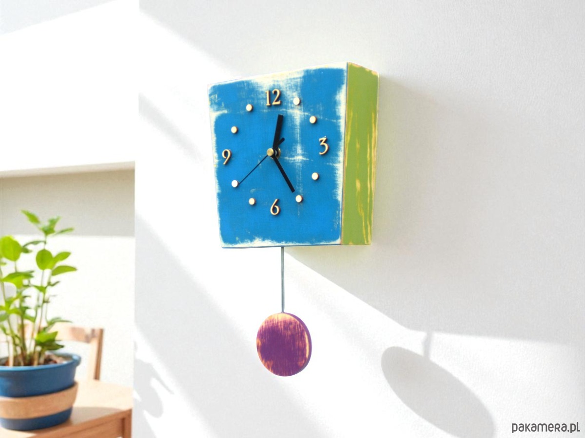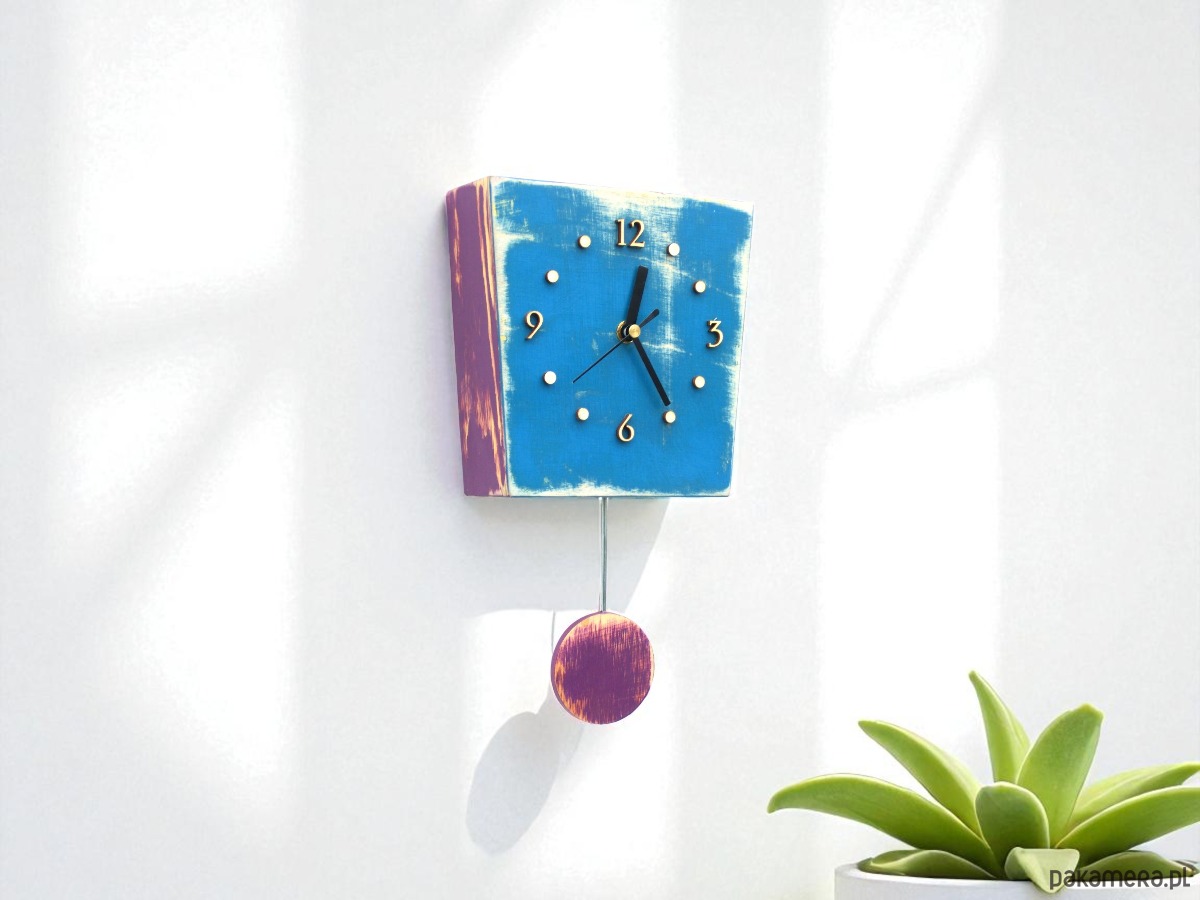 Niebieski zegar z wahadłem, rustykalny zegar z drewna - multikolor