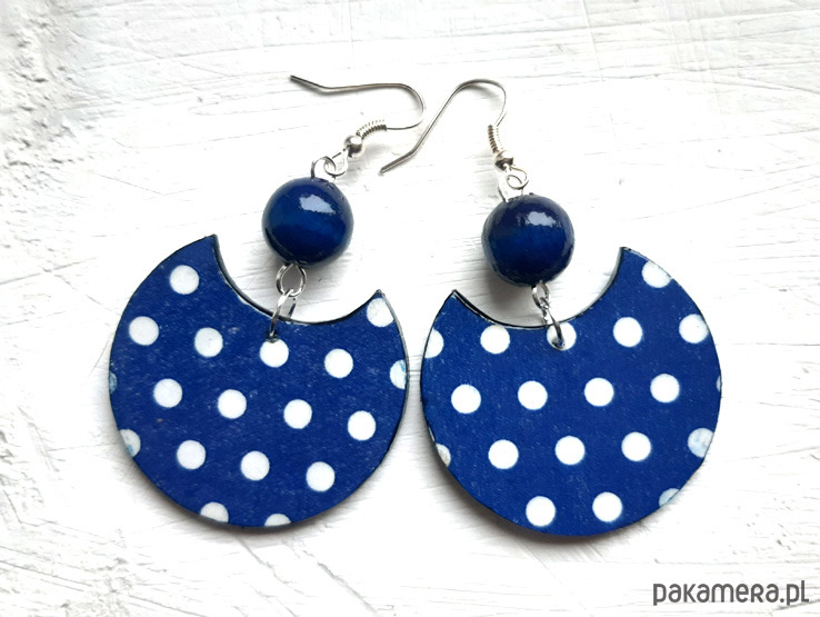 kolczyki drewniane, ozdobione metodą decoupage, dwustronne, starannie wykończone farbami akrylowymi i zabezpieczone wielokrotnie lakierem, koraliki drewniane, bigle posrebrzane, długość kolczyków bez bigli: 5 cm, średnica: 4 cm, bardzo lekkie