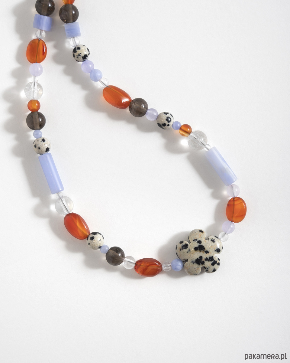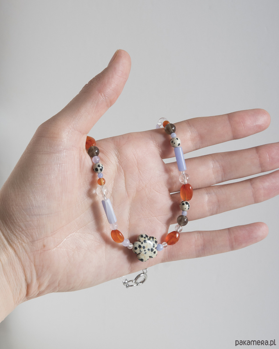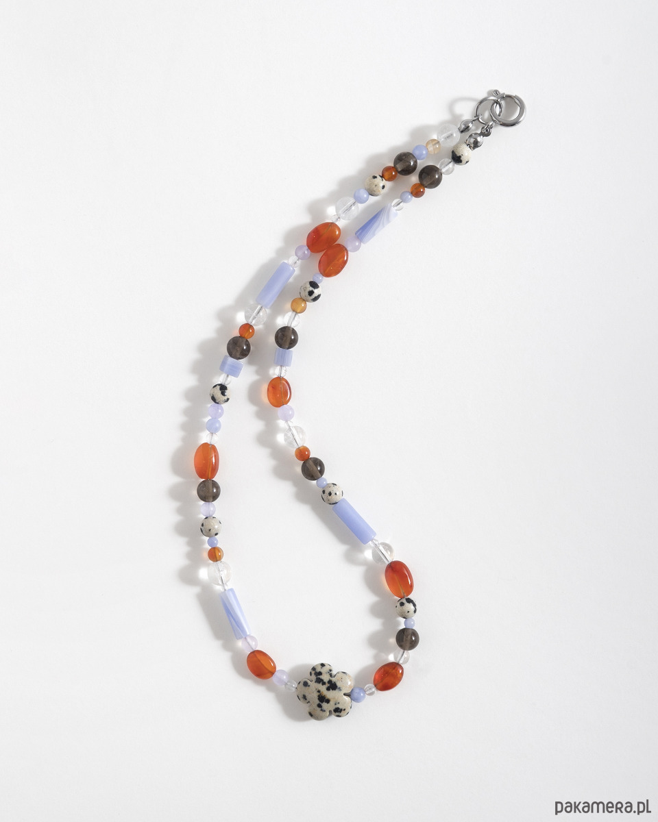 Ręcznie wykonany naszyjnik z naturalnych kamieni w tonacji niebiesko-pomarańczowej. Kompozycję dopełnia kwiat z jaspisu dalmatyńskiego, nadający całości charakteru. Wszystkie srebrne elementy wykonane są ze stali chirurgicznej.