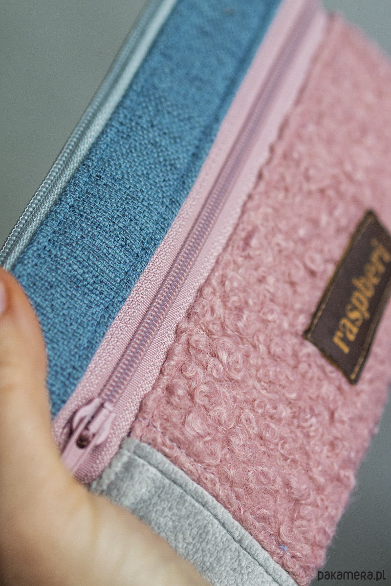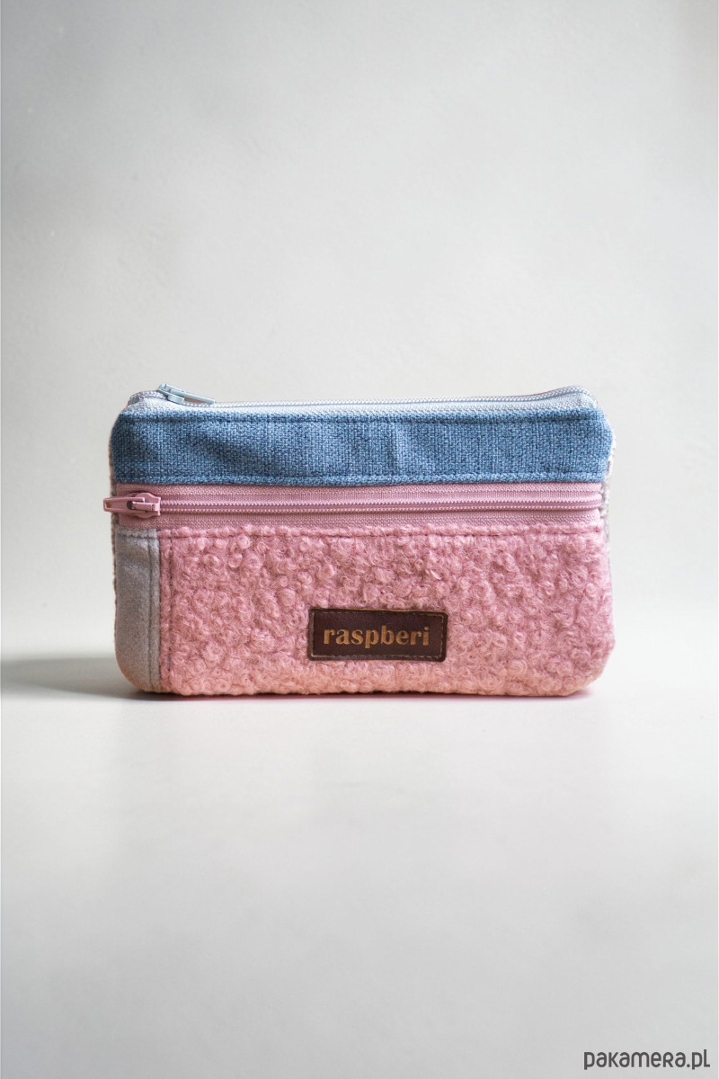 Prosty wodoodporny portfel wykonany z kilku rodzajów tkanin w odcieniach szarości i różu i błękitu. Jest to jedyny egzemplarz, unikat.