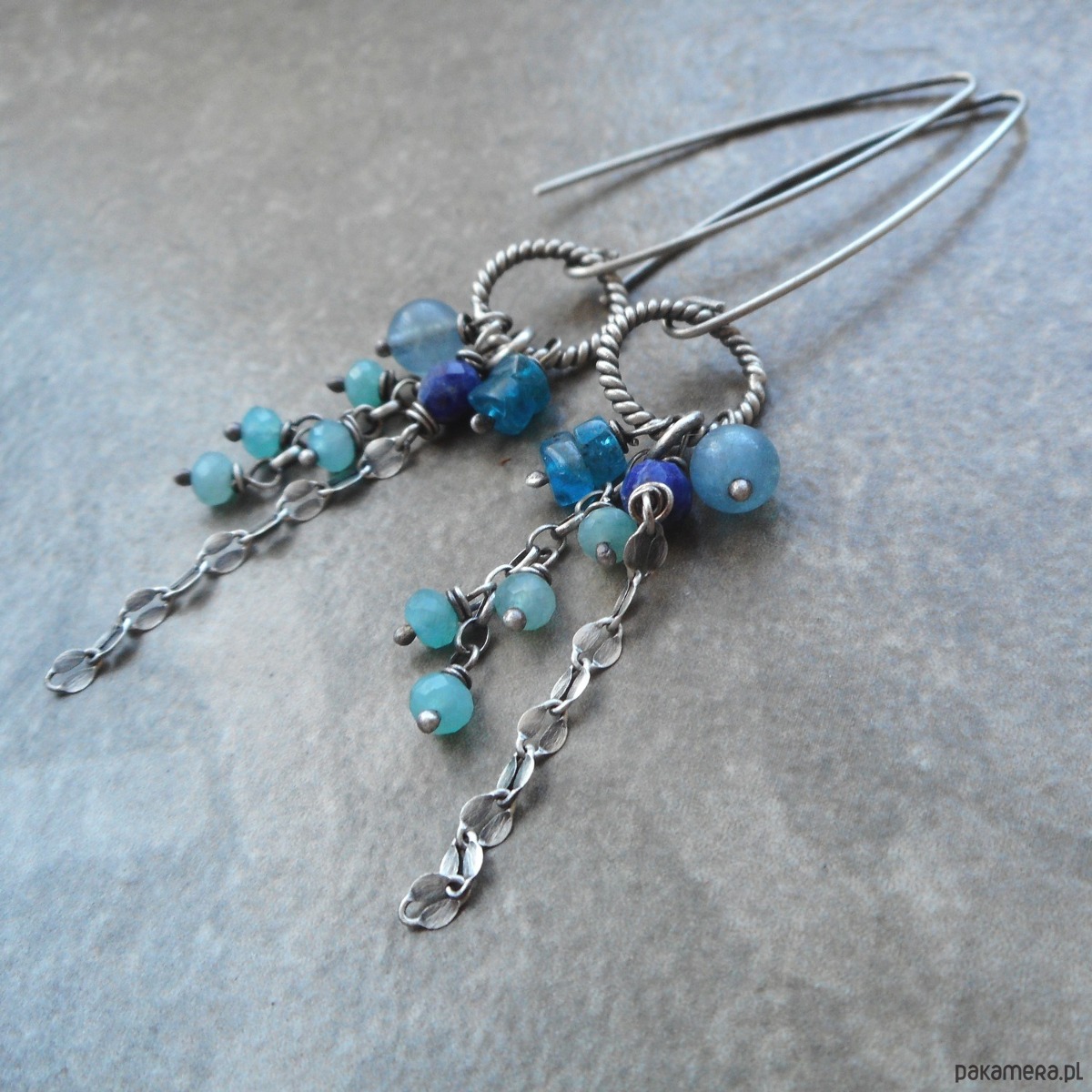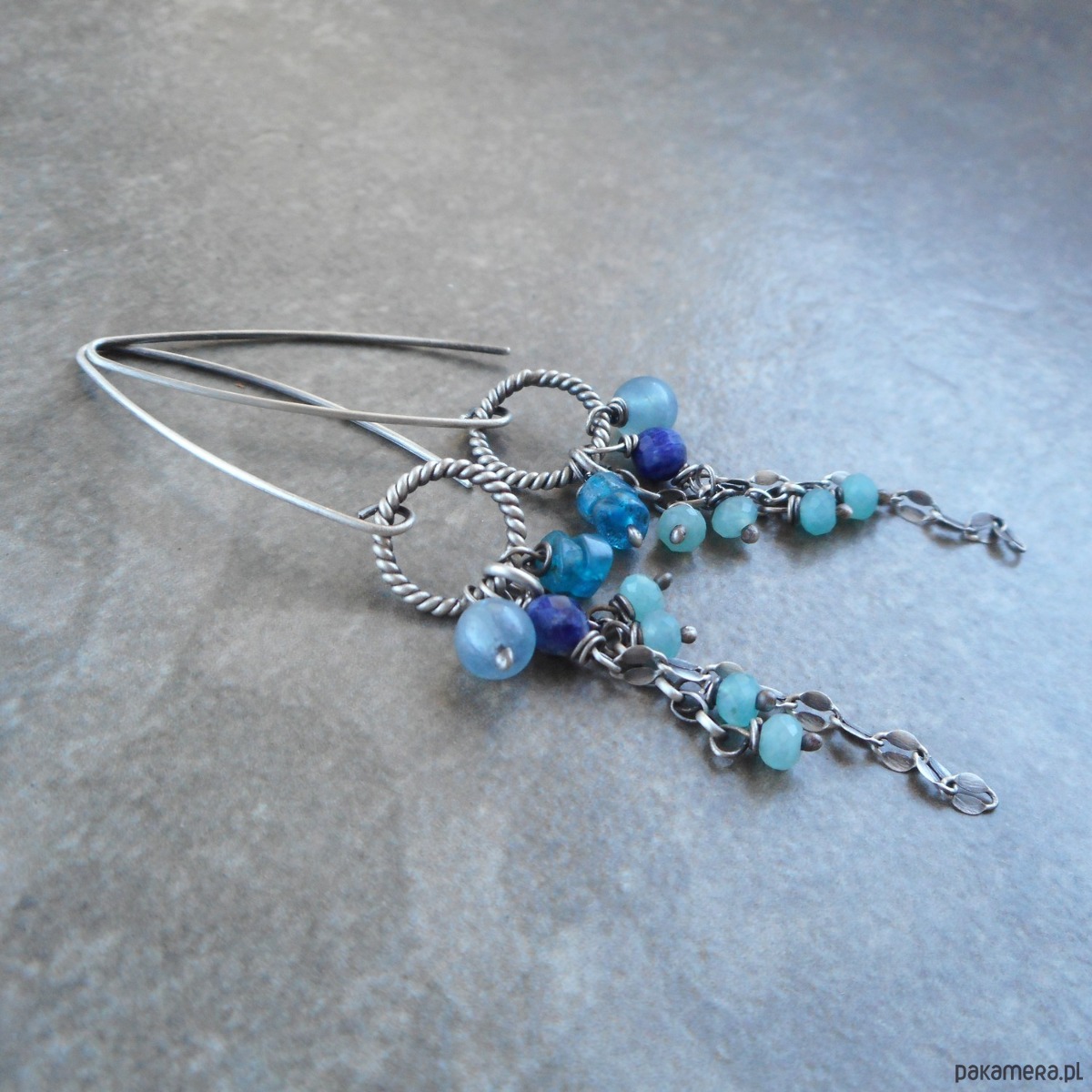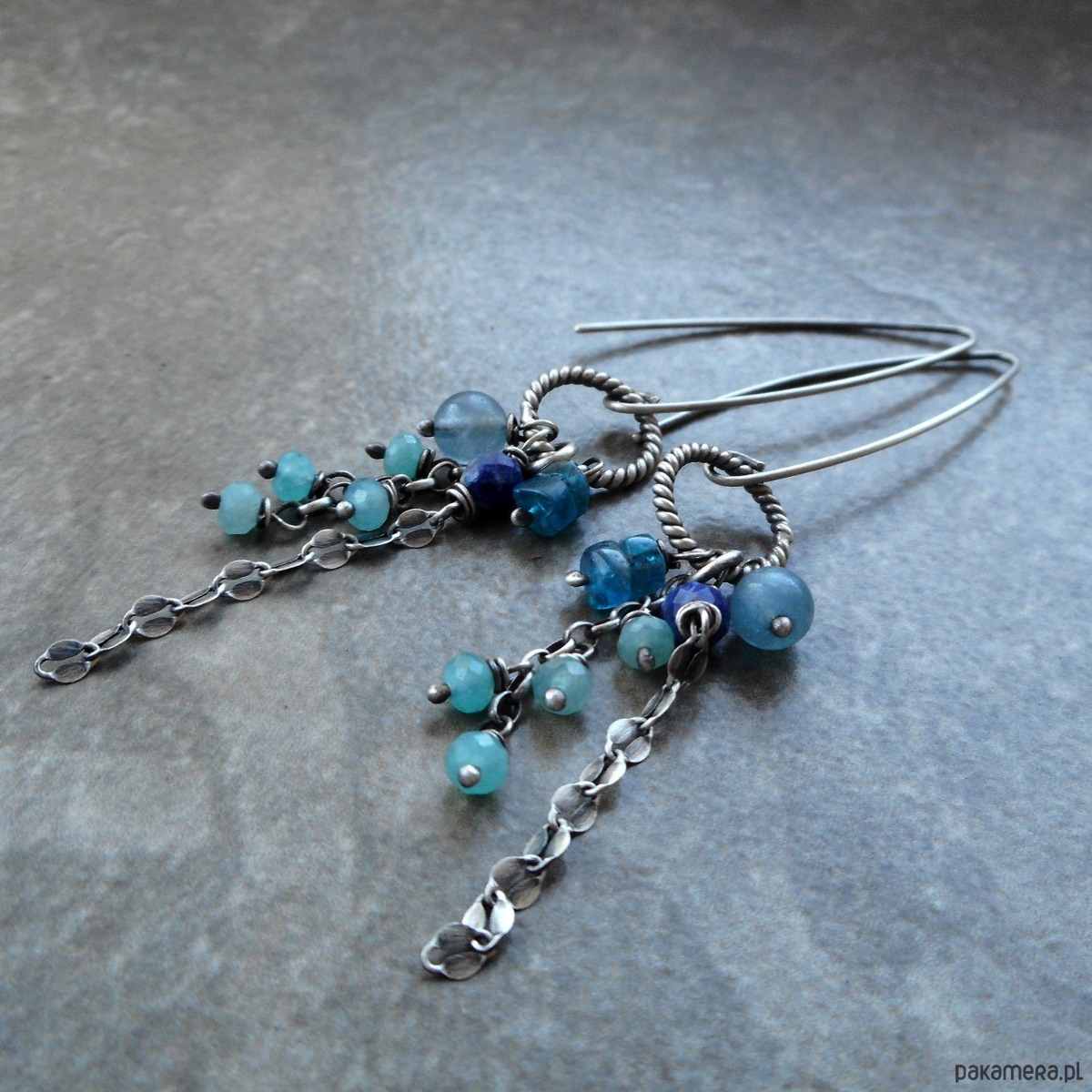 Kolczyki z kamieni naturalnych i szlachetnego srebra; lekkie, zwiewne gałązki ozdobione drobnymi minerałami w niebieskich odcieniach.