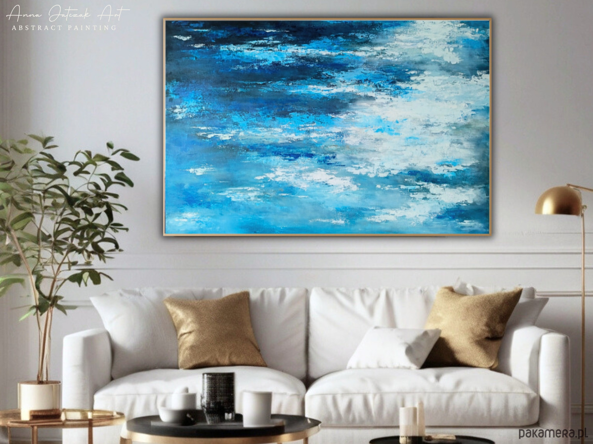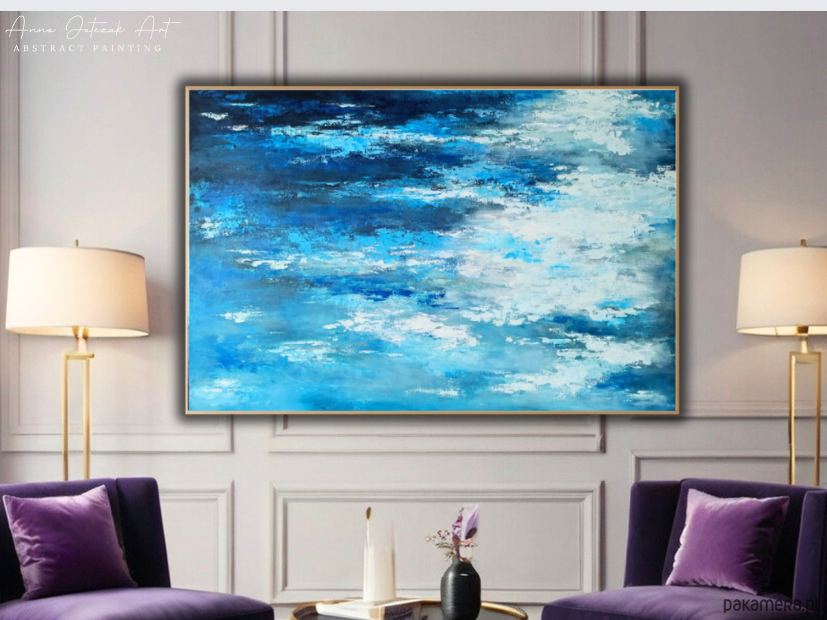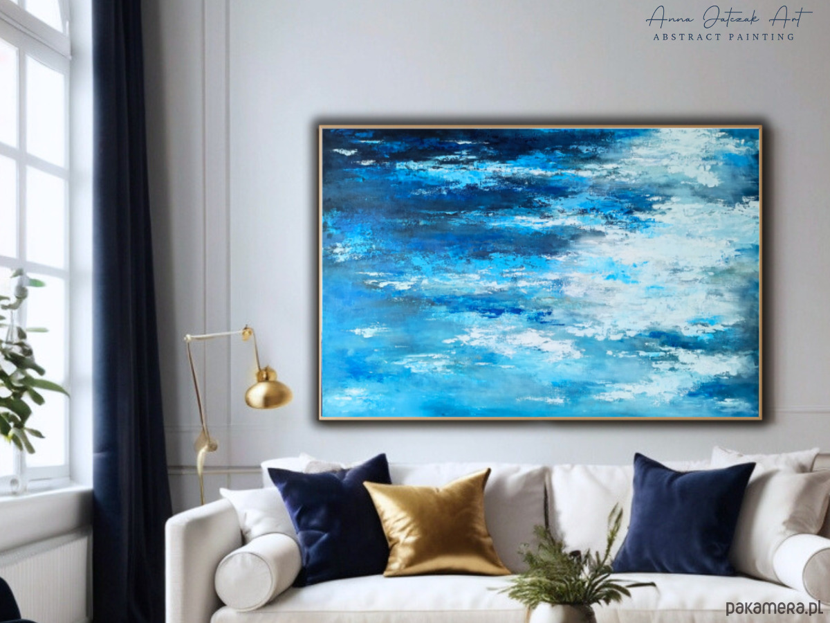 Oryginalny, ręcznie malowany obraz akrylowy przedstawiający niebo w odcieniach granatu, błękitu, bieli i szarości. Wyrazista faktura nadaje mu elegancki, luksusowy charakter. Zainspirowany nieskończonością nieba, tworzy niezrównaną atmosferę harmonii. Doskonały wybór do nowoczesnych wnętrz, salonów, sypialni lub biur, gdzie doda przestrzeni i stworzy relaksujący nastrój.