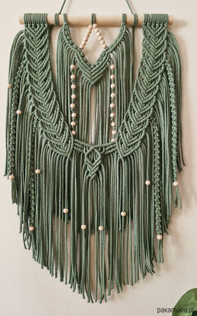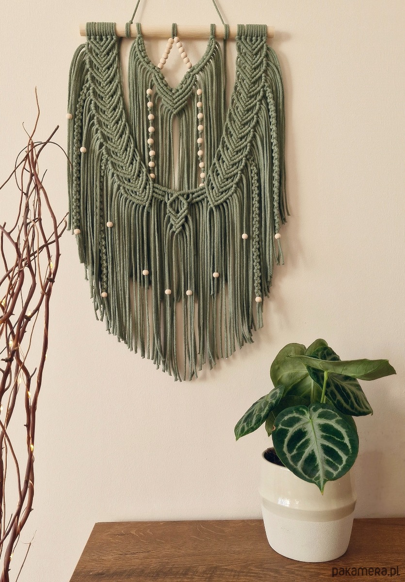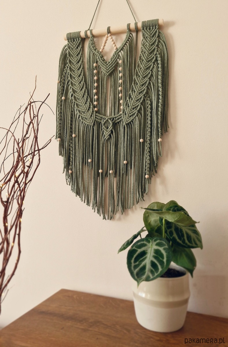 Ta delikatna,niewielka ścienna makrama w stylu boho wykonana ze sznurka bawełnianego w kolorze szałwii zdobiona drewnianymi koralami pięknie komponuje się z naturalnymi dodatkami i roślinami. Wprowadzi do Twojego mieszkania element w modnym stylu, ociepli klimat . Jeśli szukasz niebanalnego pomysłu na dekoracje ścienną - to właśnie znalazłeś produkt dla siebie. Makrama zawieszona jest na drewnianym kiju - profilu. Delikatny wzór wprowadzi do wnętrza odrobinę subtelności. Makrama świetnie współgra z drewnianymi meblami. Dodatkowo naturalny odcień zieleni świetnie wpasowuje się w obecne trendy wnętrzarskie. Jeśli chcesz zamówić makramę w innym kolorze - w galerii produktu umieściłam kartę kolorów. Wystarczy wybrać interesujący Pana/Panią odcień i podać go w uwagach do zamówienia.