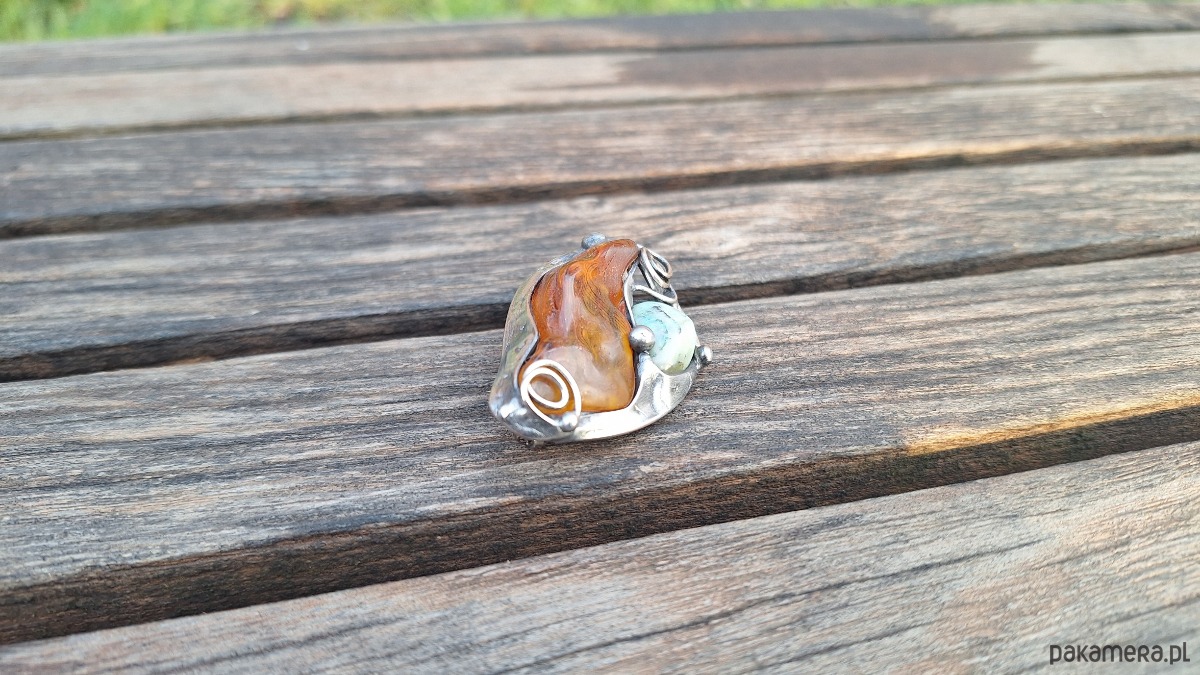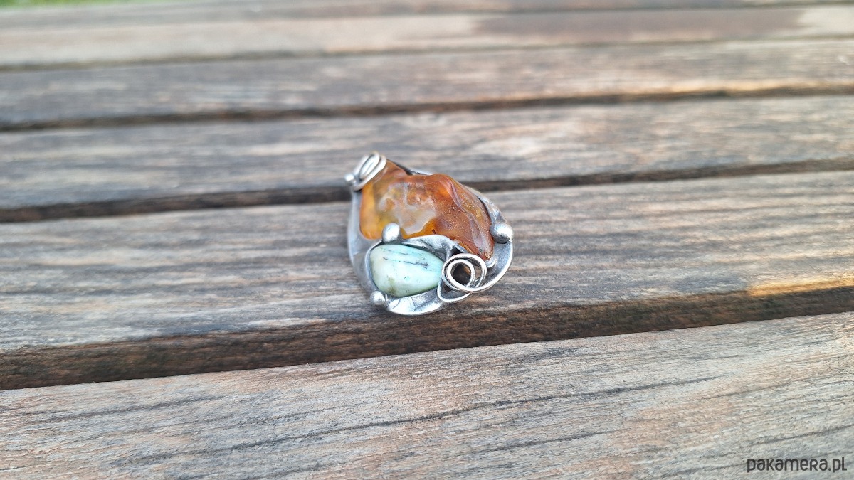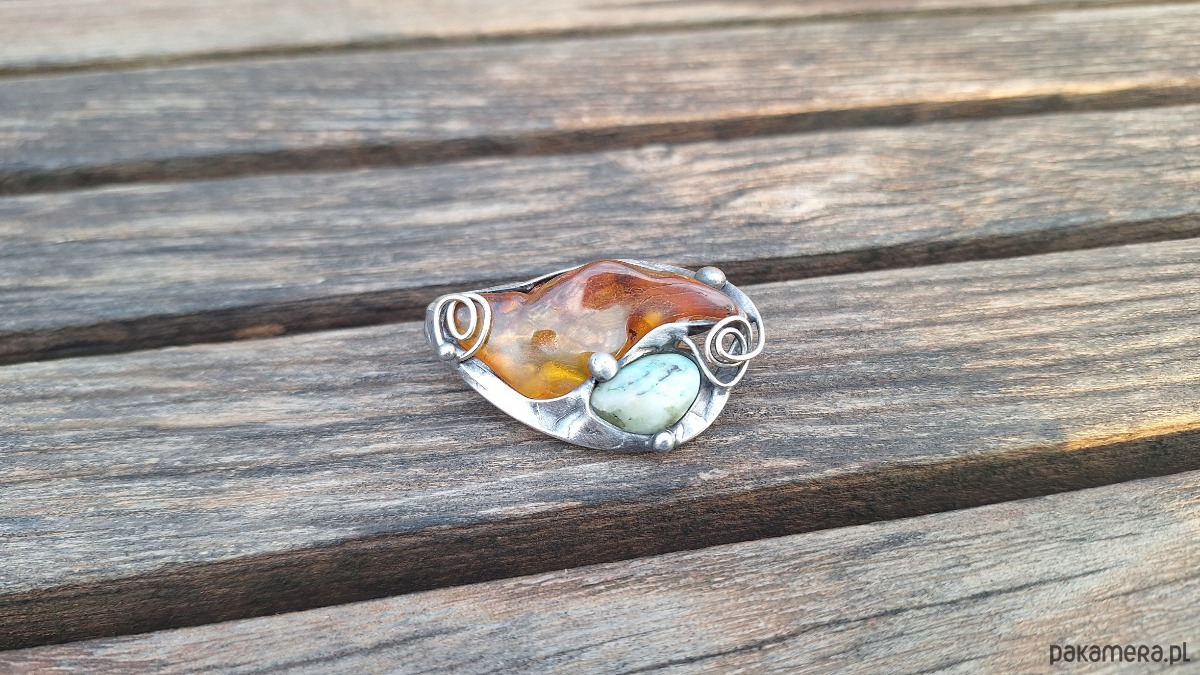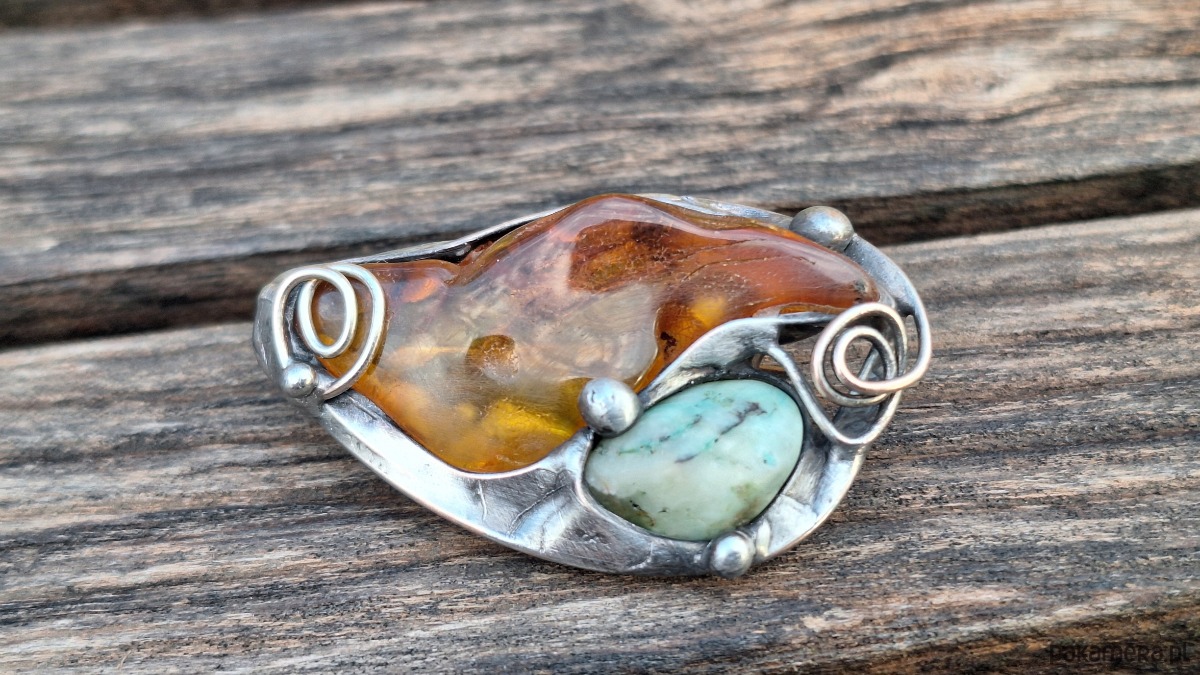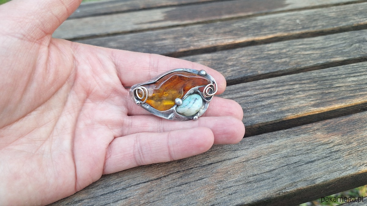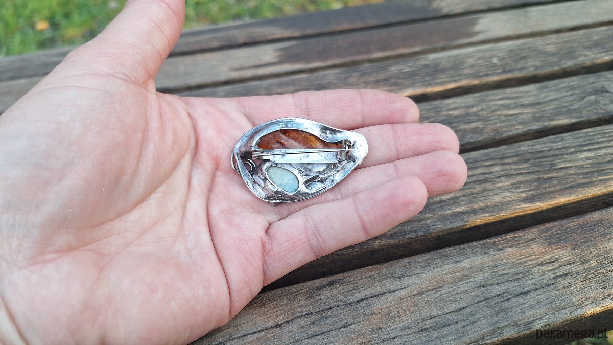 Broszka wykonana z miedzi, cyny, chryzoprazu i bursztynu. Wymiary ok. 4. 5 na 3 cm. Zapięcie metalowe.