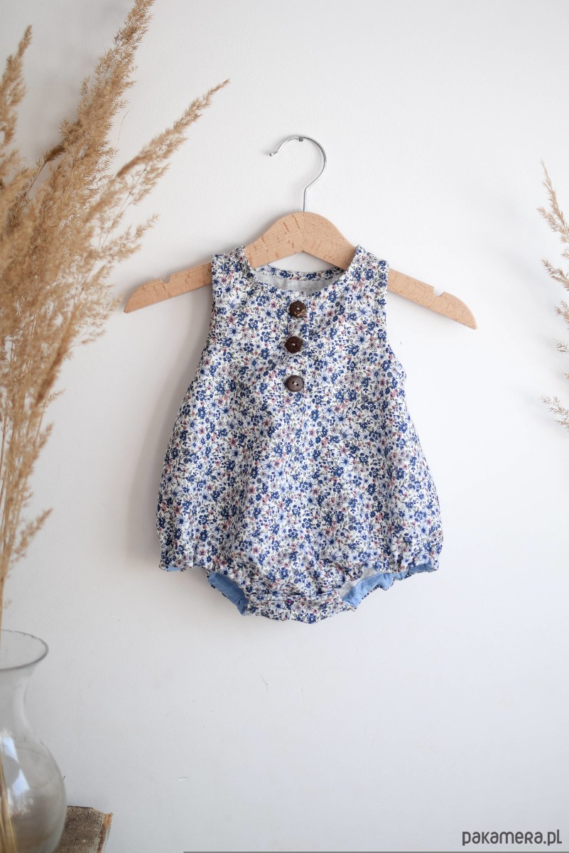 Piękny rampers, uszyty z bawełny organicznej w kwiatowy print. Idealny dla każdego maluszka. Sprawdzi się na każdą okazję. Zapinany z przodu na trzy guziki. Zapięcie w kroku na zatrzaski.
