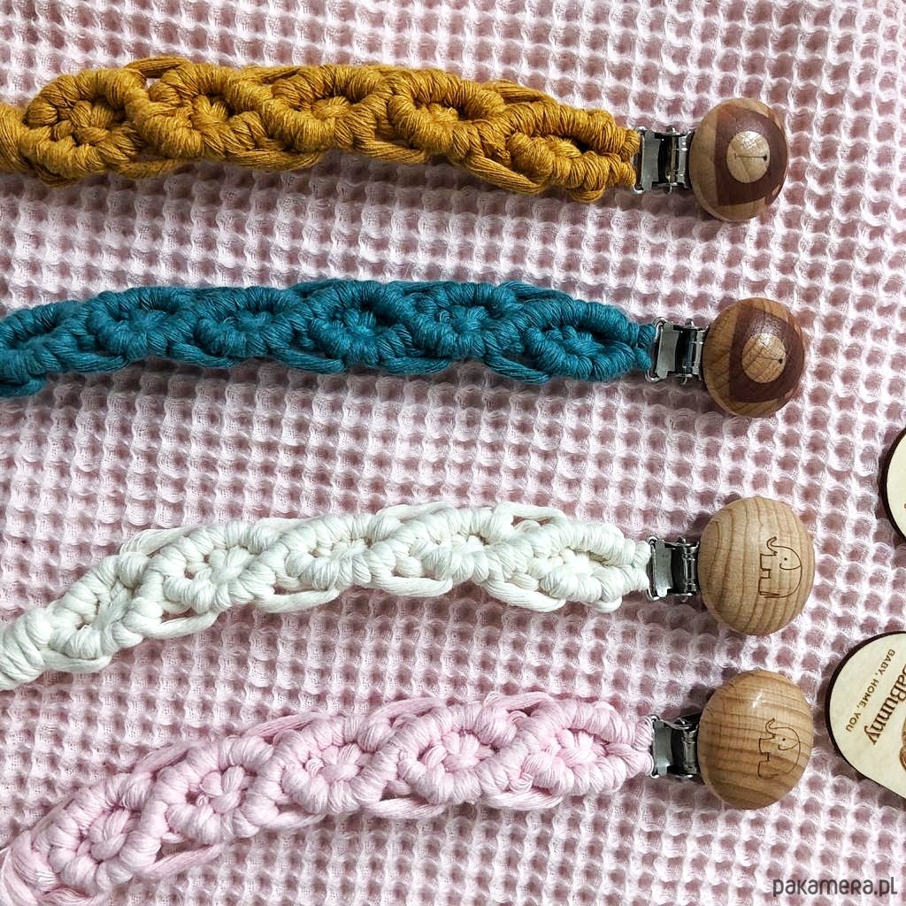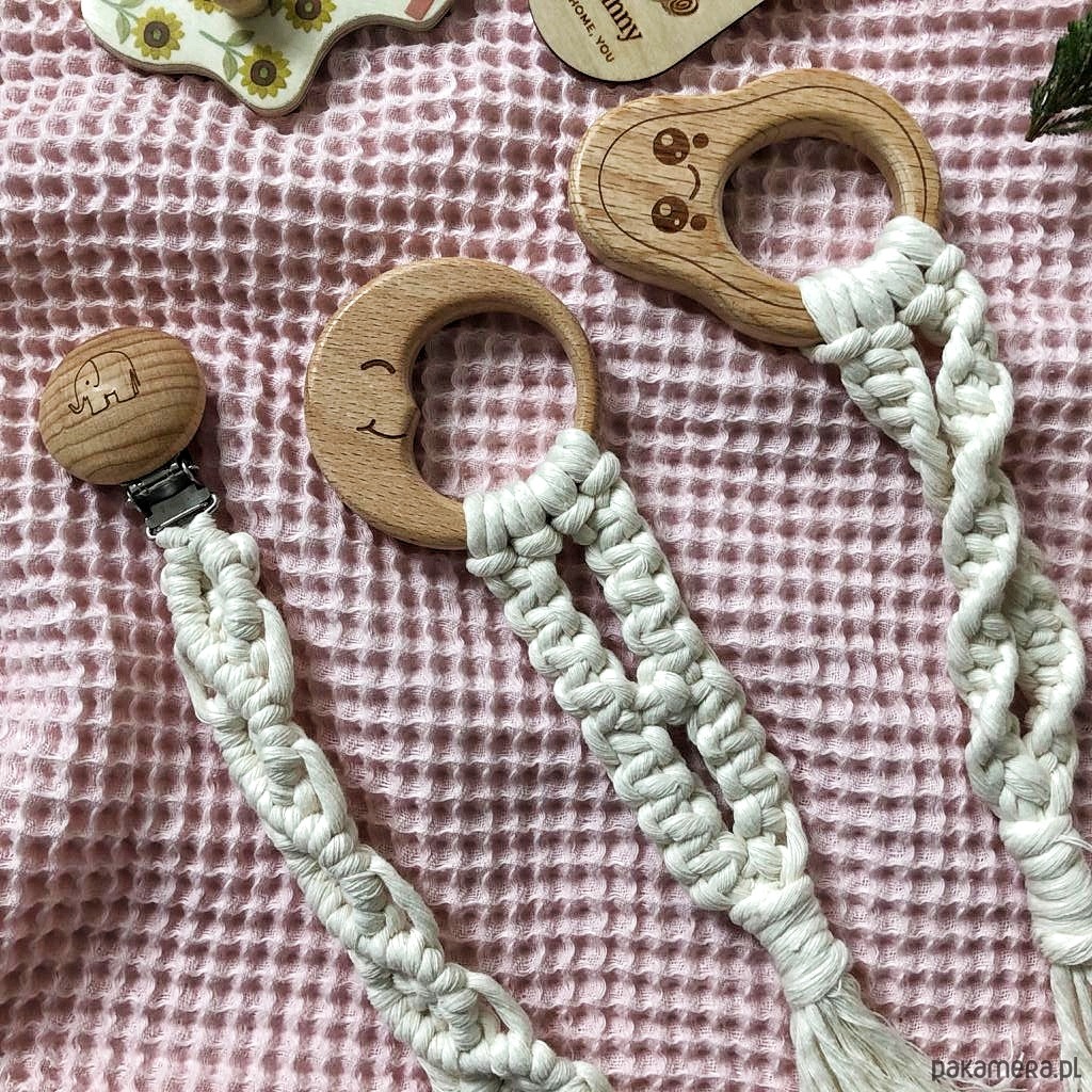 Praktyczna i urocza – taka jest drewniana zawieszka do smoczka ze słoniem. Ozdobiona starannie zaplecionymi sznurkami.