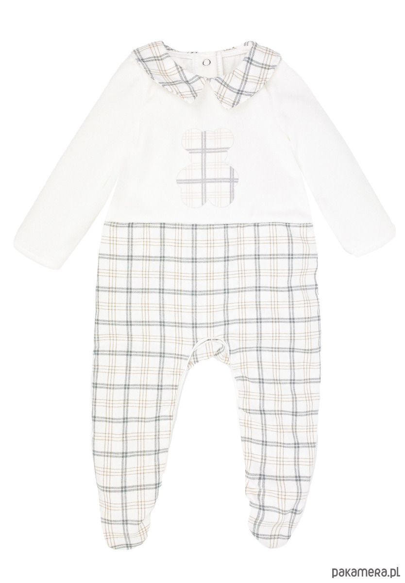Dół pajacyka jest wykonany z bawełnianego materiału ze wzorem w kratę, pasującym do kołnierzyka.