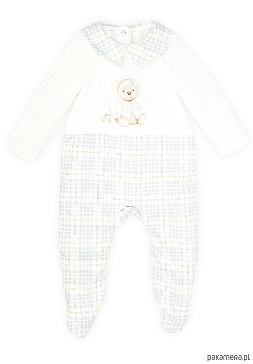 Dół pajacyka jest wykonany z bawełnianego materiału ze wzorem w kratę, pasującym do kołnierzyka.