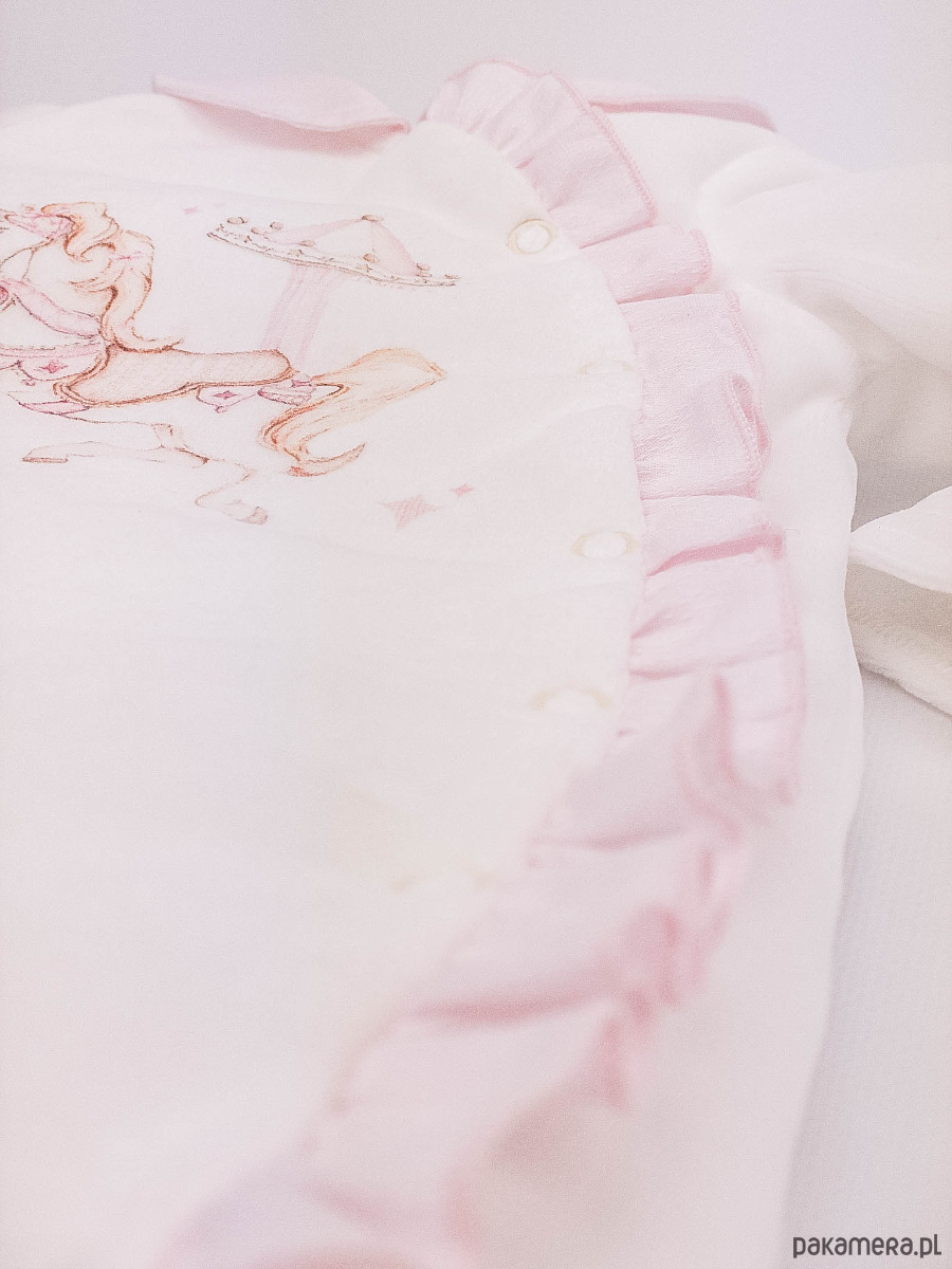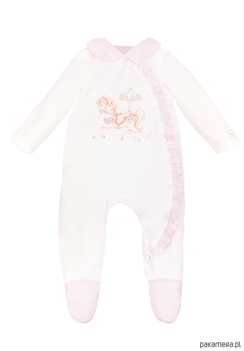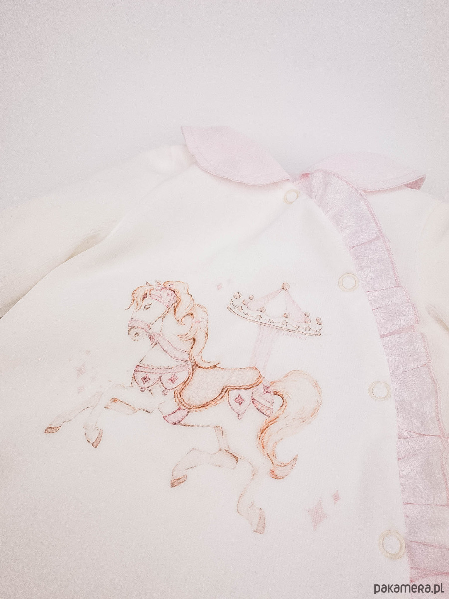 Niezwykle delikatny w dotyku pajacyk niemowlęcy zdobiony nadrukiem konika w stylu vintage.