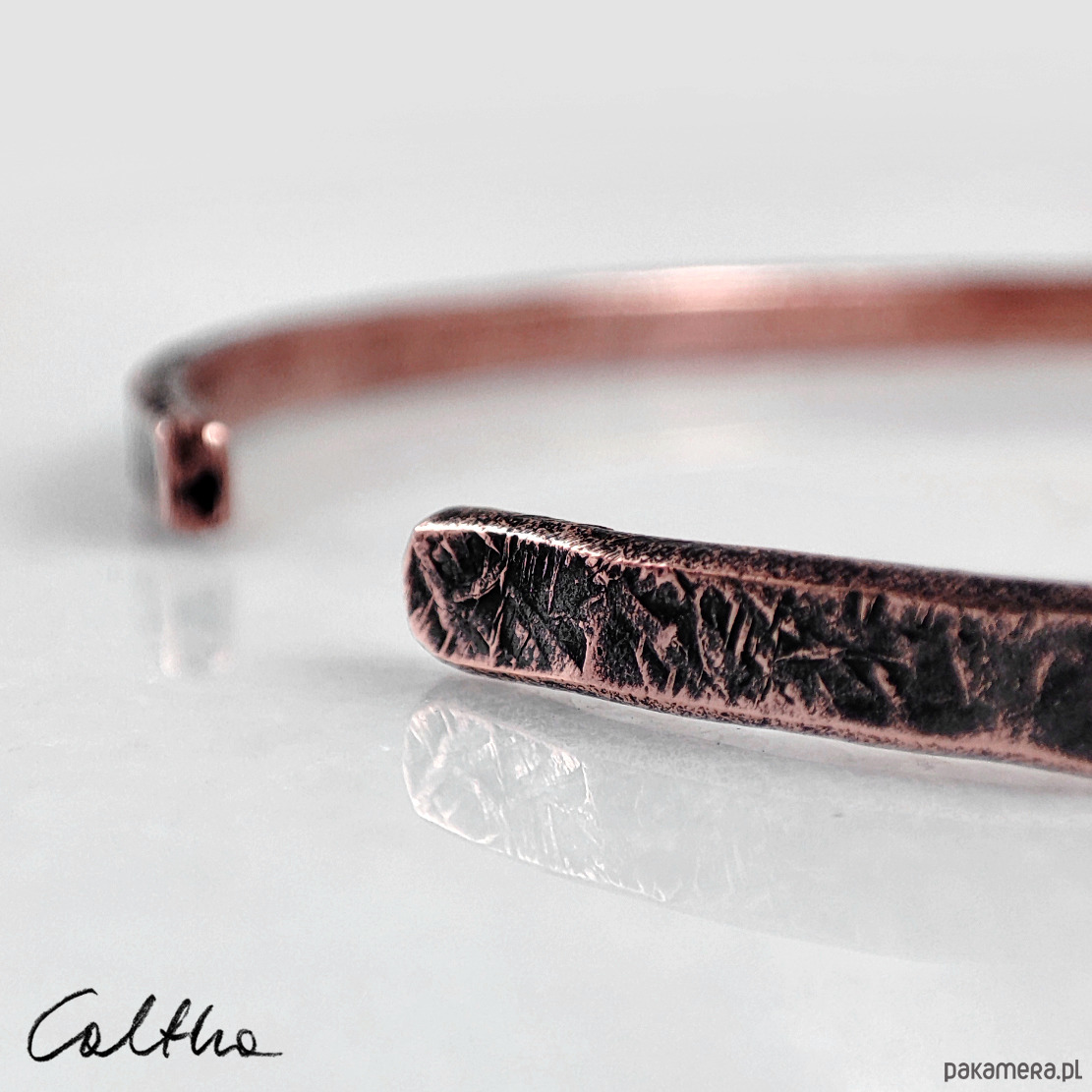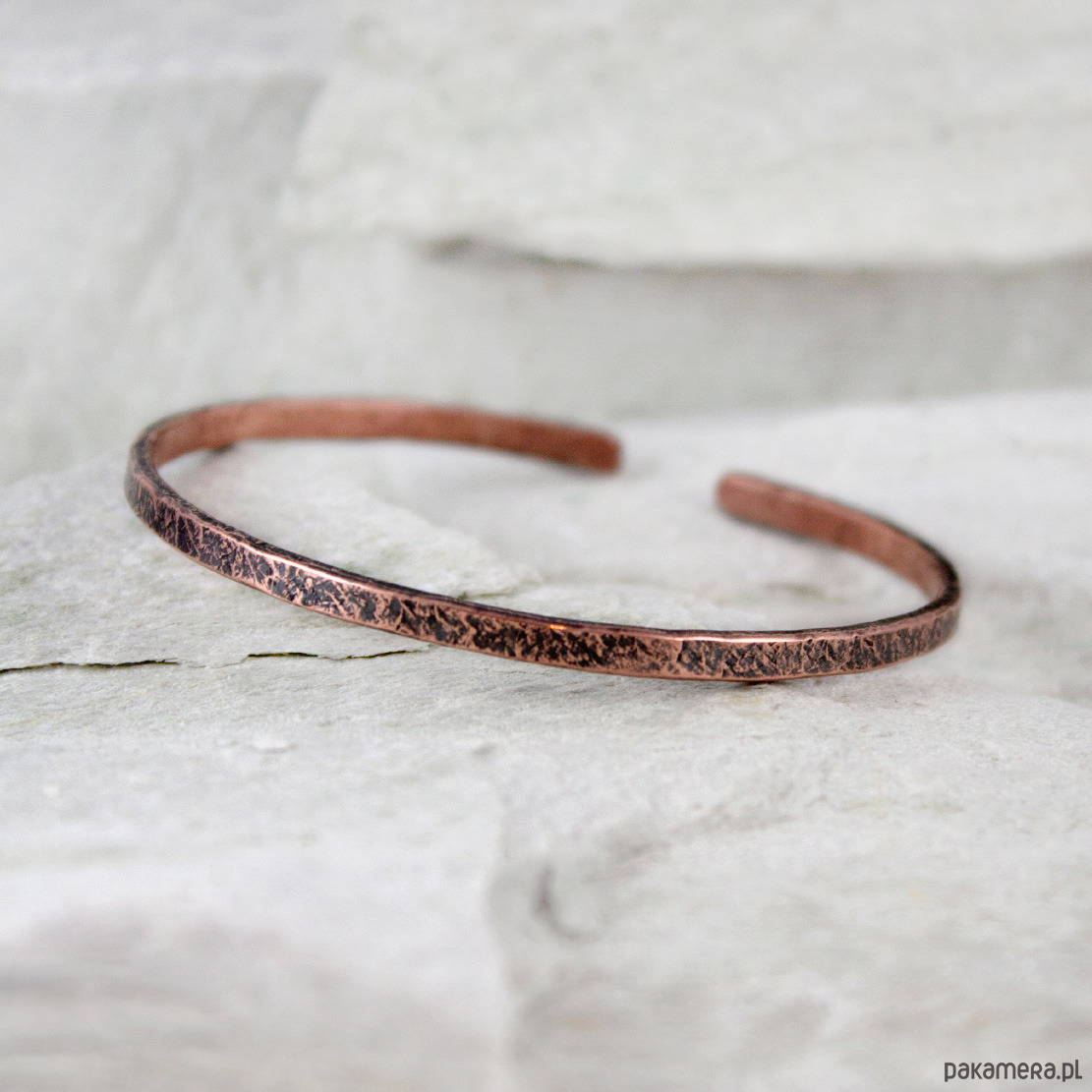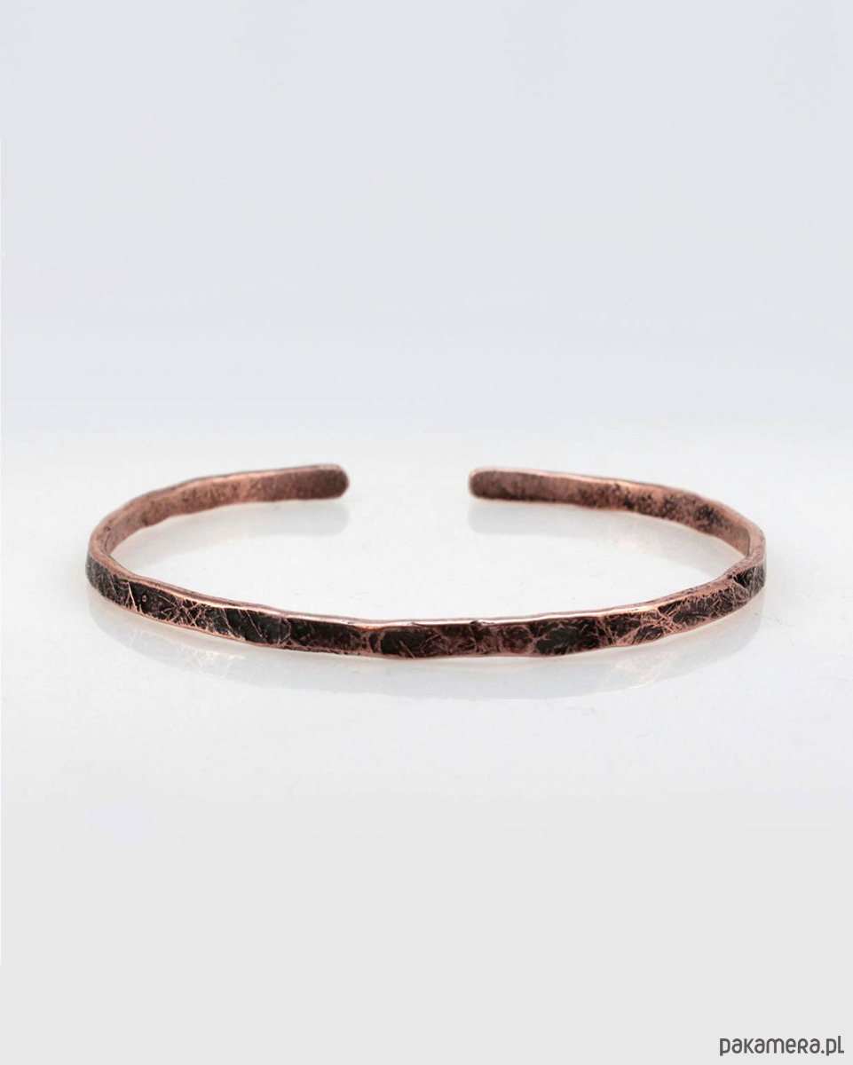 Prosta miedziana bransoleta o nieregularnej fakturze. Dzięki prostej formie może być noszona zarówno przez kobietę jak i mężczyznę. Odpowiednia na różne okazje, pasuje do swobodnych jak i eleganckich stylizacji. Doskonale nadaje się na prezent.