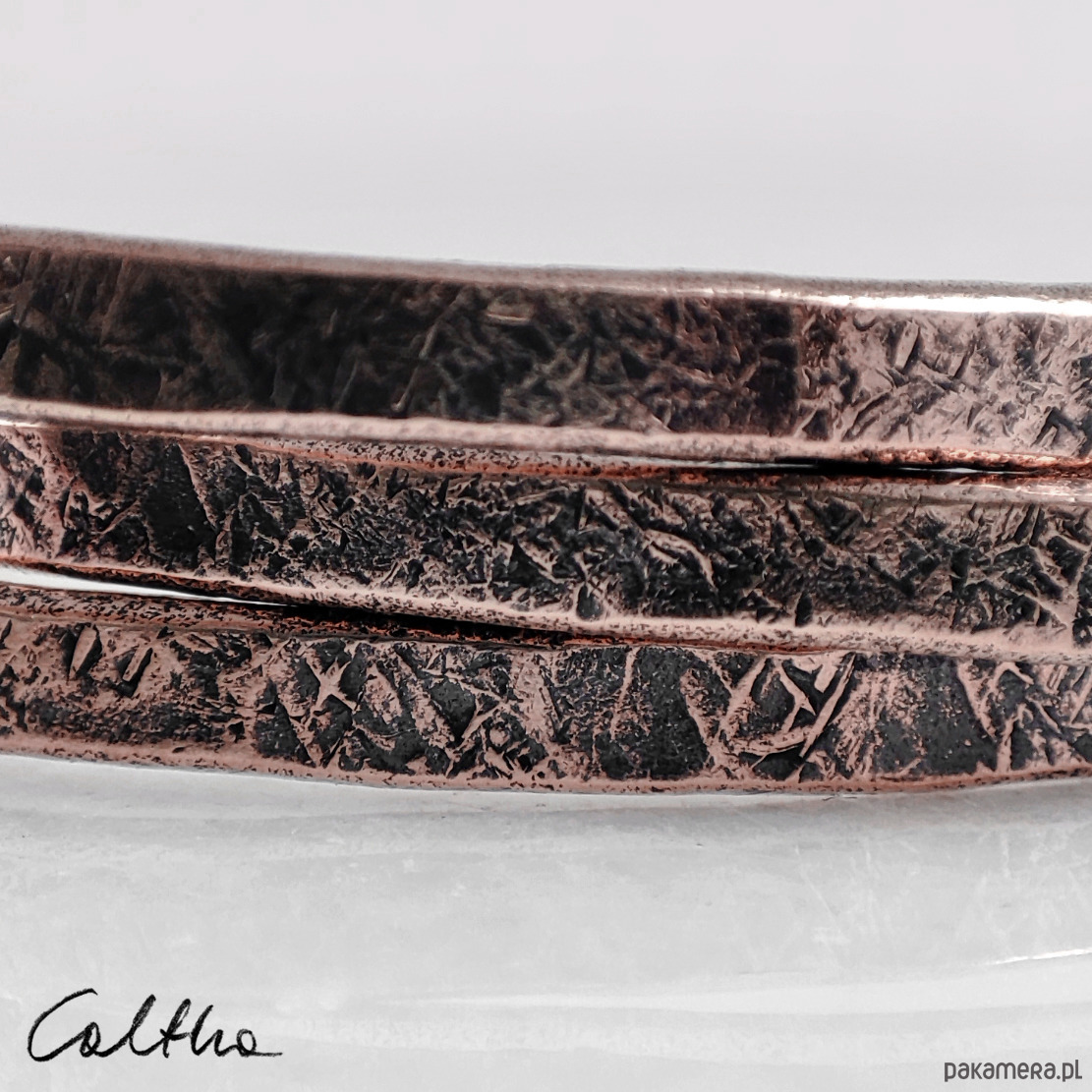 Bransoletka została wykonana z grubego miedzianego drutu, jej szerokość to ok 4 mm. Faktura jest lekko podkreślona ciemną patyną uzyskaną w procesie oksydacji (bez użycia sztucznych barwników).