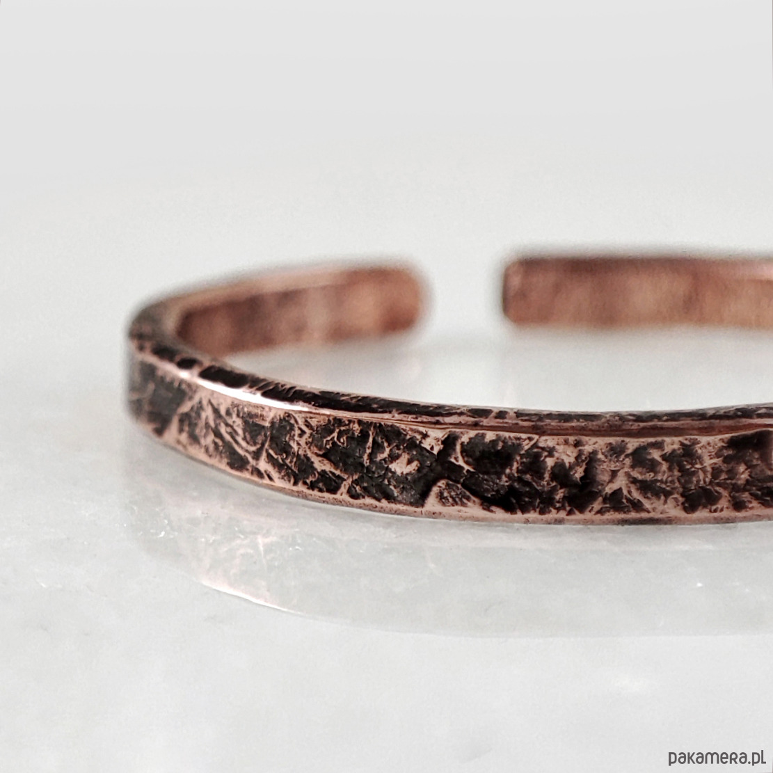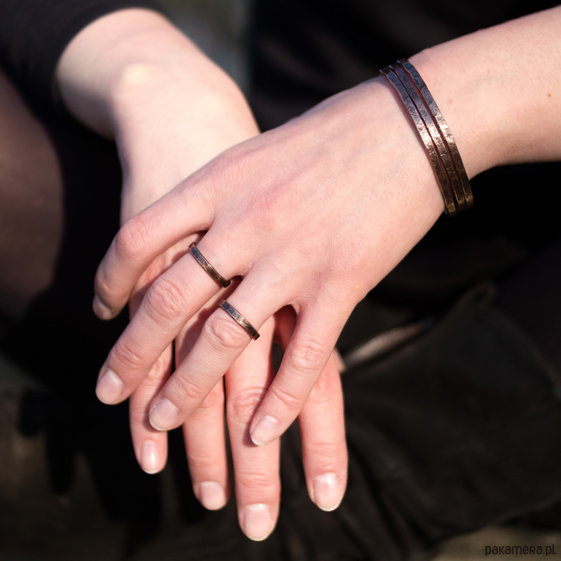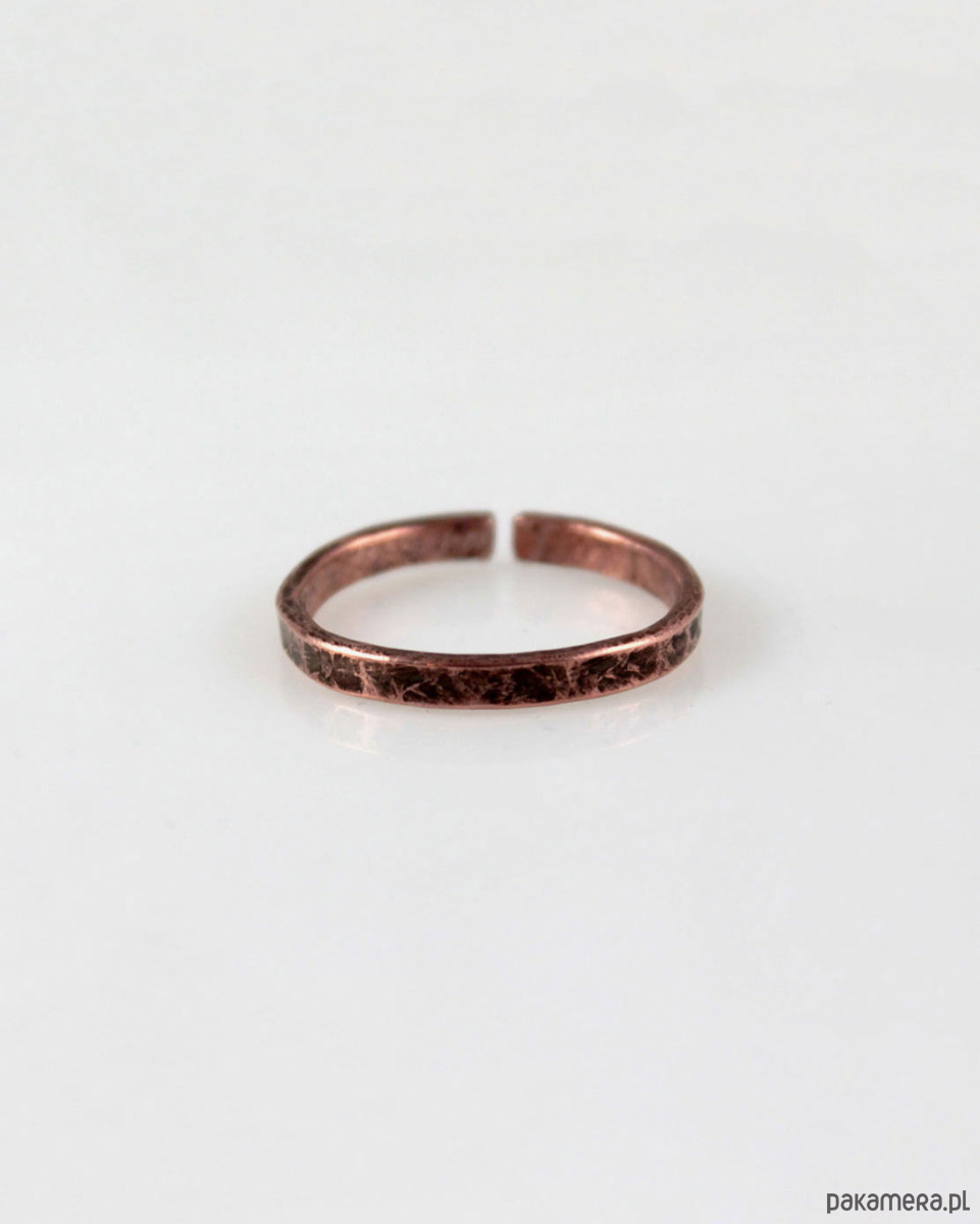 Pierścionek został wykonany z miedzi, jego szerokość to ok 0,25 cm.