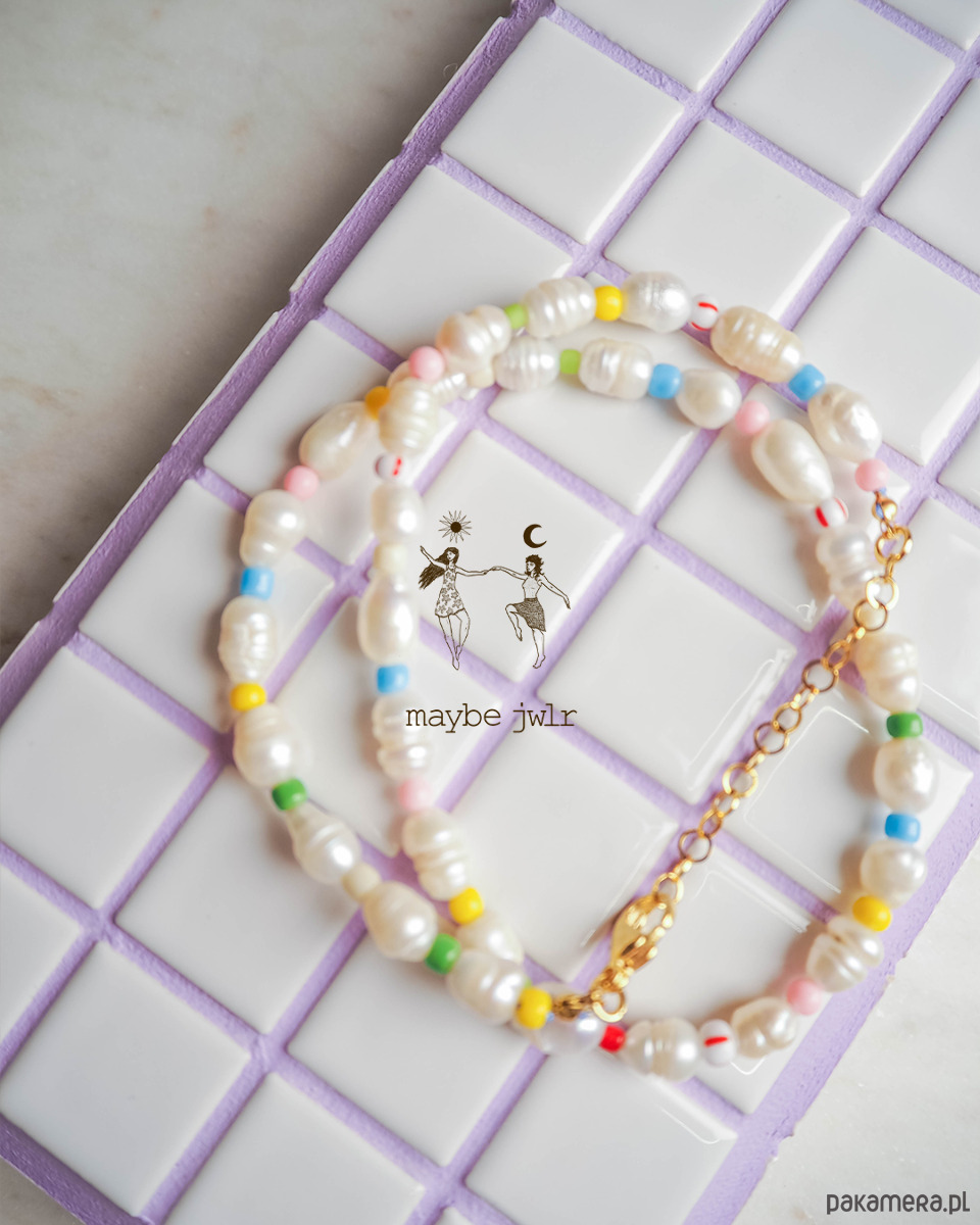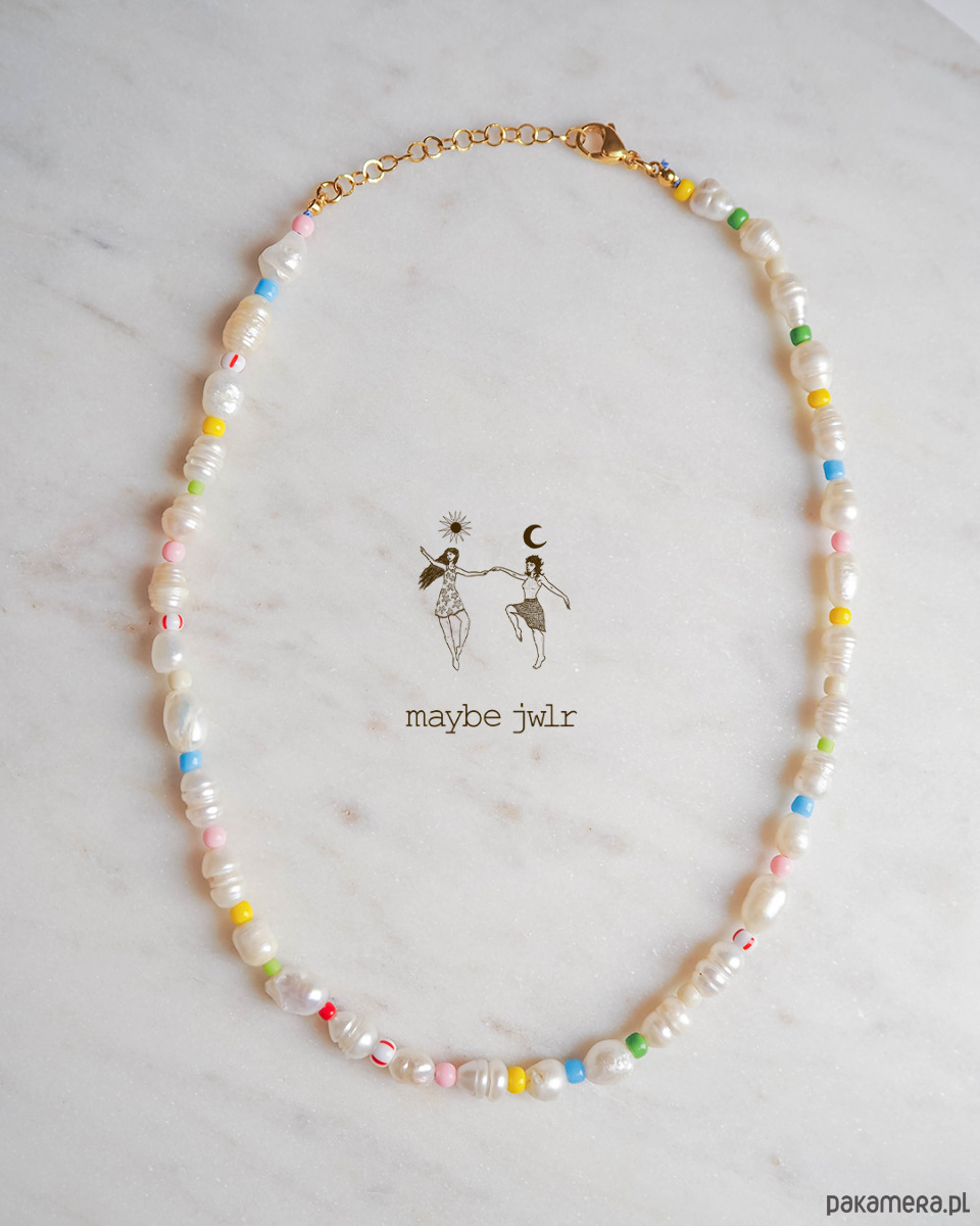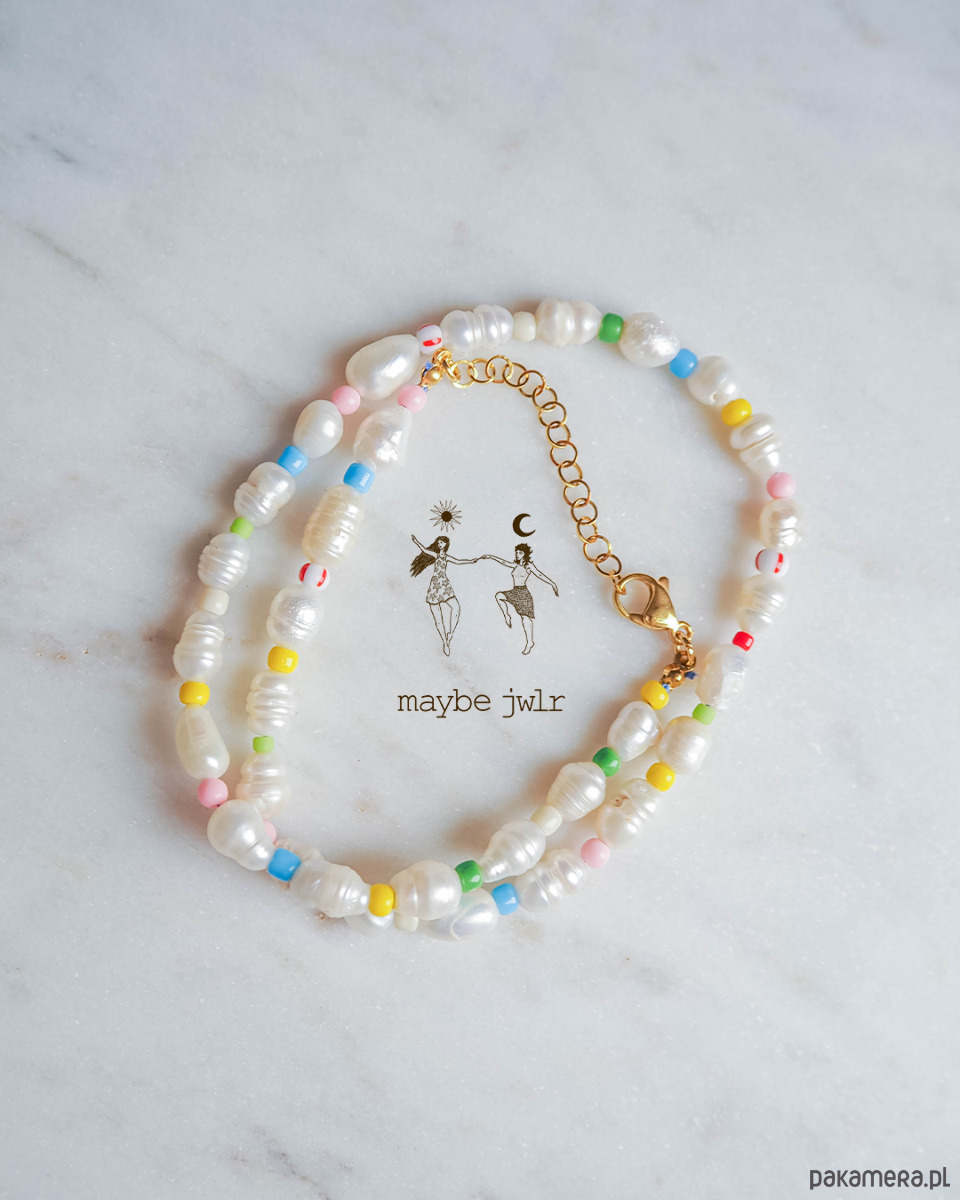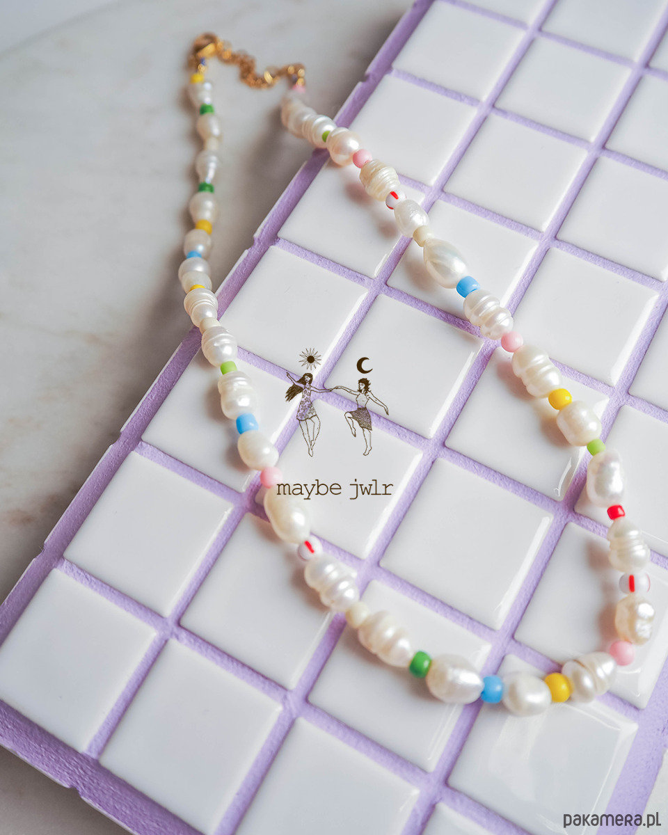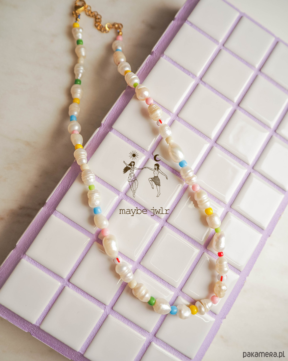 W naszyjniku zostały połączone perły naturalne o nieregularnych rozmiarach od 4-8mm oraz szklane koraliki japońskiej marki.