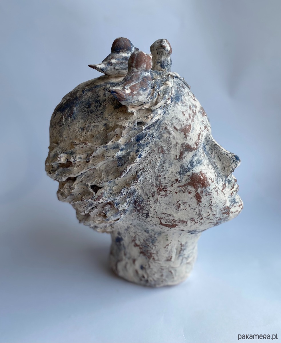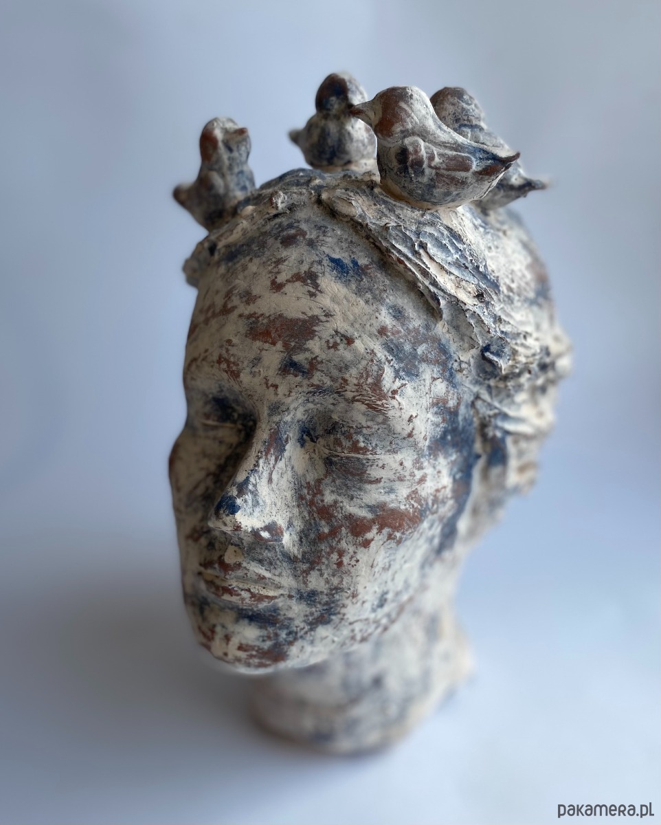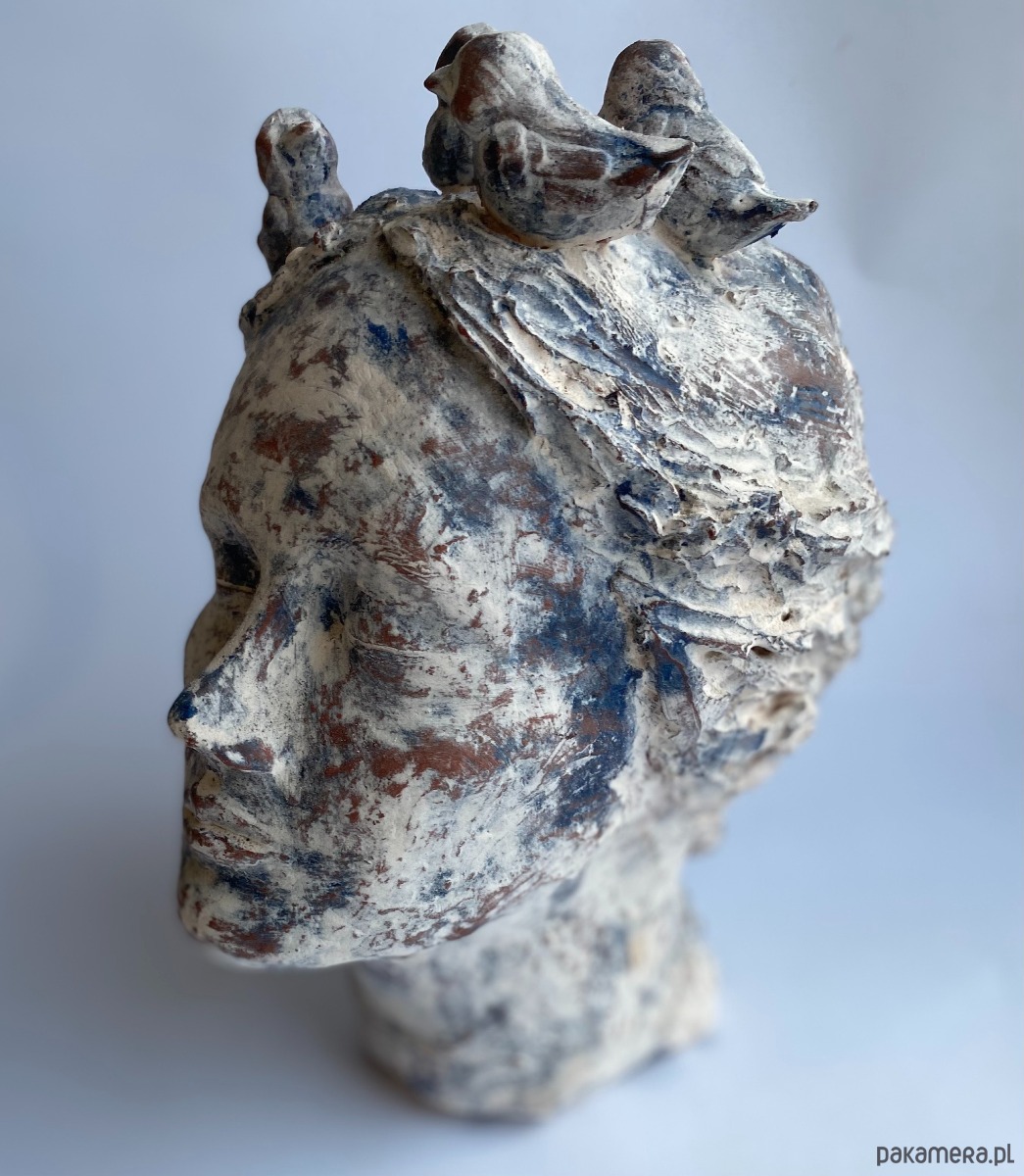 Rzeźba ceramiczna- przedstawiająca głowę kobiety, która myśli o lataniu :) Wysokość rzeźby to 27 cm, rzeźba wykonanazostała z czerwonej gliny szamotowej, pokryta angobami w kolorach niebiskim i białym, wypalana kilkukotnie w wysokich temearturach, piękna, unikatowa, będzie ozdobą salonu, biura i każdego innego wnętrza, polecam.