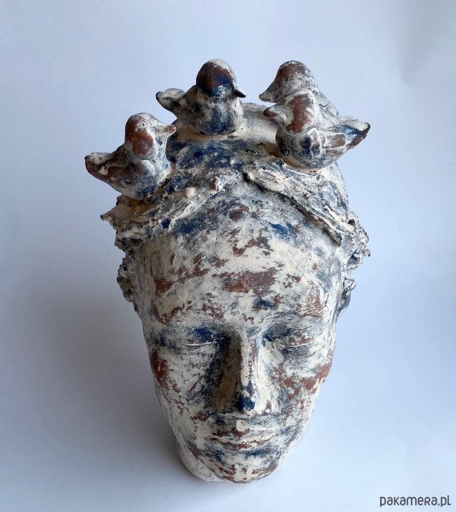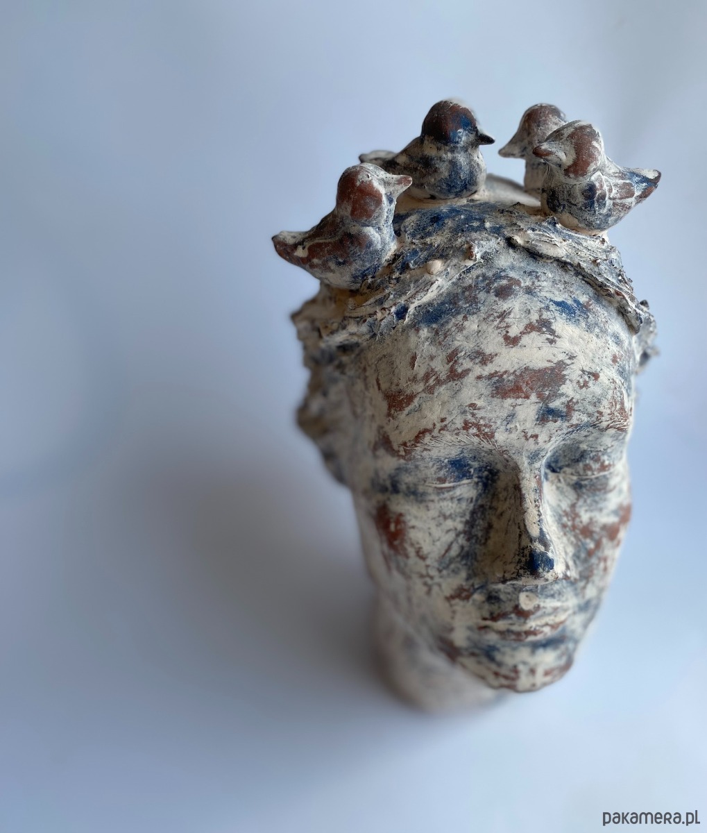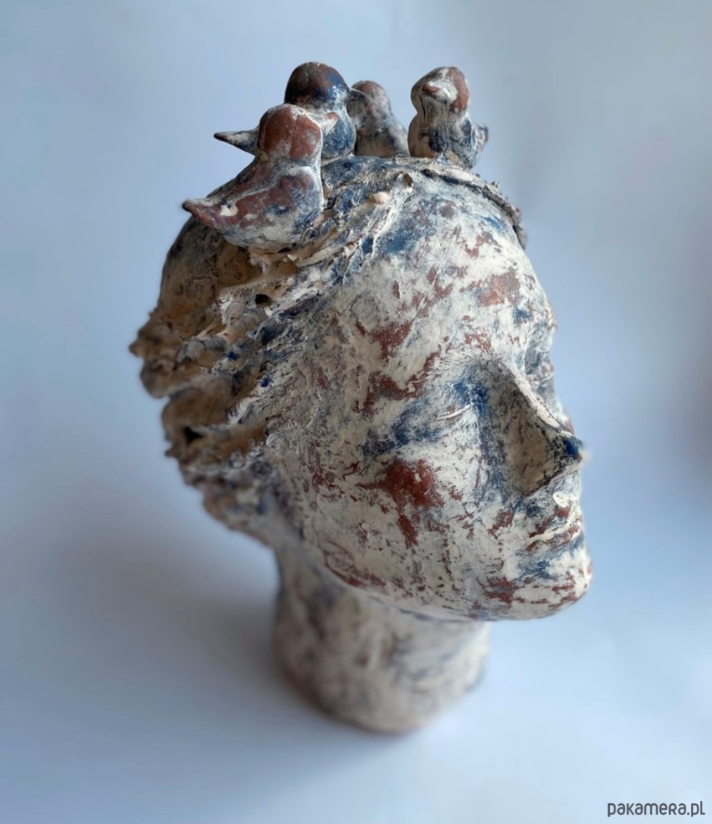 Rzeźba ceramiczna- przedstawiająca głowę kobiety, która myśli o lataniu :) Wysokość rzeźby to 27 cm, rzeźba wykonanazostała z czerwonej gliny szamotowej, pokryta angobami w kolorach niebiskim i białym, wypalana kilkukotnie w wysokich temearturach, piękna, unikatowa, będzie ozdobą salonu, biura i każdego innego wnętrza, polecam.