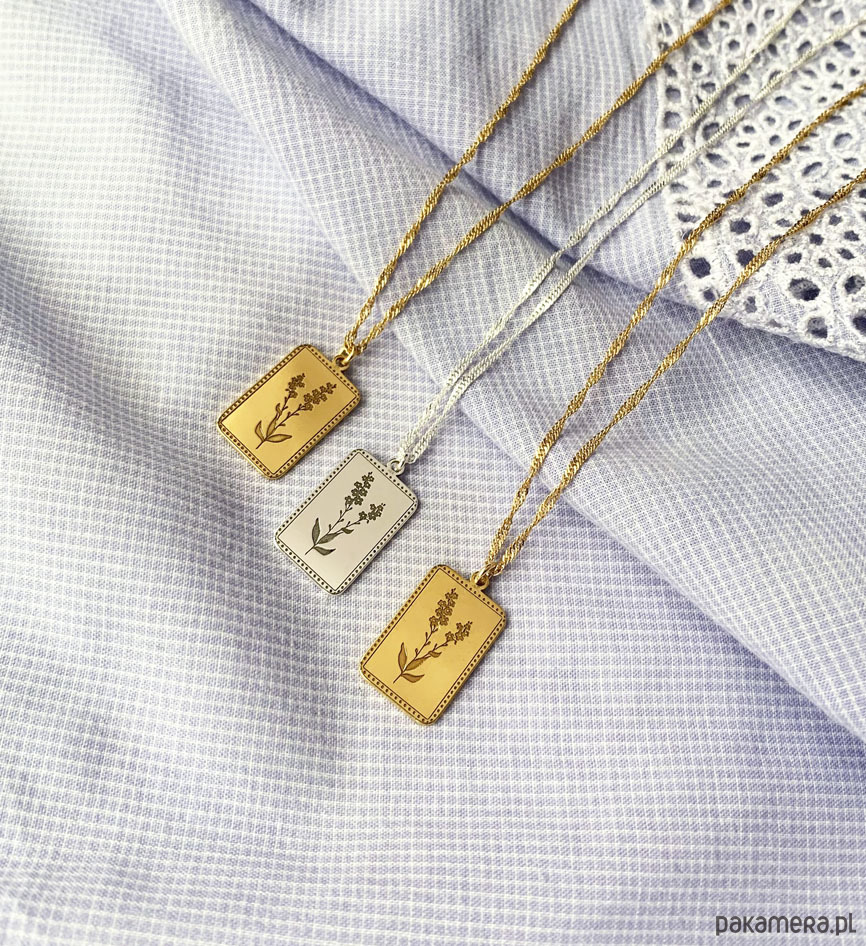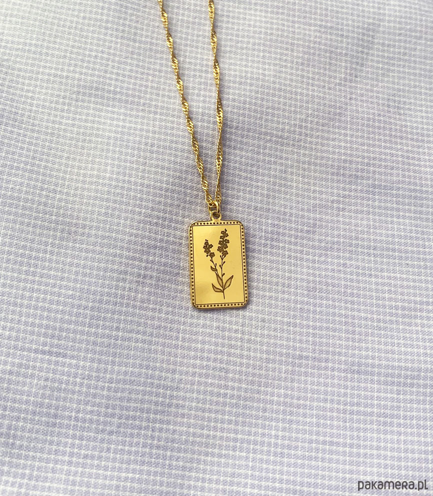 Prostokątna zawieszka z grawerem kwiatu niezapominajki .