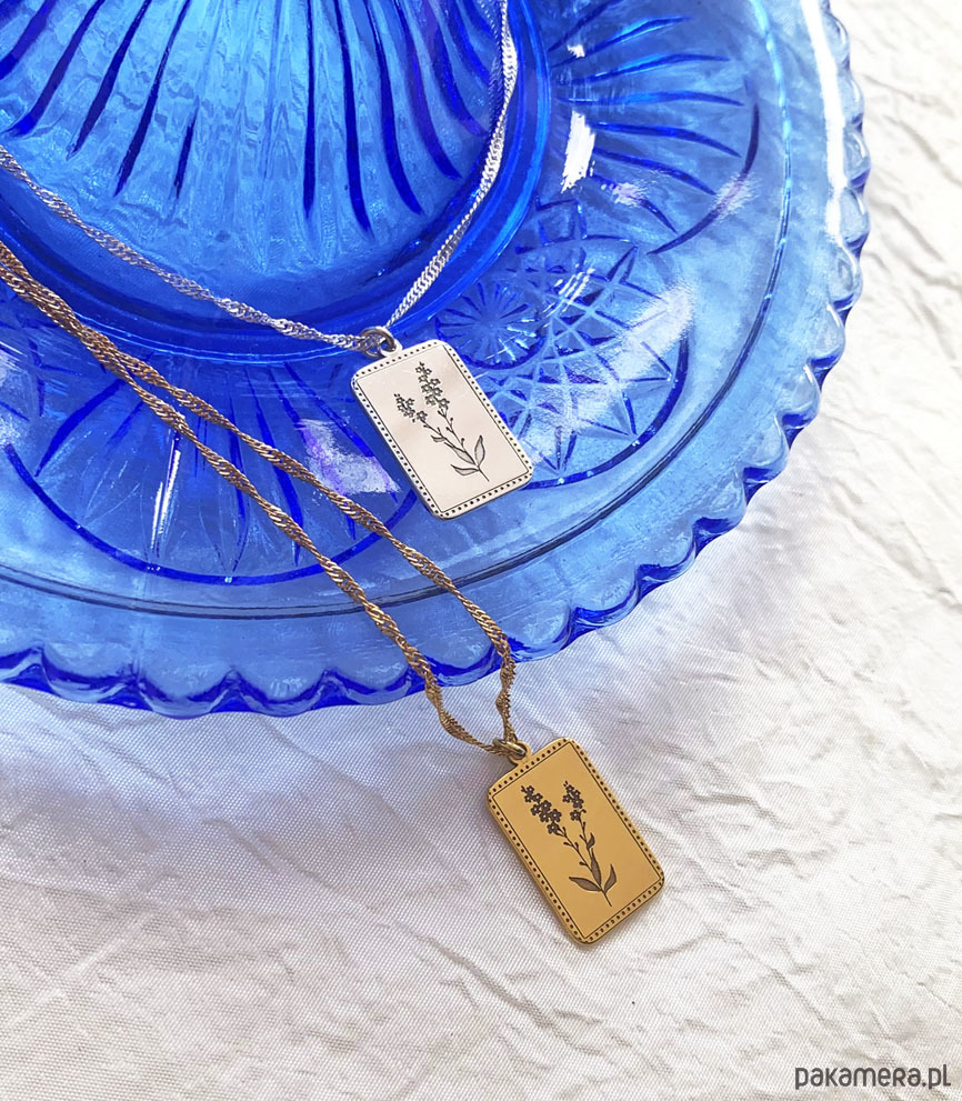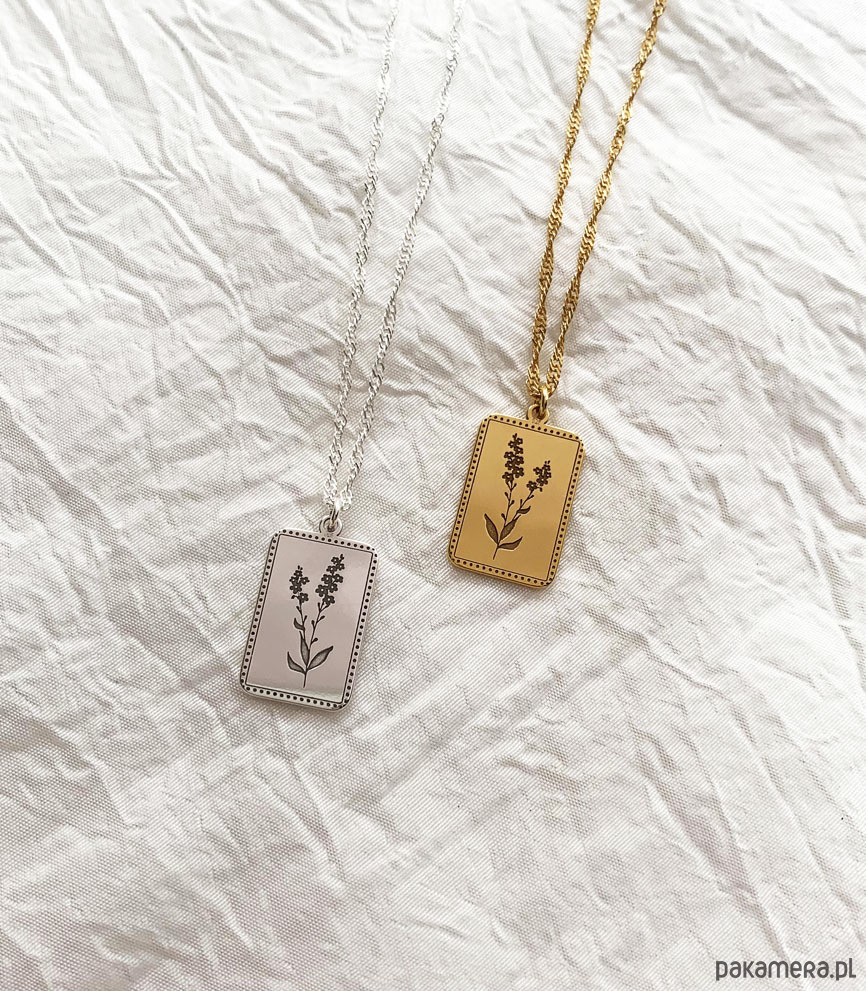 Prostokątna zawieszka z grawerem kwiatu niezapominajki