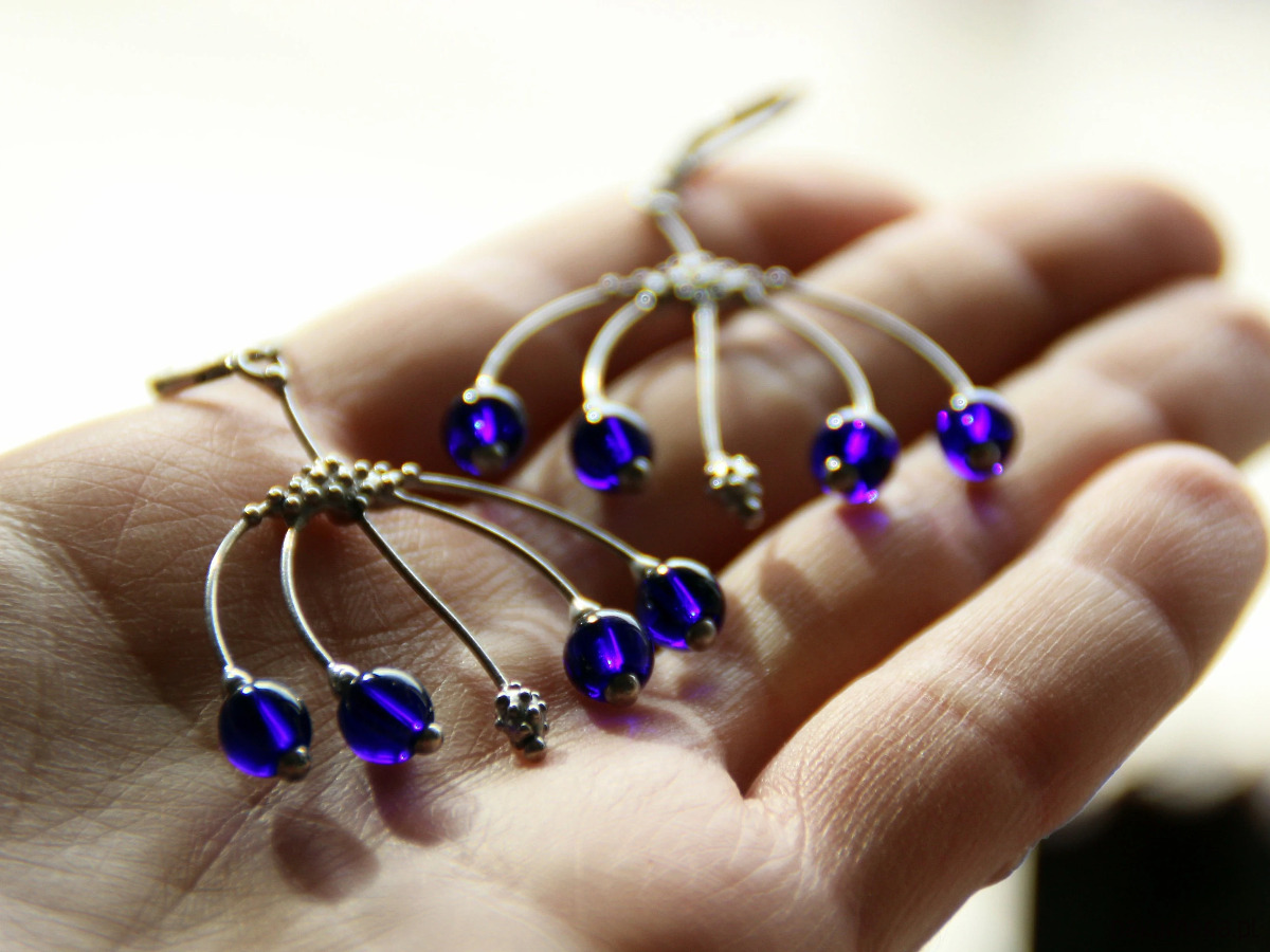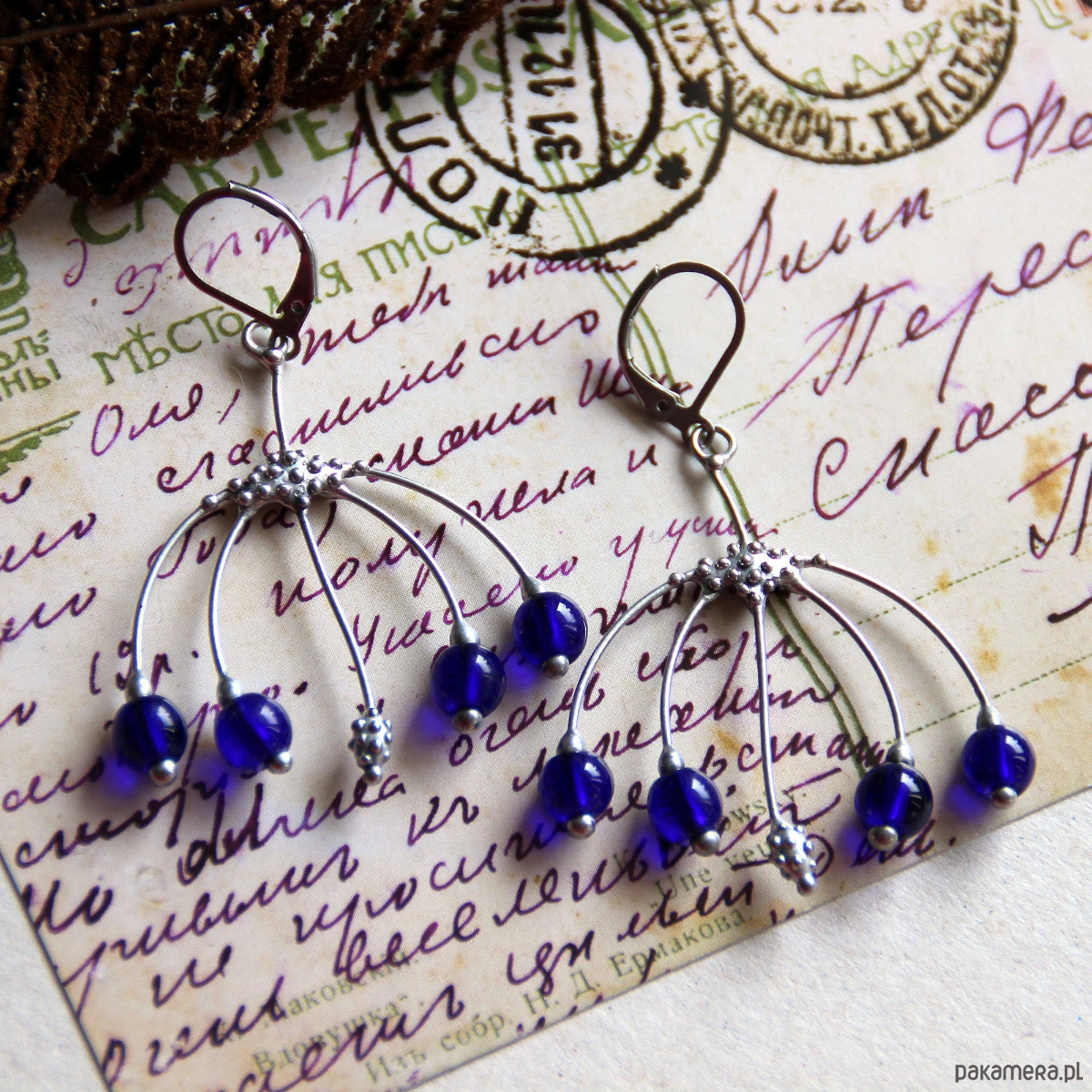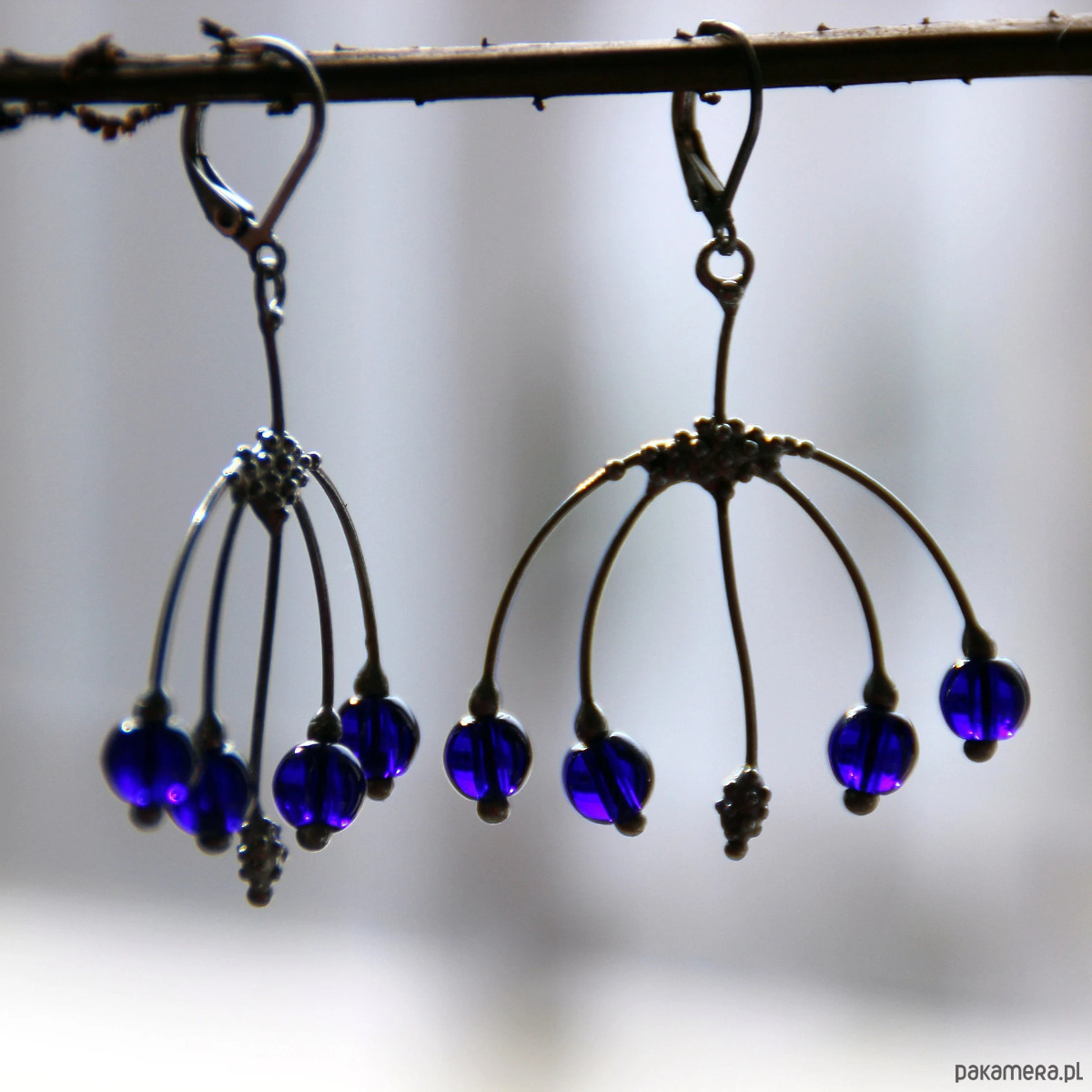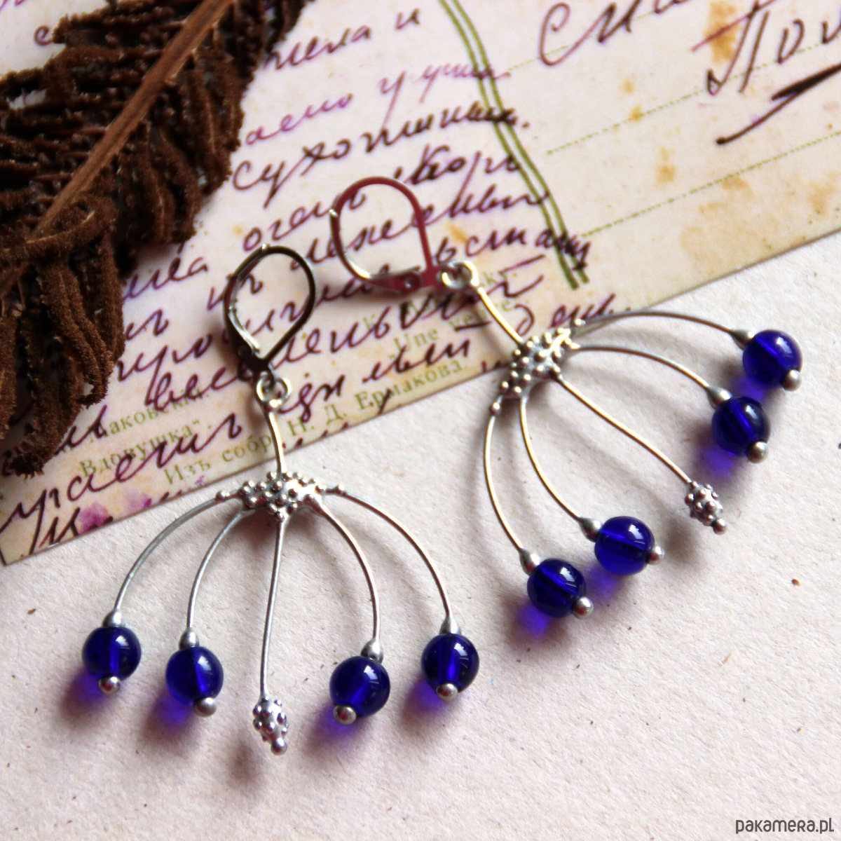 Te ręcznie wykonane, niezwykłe kolczyki w stylu boho z niebieskim szkłem, wykonane z miedzi, cyny, stali i niebieskiego szkła. Są lekkie i solidne. Wszystkie elementy są wykonane ręcznie, co zapewnia indywidualność każdego produktu wytworzonego w warsztacie Yadovito. Stop cyny i miedzi jest polerowany za pomocą roztworu wykończeniowego, aby nadać biżuterii szlachetny wygląd, a jednocześnie zapobiec utlenianiu się metalu. W kolczykach wykorzystano szkło stopione w specjalnym piecu. Po stopieniu szkło nabiera niemal unikalnego kształtu i niesamowitych odcieni kolorów, które mienią się w świetle. Rozmiar około 3,5 cm/4 cm. Kolor srebrny/niebieski.