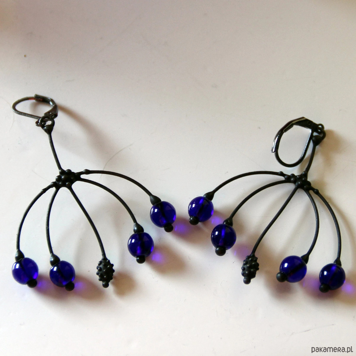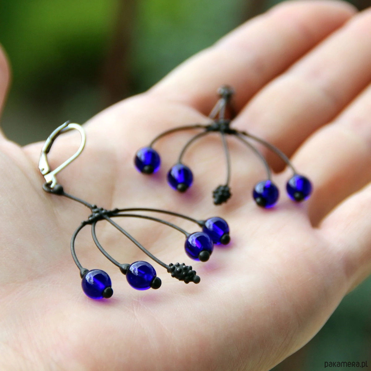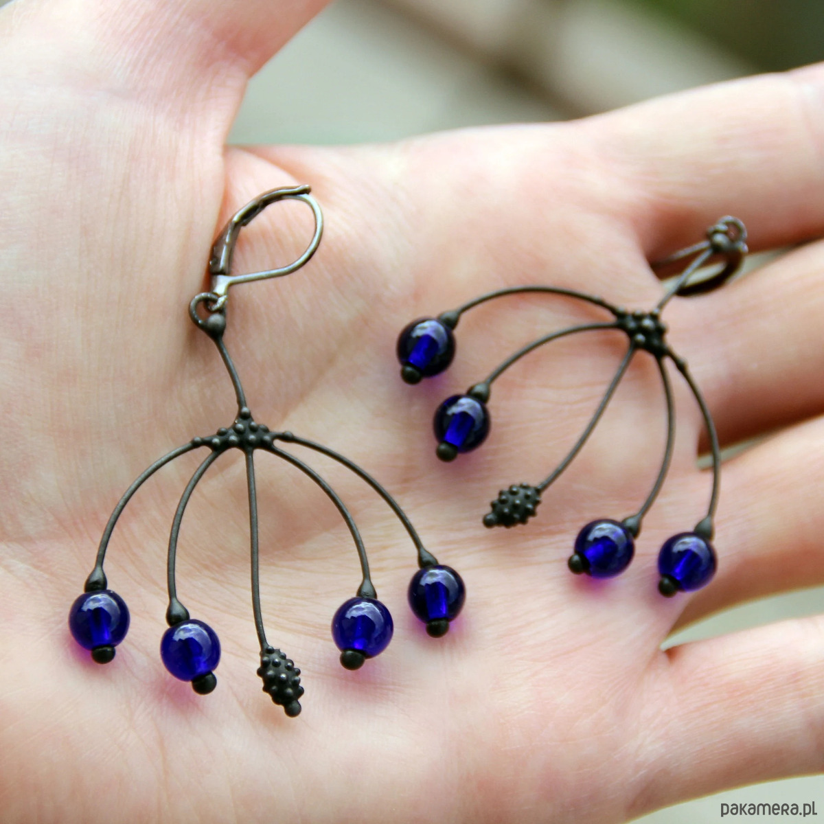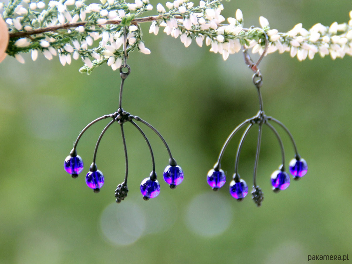 Te metalowe, ręcznie robione kolczyki w stylu boho hippie z niebieskim szkłem są wykonane z miedzi, cyny, stali i niebieskiego szkła. Są lekkie i cienkie. Wszystkie elementy są wykonane ręcznie, co zapewnia indywidualność każdego produktu wytworzonego w warsztacie Yadovito. Stop cyny i miedzi jest pokryty czarną patyną, aby nadać metalowi czarny kolor, a następnie polerowany roztworem wykończeniowym, aby nadać biżuterii szlachetny wygląd i jednocześnie zapobiec utlenianiu się metalu. W kolczykach wykorzystano szkło stopione w specjalnym piecu. Po stopieniu szkło nabiera niemal unikalnego kształtu i niesamowitych odcieni kolorów, które mienią się w świetle. Rozmiar około 3,5 cm/4 cm. Kolor czarny/niebieski.