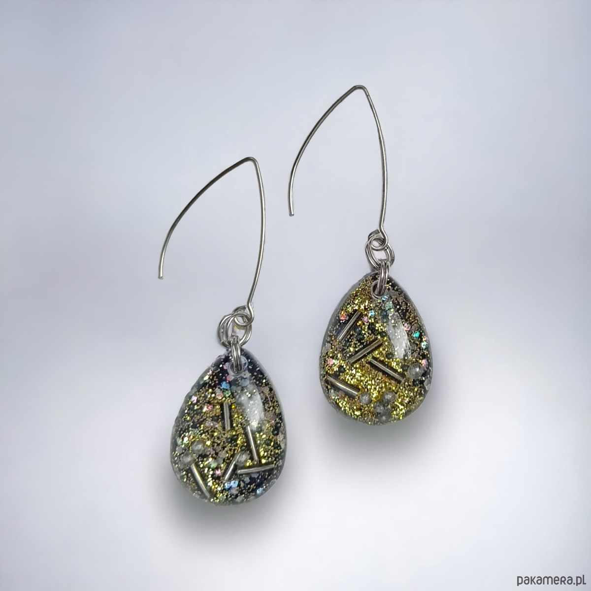 kolczyki wykonane z transparentnej i transparentnej grafitowej żywicy z dodatkiem brokatu w kolorze złotym i holograficznym, szklanego kawioru, szklanych koralików -rurek.