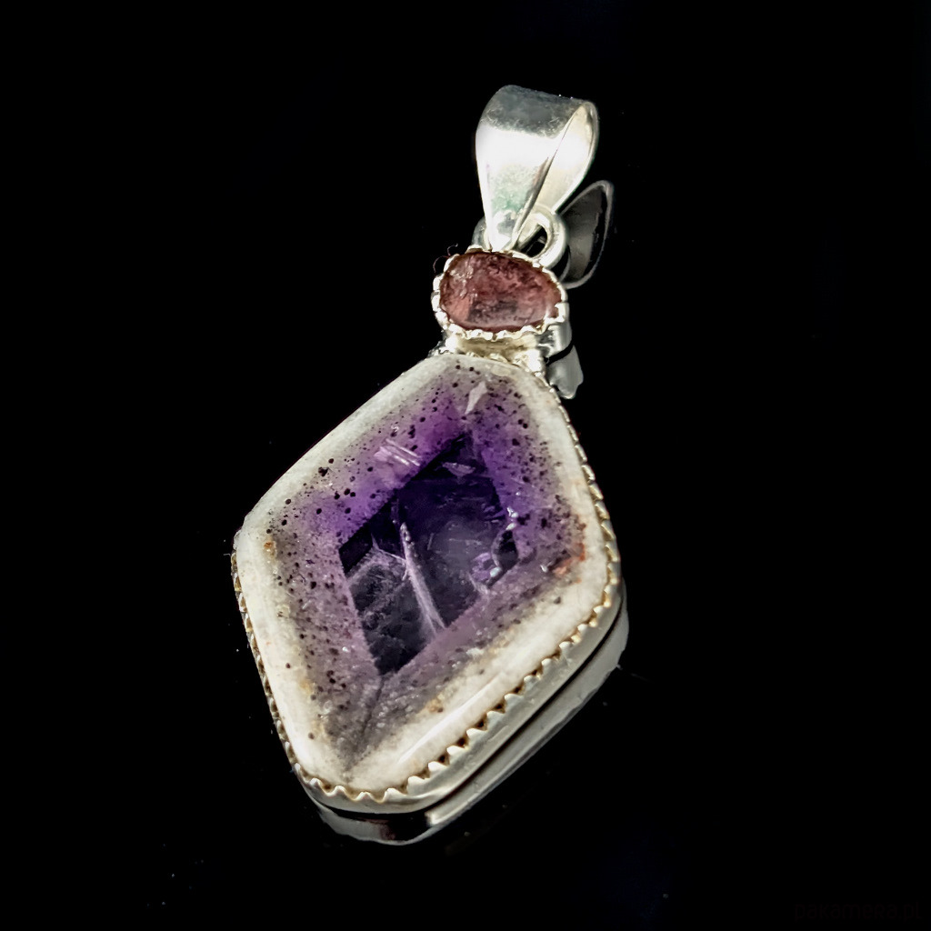 Oryginalny wisiorek wykonany ze srebra próby 925 oraz pięknego, bardzo rzadkeigo auralitu, będącego połączeniem minerałów i metali z przewagą ametystu i kwarcu. Do towarzystwa ma różowy turmalin w oprawie 8 x 6 mm, Kamień z pięknym przeźroczem. Wymiary wisiorka 35 x 20 mm. Z krawatką max 47 mm. Waga 7,5 grama. Wykonany przez dostawcę kamieni. Zawieszka zostanie zapakowana w ozdobne pudełeczko.
