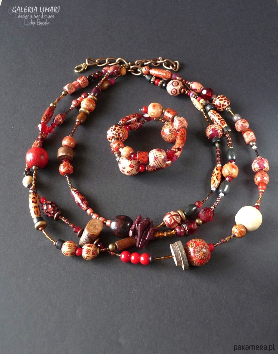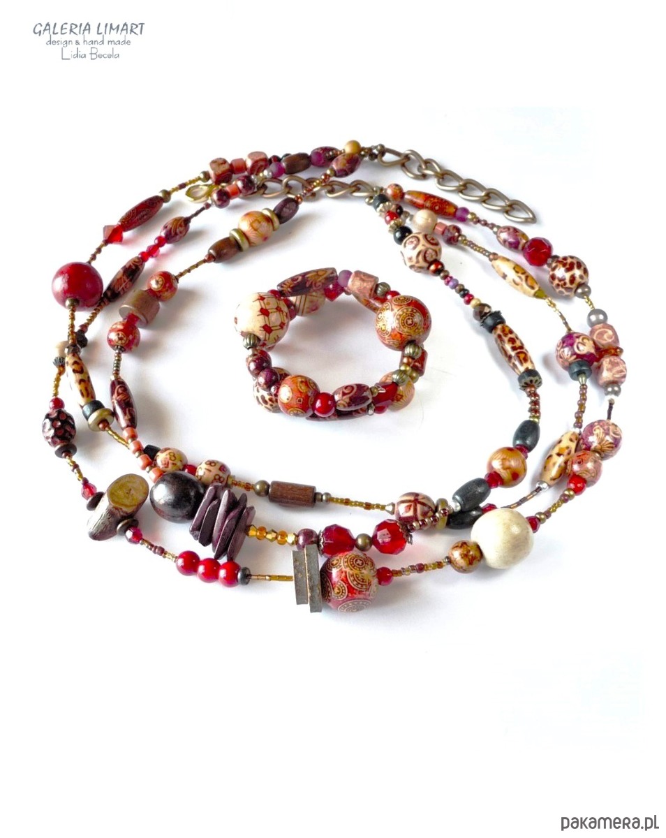 Połączenie drewnianych koralików oklejanych we wzory metodą decoupage, drewna egzotycznego, drobnych szklanych koralików dało znakomity efekt. biżuteria jest nadzwyczaj bogata, okazała, dorodna. naszyjnik 3-żyłowy (długość najkrótszego ok 53 cm, najdłuższego ok. 68 cm). Można nosić dłużej lub krócej dzięki regulacyjnemu łańcuszkowi. Bransoletka na drucie pamięciowy ogromnie ułatwia wkładanie i noszenie.