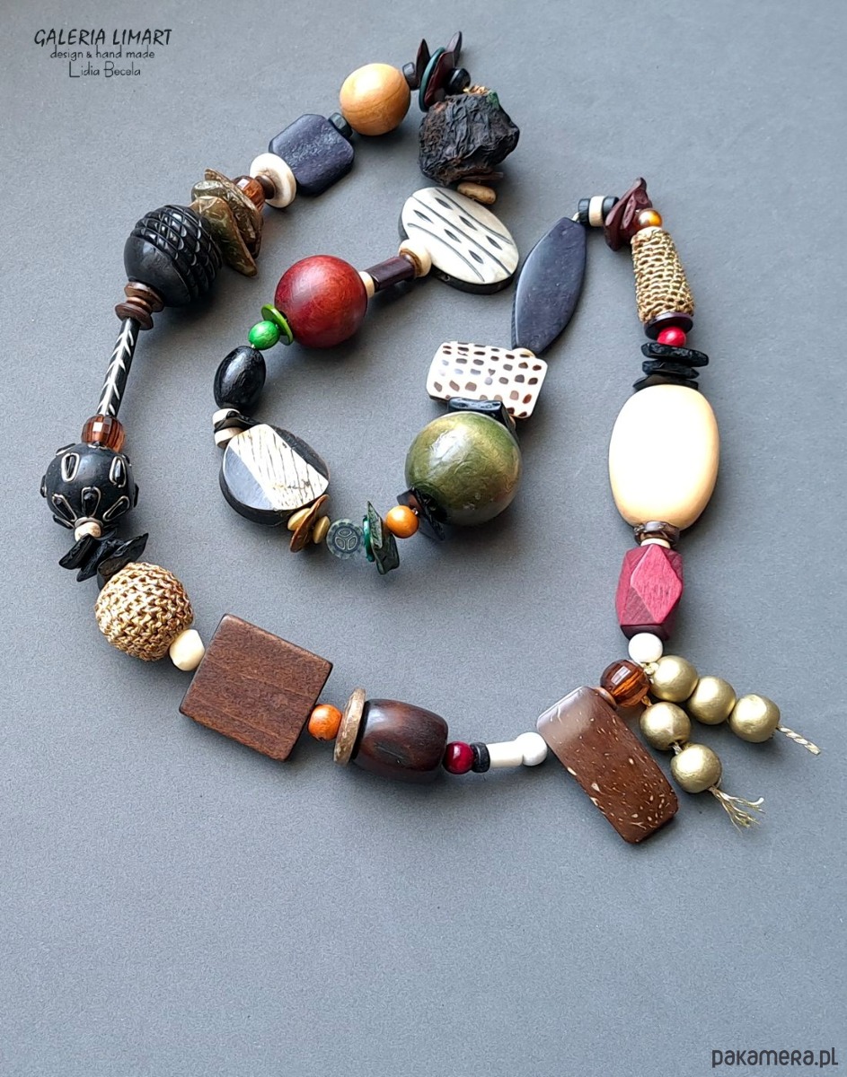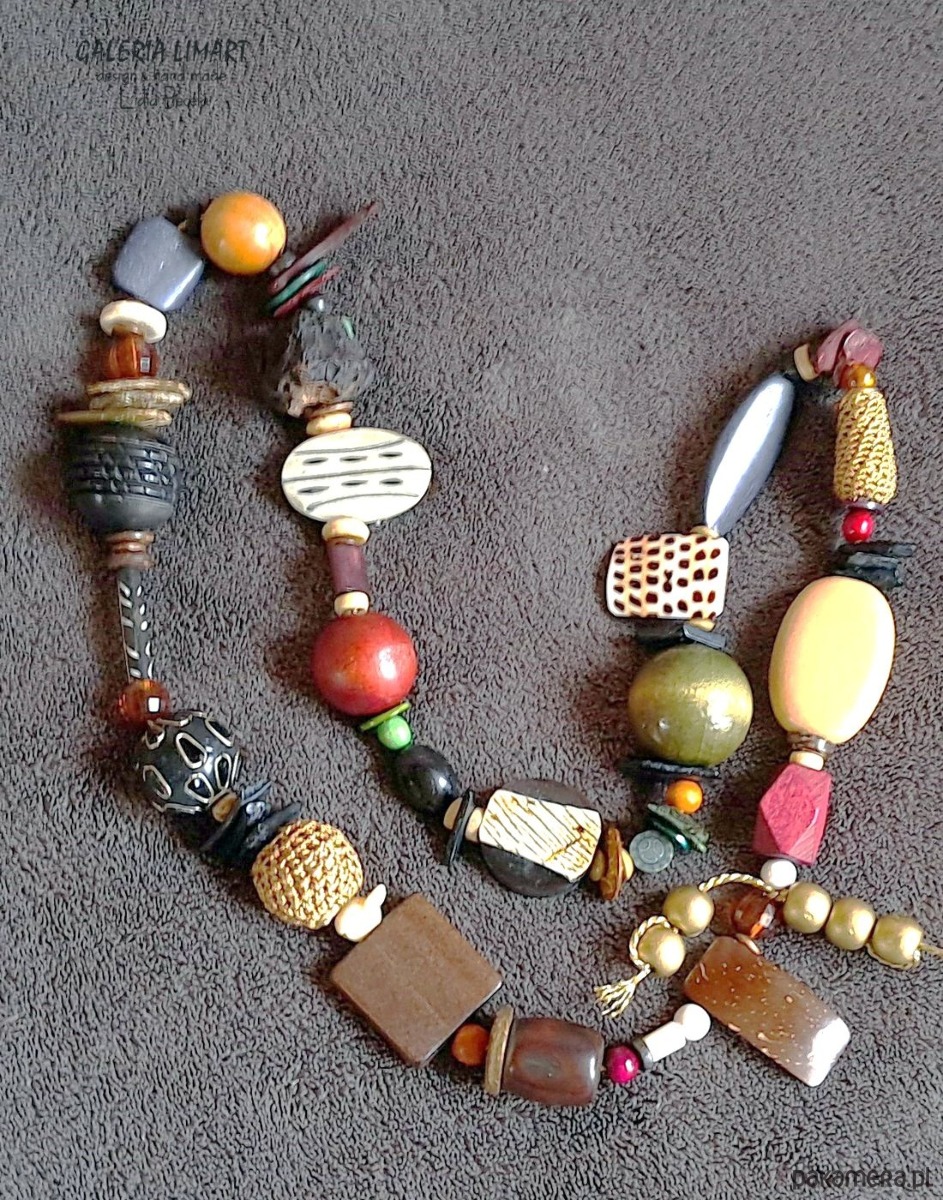 Ty razem naszyjnik w duchu biżuterii etnicznej w połączeniu ze stylem boho, ogromnie efektowny, długi, masywny ale nie ciężki w efektownej beżo-brązowo-czarnej tonacji z przeróżnych minerałów takich jak m. in. drewno egzotyczne, kokos, róg bawołu, minerały, szkło weneckie, macica perłowa, egzotyczne nasiona i inne elementy ozdobne dopasowane kolorystycznie. Mix niemal doskonały :). Długi ok. 80 cm. Obracając go na szyi za każdym razem na wierzchu ma się inną kombinację korali.