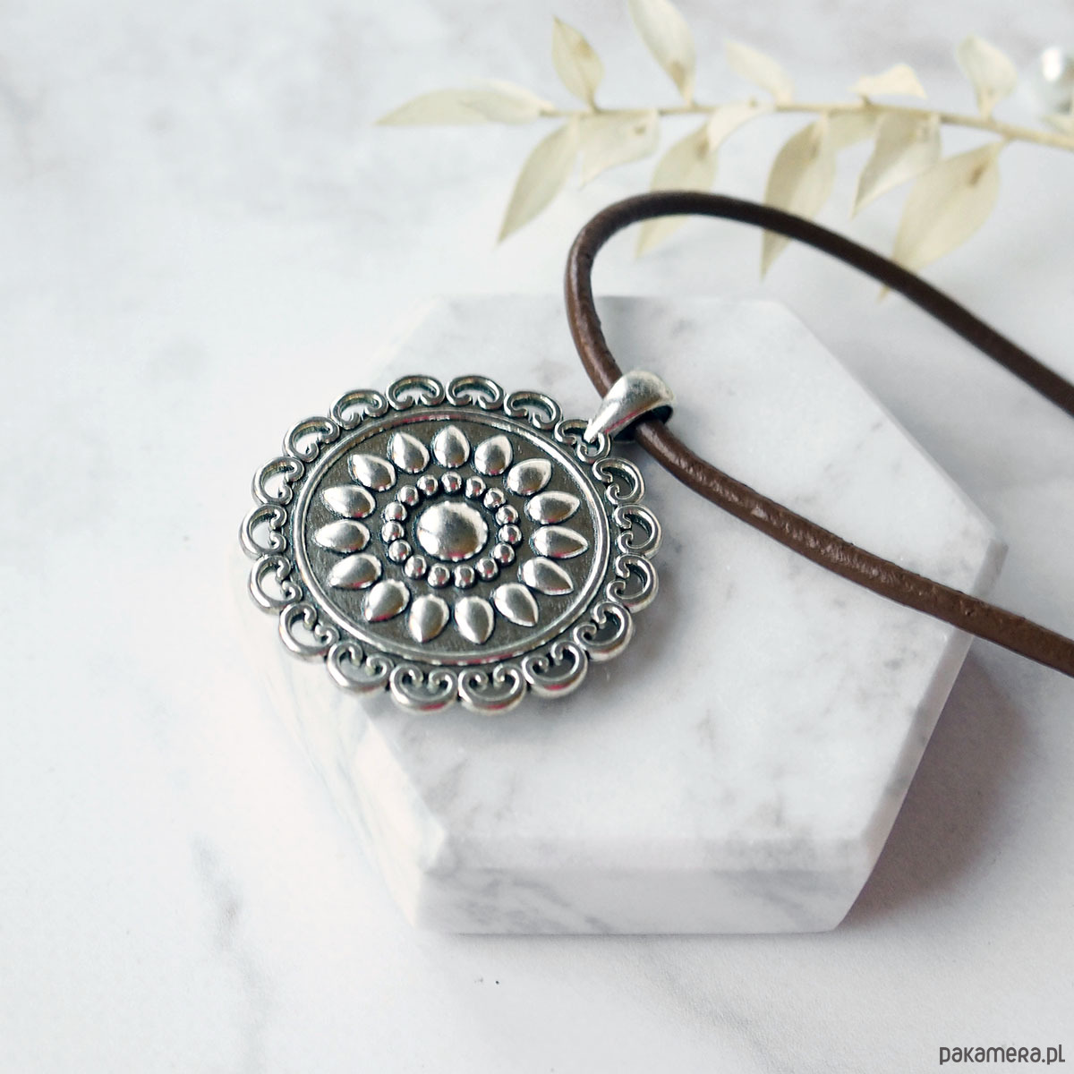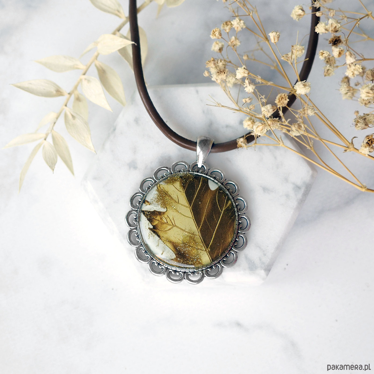 Unikatowy naszyjnik ze szkłem artystycznym. Okrągły wisior w kolorze srebra, zawieszony na skórzanym rzemieniu.