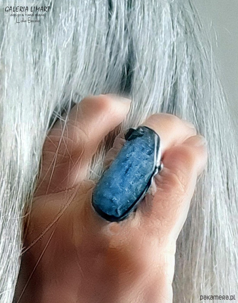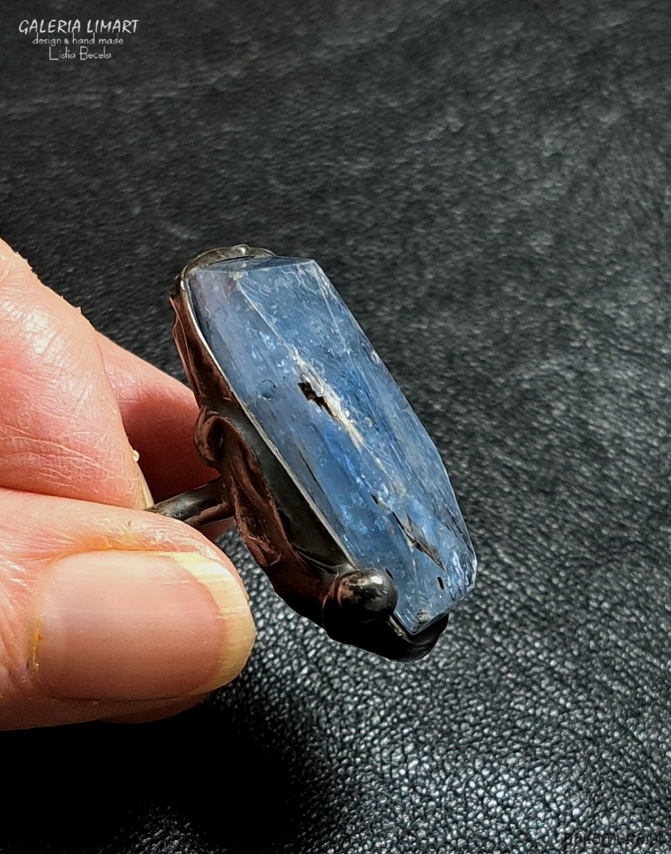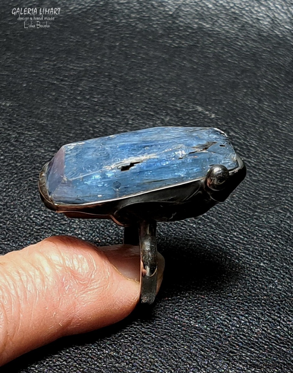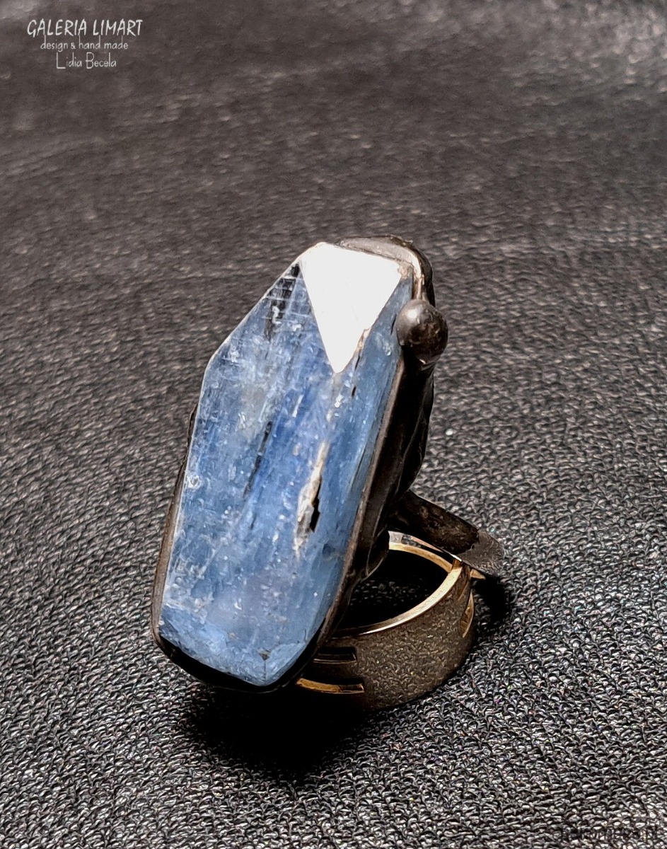 Ciekawy i bardzo efektowny pierścień z pięknym w swym ubarwieniu i okazałym (ok. 3,5x1,5 cm) naturalnym surowym kyanitem (dość rzadki kamień). Mieni się różnymi odcieniami niebieskiego czasami wpadającego w zieleń, a czasami w granat.