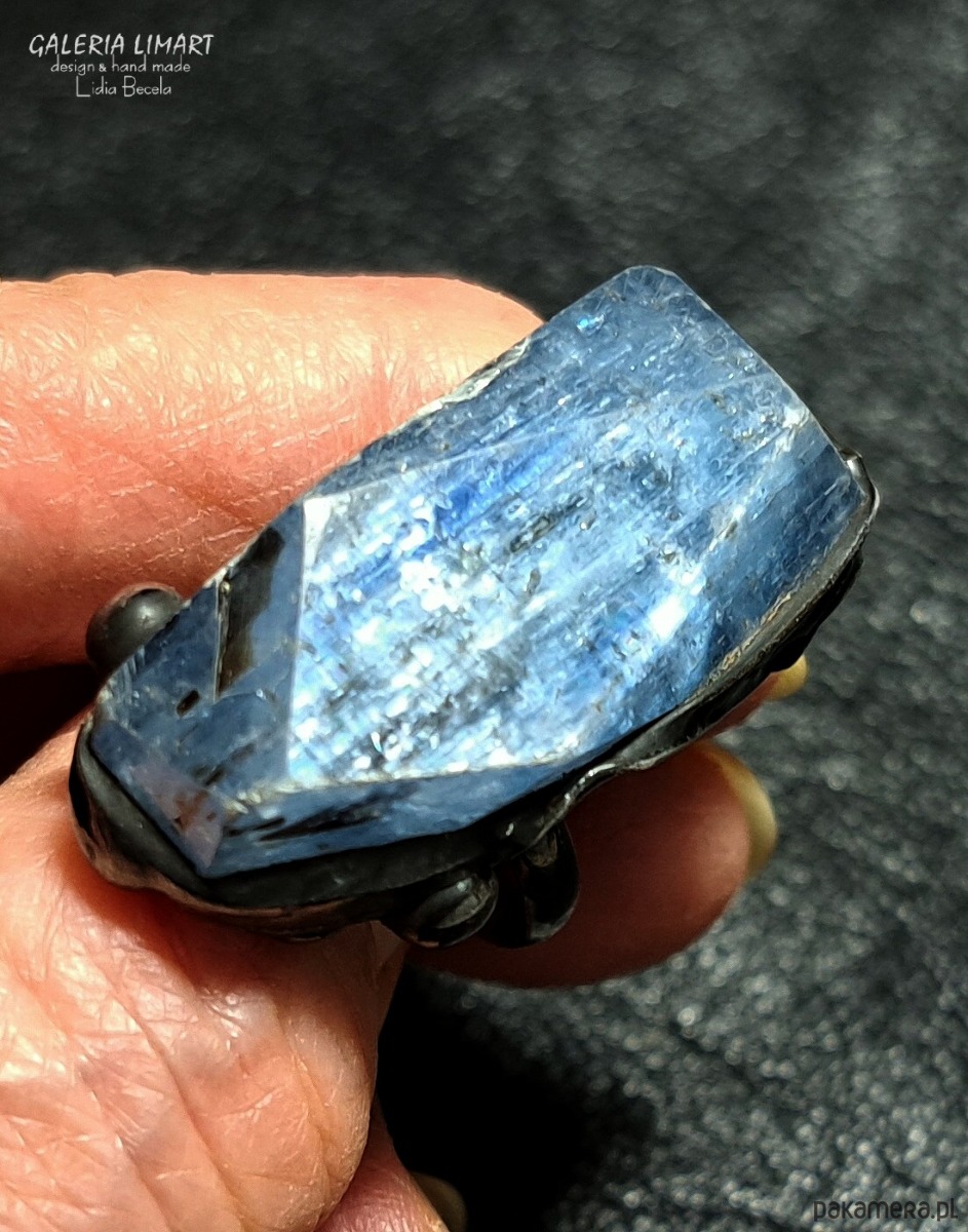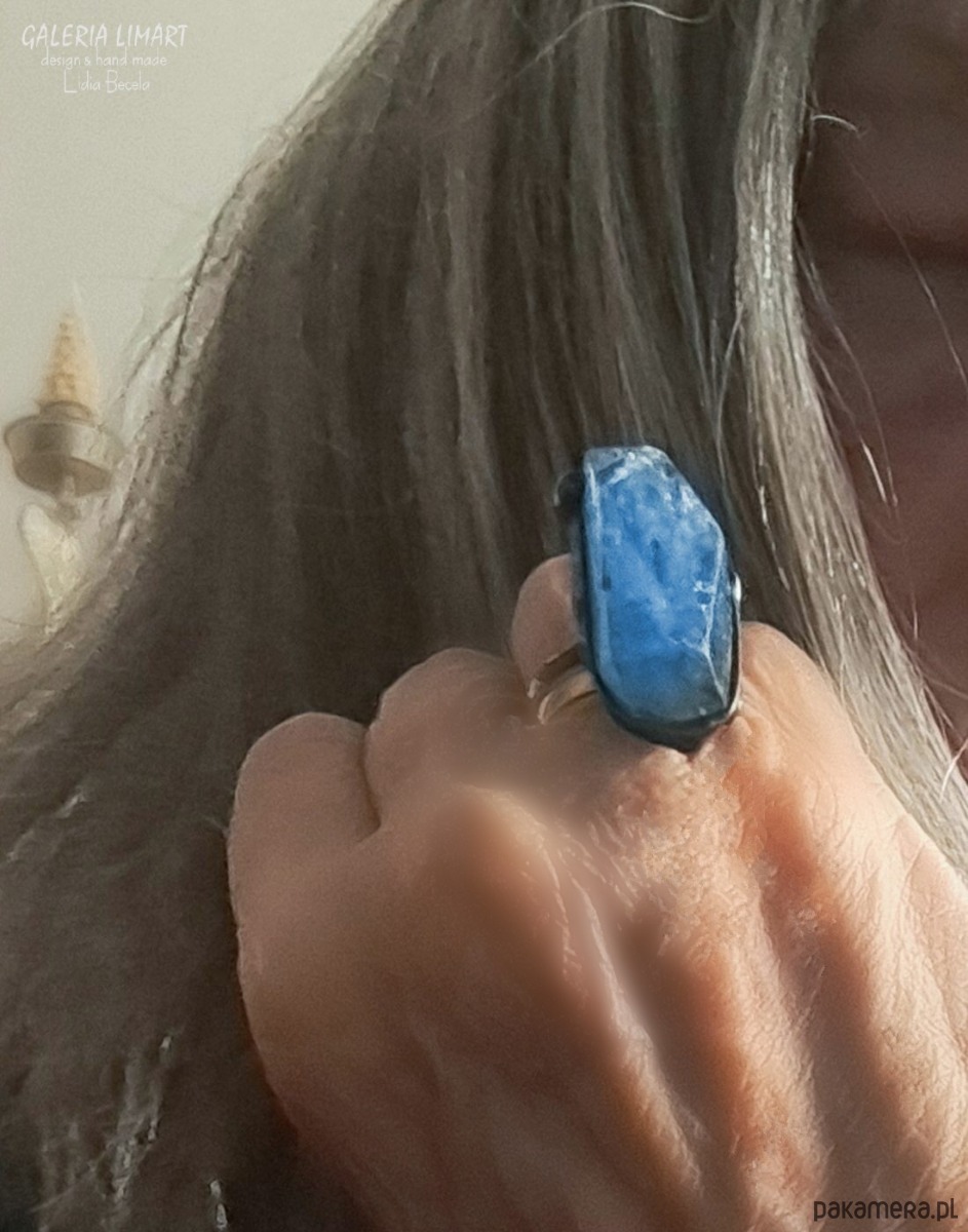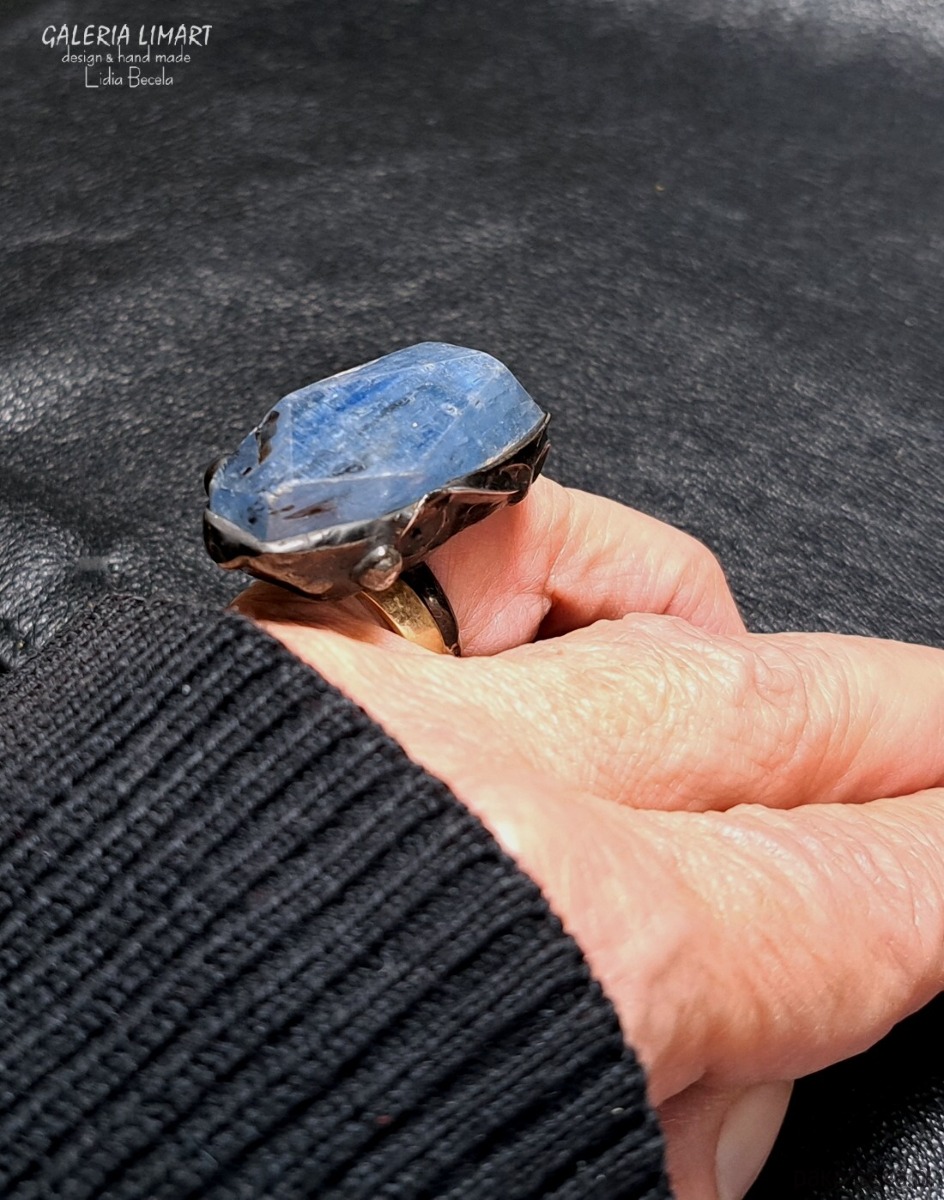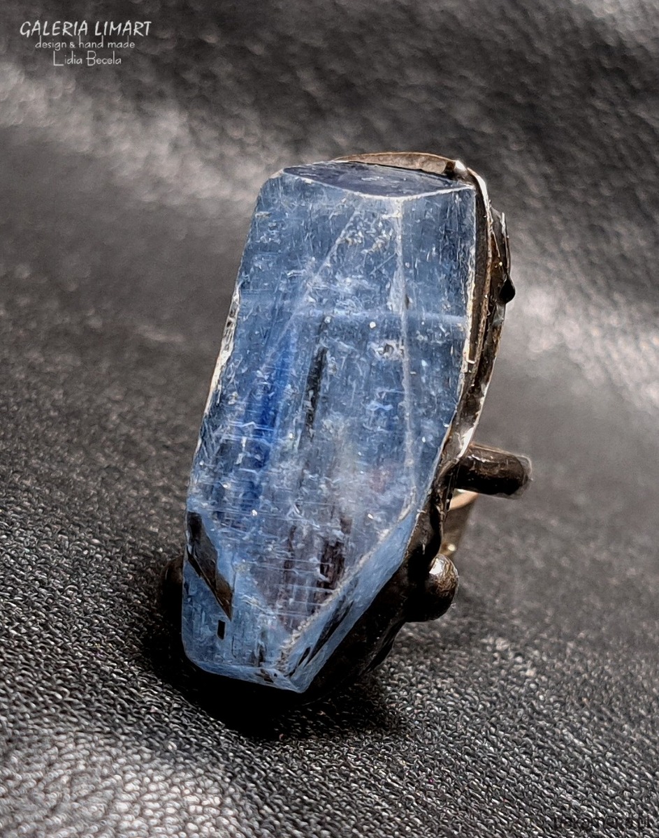Ciekawy i bardzo efektowny pierścień z pięknym w swym ubarwieniu i okazałym (ok. 3,5x1,5 cm) naturalnym surowym kyanitem (dość rzadki kamień). Mieni się różnymi odcieniami niebieskiego czasami wpadającego w zieleń, a czasami w granat.
