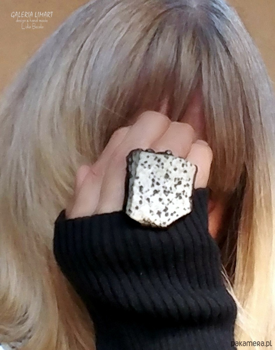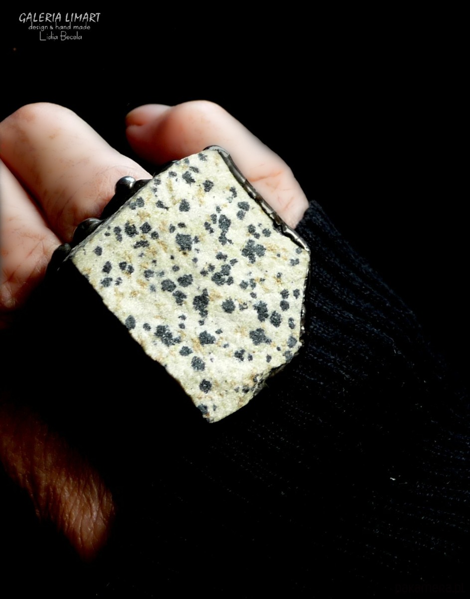 Ciekawy i bardzo efektowny pierścień z pięknym w swym ubarwieniu i okazałym (ok. 3,5x3,5 cm) naturalnym surowym jaspisem dalmatyńskim (dość rzadki kamień). Czarne kropki na jasnym tle są po prostu urocze :)