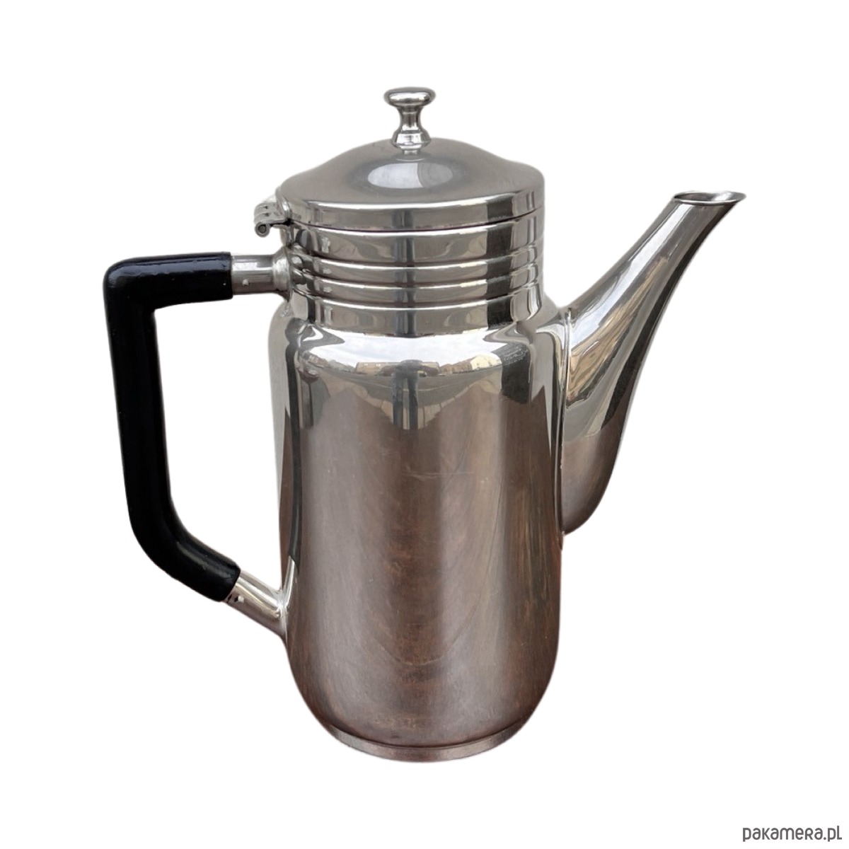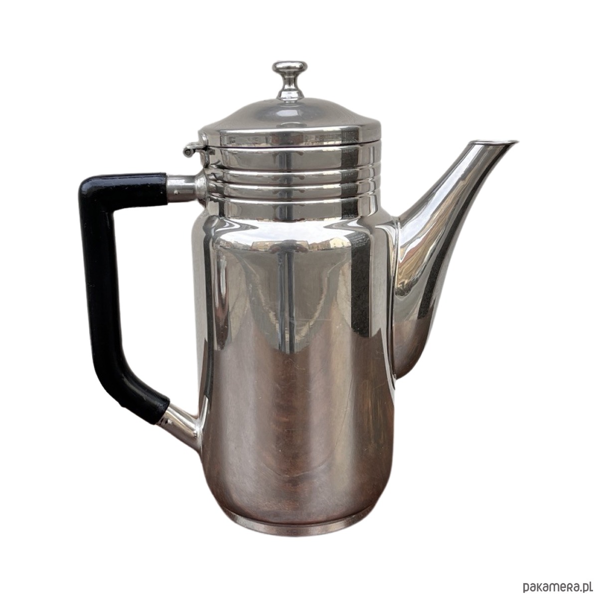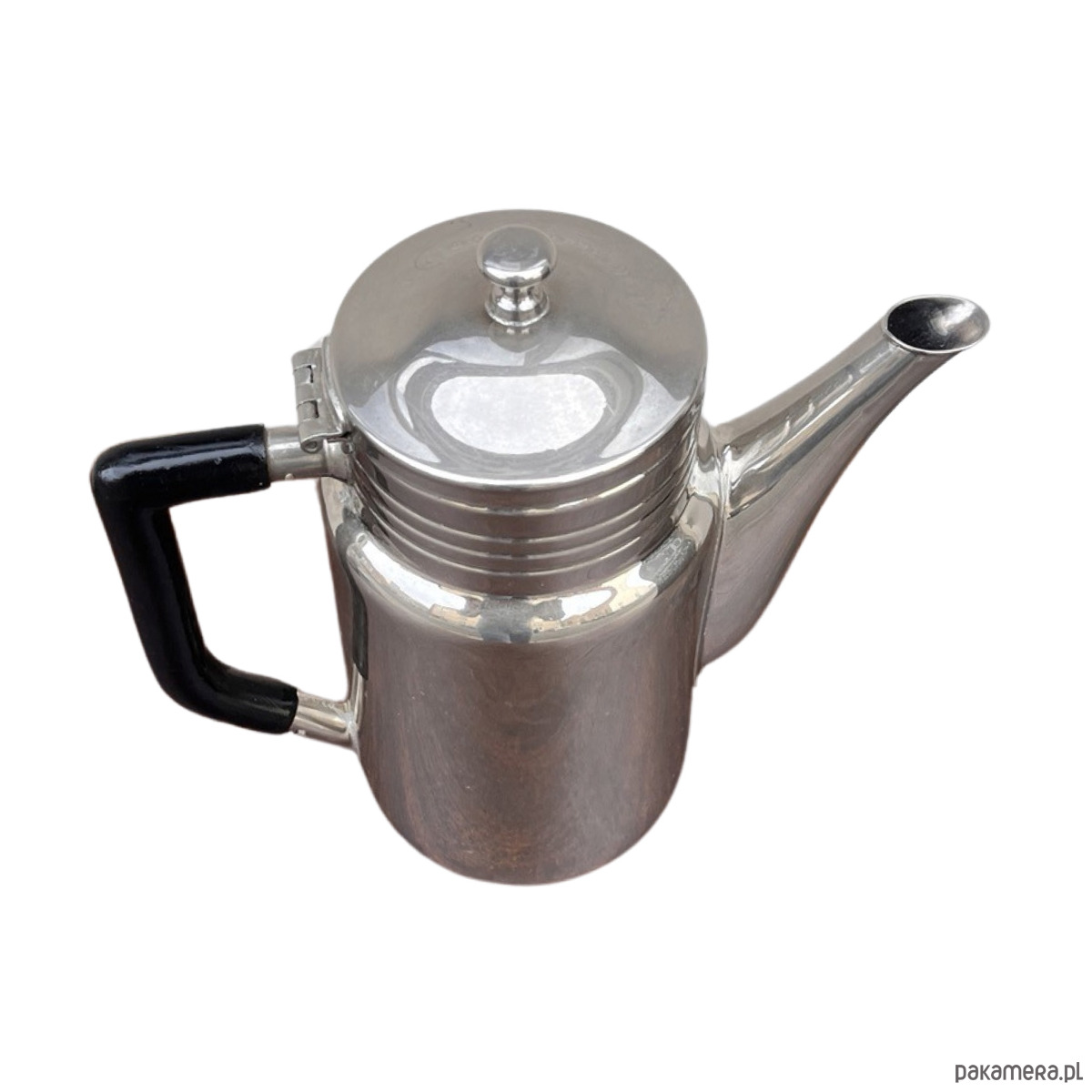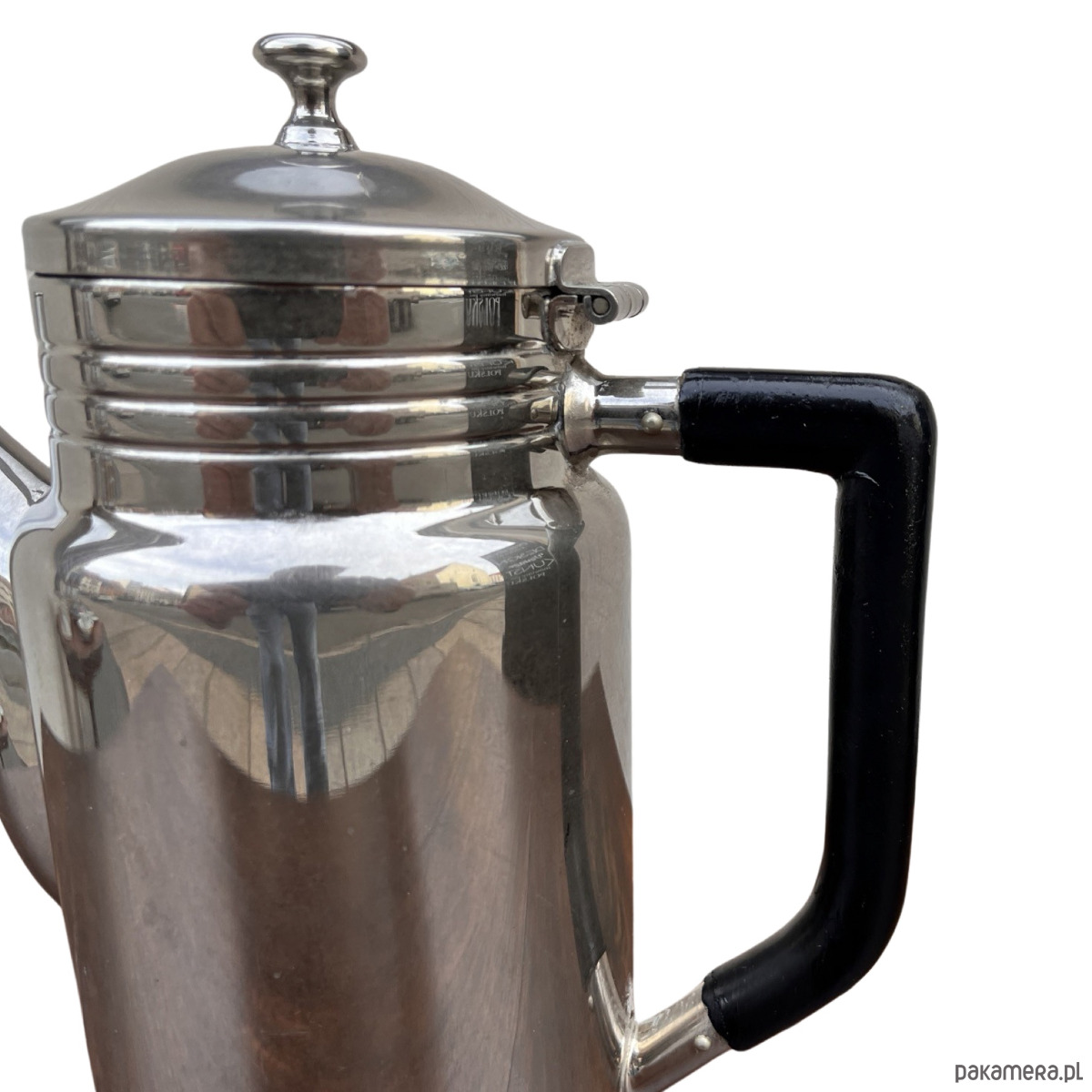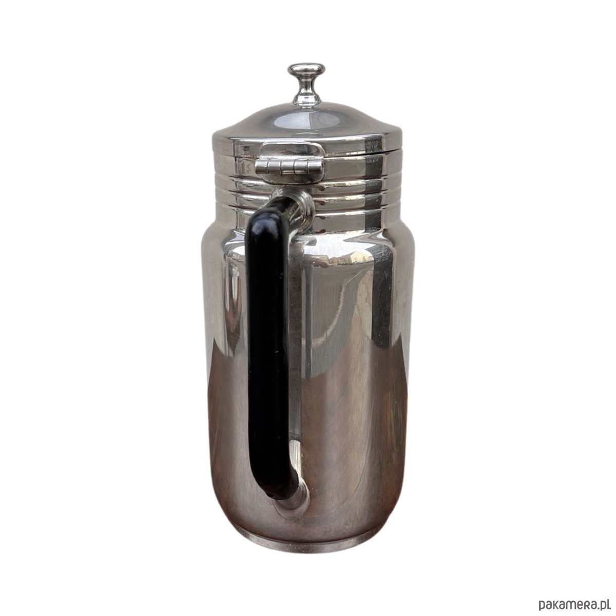 Zjawiskowy srebrny dzbanek w stylu art deco wyprodukowany w Niemczech około 1940 roku. Przedmiot wykonany ze stali, pokryte niklem, emanują elegancją i misternym wzornictwem epoki. Rękojeść dzbanka pokryta dodatkowo oplotem z naturalnej skóry, co dodaje mu unikalnego uroku. To unikalny element wnętrza, który doda charakteru każdemu miejscu. Doskonałe zarówno jako praktyczne akcesoria, jak i kolekcjonerskie skarby w stylu art deco.Stan zestawu oceniam na bardzo dobry, bez uszkodzeń. Od spodu zachowana sygnatura.