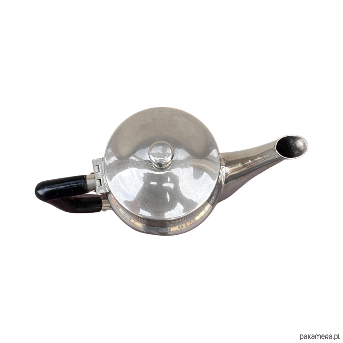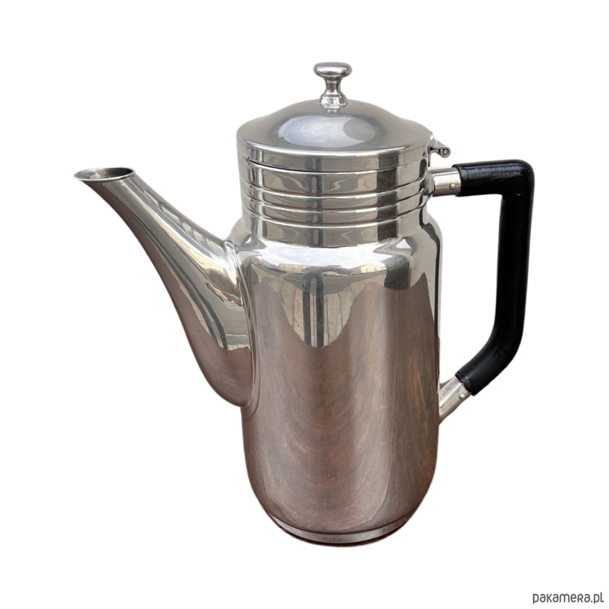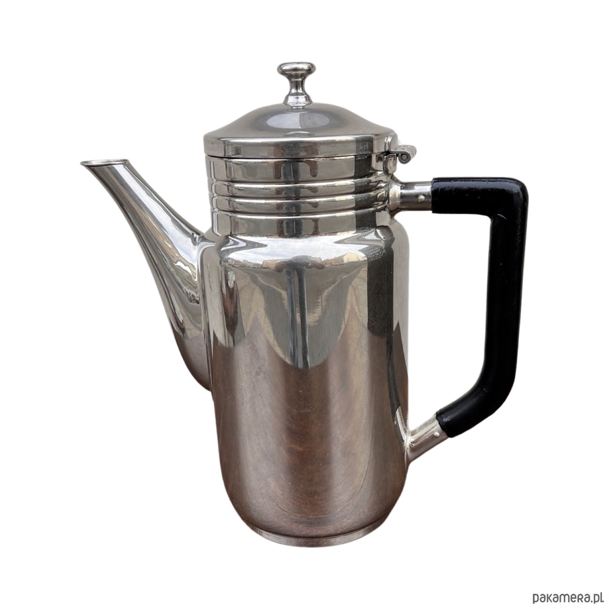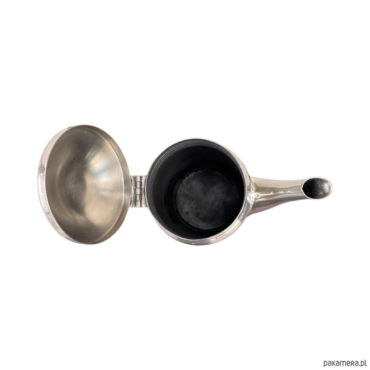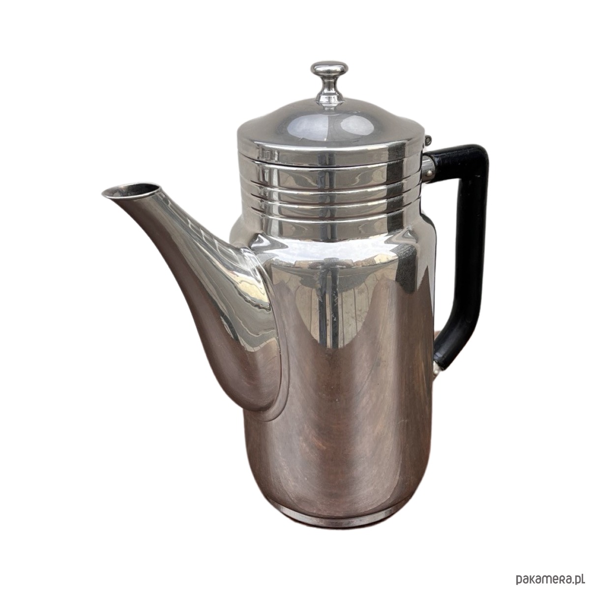 Zjawiskowy srebrny dzbanek w stylu art deco wyprodukowany w Niemczech około 1940 roku. Przedmiot wykonany ze stali, pokryte niklem, emanują elegancją i misternym wzornictwem epoki. Rękojeść dzbanka pokryta dodatkowo oplotem z naturalnej skóry, co dodaje mu unikalnego uroku. To unikalny element wnętrza, który doda charakteru każdemu miejscu. Doskonałe zarówno jako praktyczne akcesoria, jak i kolekcjonerskie skarby w stylu art deco.Stan zestawu oceniam na bardzo dobry, bez uszkodzeń. Od spodu zachowana sygnatura.