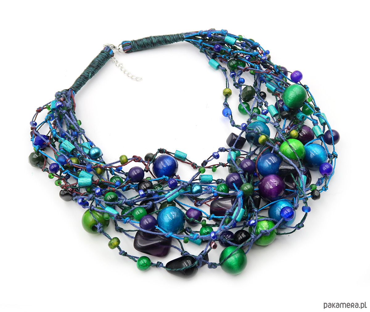 Wyjątkowy, ręcznie wykonany naszyjnik, stworzony w pojedynczym egzemplarzu na bazie wielobarwnej przędzy lnianej w tonacjach szmaragdowej zieleni, lazuru, bordo i granatu. To subtelne połączenie kolorów inspirowanych naturą tworzy efektowną, a zarazem organiczną kompozycję.