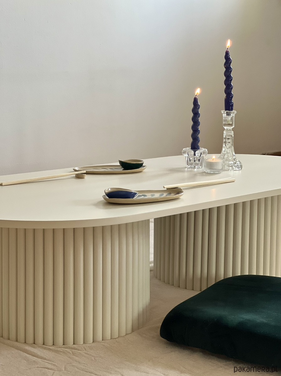 Owalny stolik kawowy w kolorze jasnego beżu na 2 ryflowanych podstawach