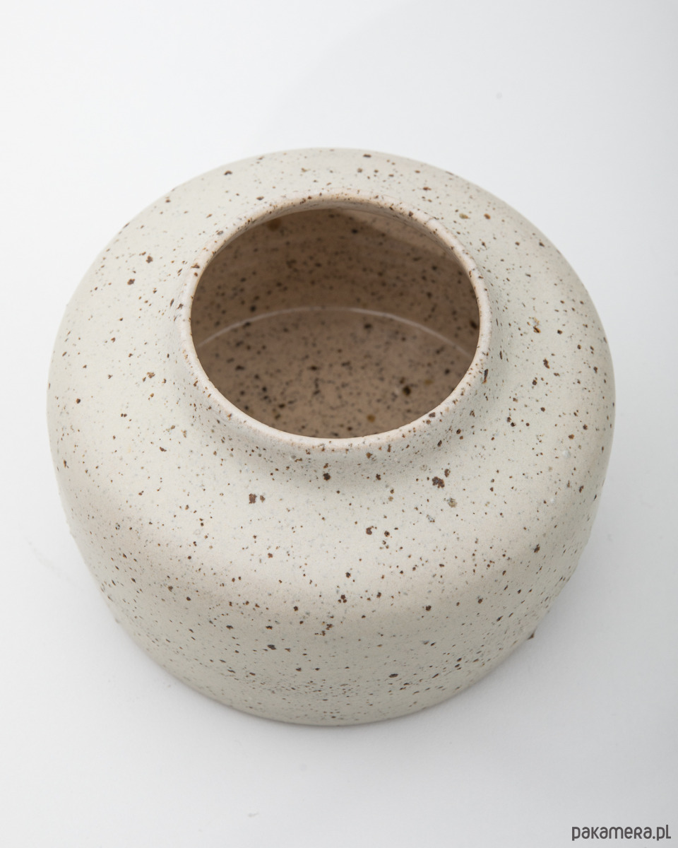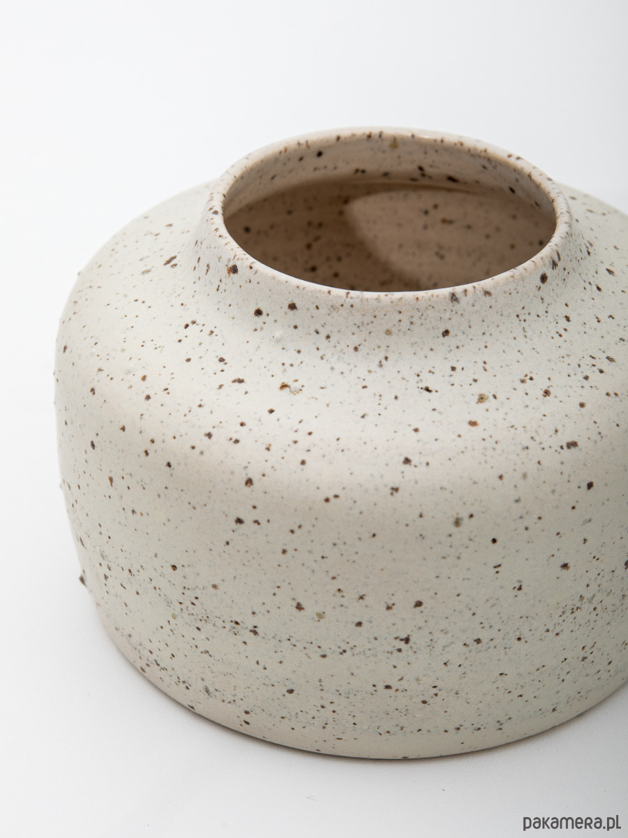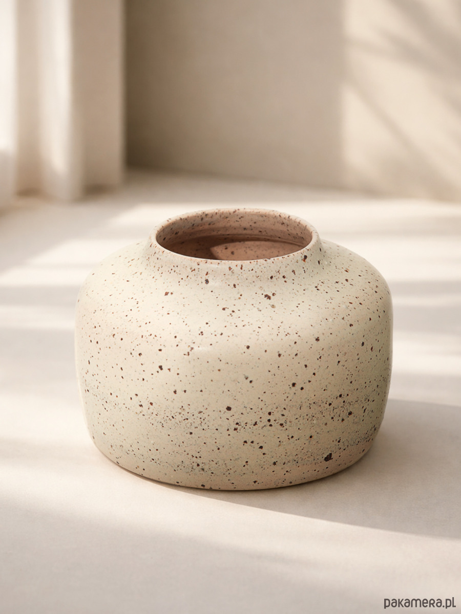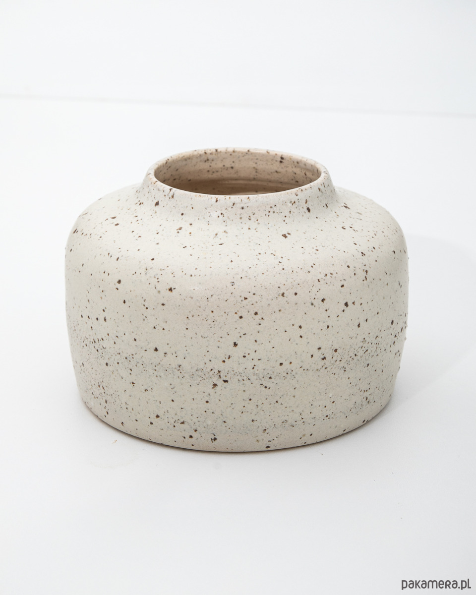 Ręcznie robiony, niski ceramiczny wazon o miękkiej, obłej sylwetce i szerokiej podstawie. Nakrapiany wzór powstaje naturalnie dzięki glinie z dodatkiem minerałów, które tworzą delikatną, wyczuwalną pod palcami fakturę. Jasna kolorystyka i spokojna forma sprawiają, że wazon pięknie eksponuje pojedyncze gałązki lub suszone rośliny, a także doskonale prezentuje się sam jako dekoracyjny akcent.