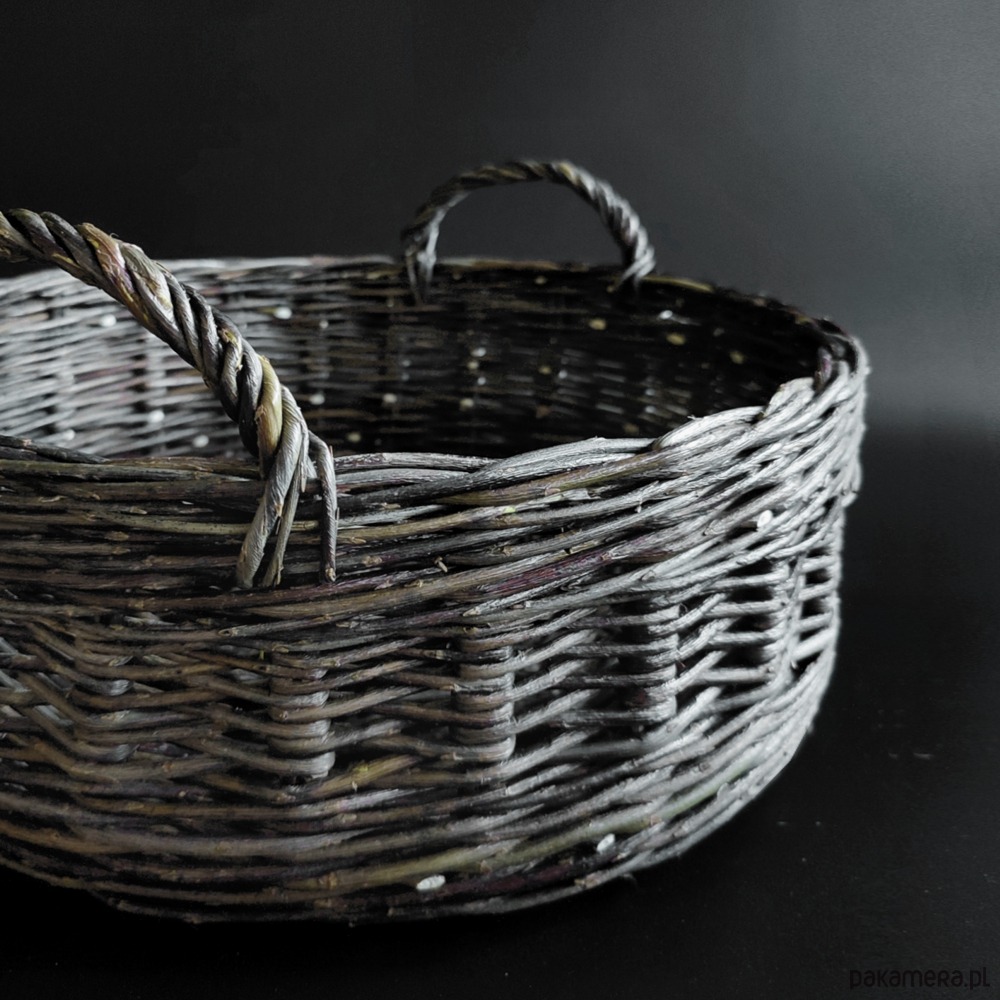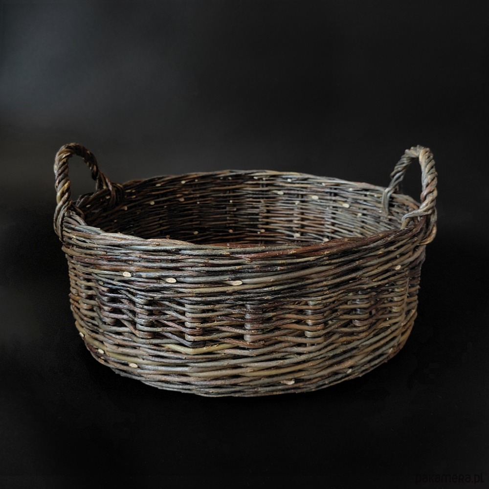 Niski kosz wypleciony na okrągłym dnie z wikliny niekorowanej.