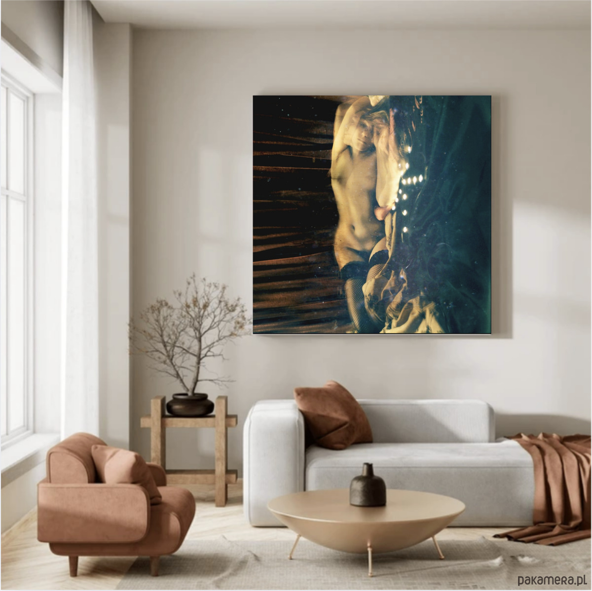 Akt artystyczny na płótnie satynowanym 80x80 cm, praca gotowa do zawieszenia na ścianie-naciągnięta na solidny blejtram i utrwalona werniksem (mat lub piękny pół połysk satynowy), co daje dodatkowe zabezpieczenie przed urazami zewnętrznymi. Werniks w bardzo elegancki sposób wydobywa fakturę płótna, a pół połysk dodatkowo ożywia kolory. Dzięki werniksowi można obraz od czasu do czasu delikatnie przetrzeć na sucho z kurzu.