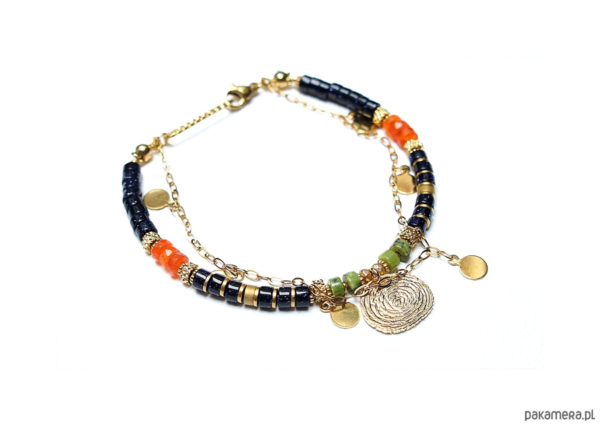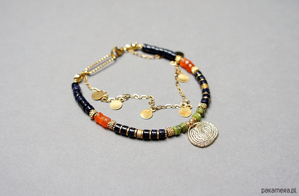Bransoletka wykonana ze stali szlachetnej oraz kamieni - talarków nocy kairu [4 x 2mm; kamienie mienią się jak gwiazdy na niebie], talarków matowego hematytu [4 x 2mm], talarków jaspisu [4 x 2mm], talarków nieregularnych karneolu [4 x 2mm]. Całkowita długość bransoletki: ok. 19,8cm. Biżuteria ozdobnie zapakowana.