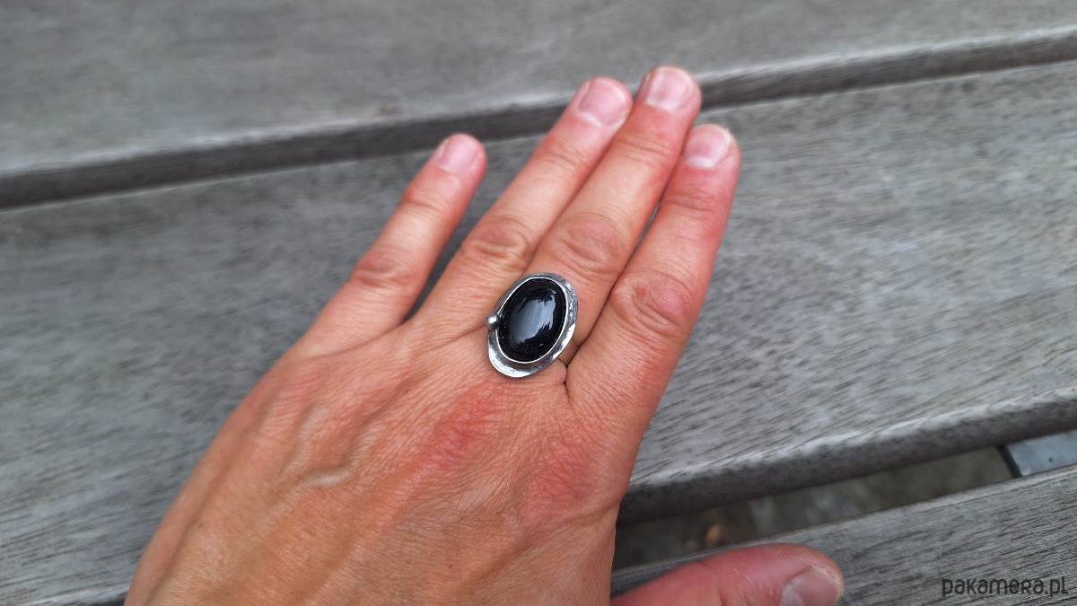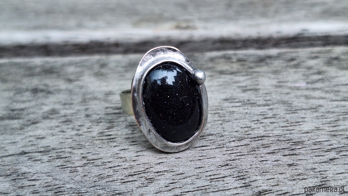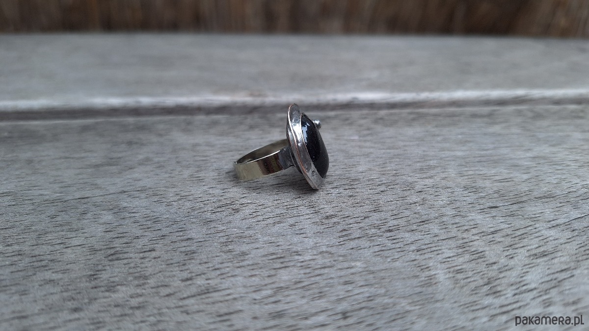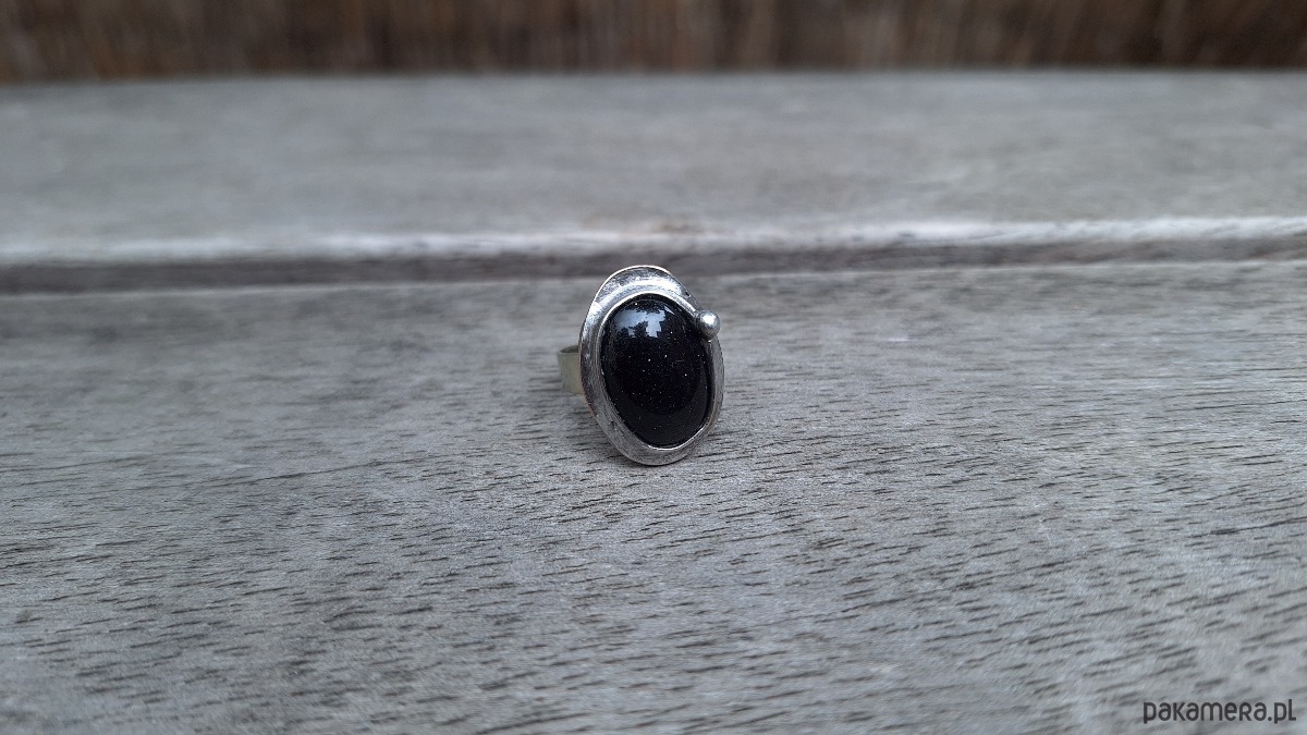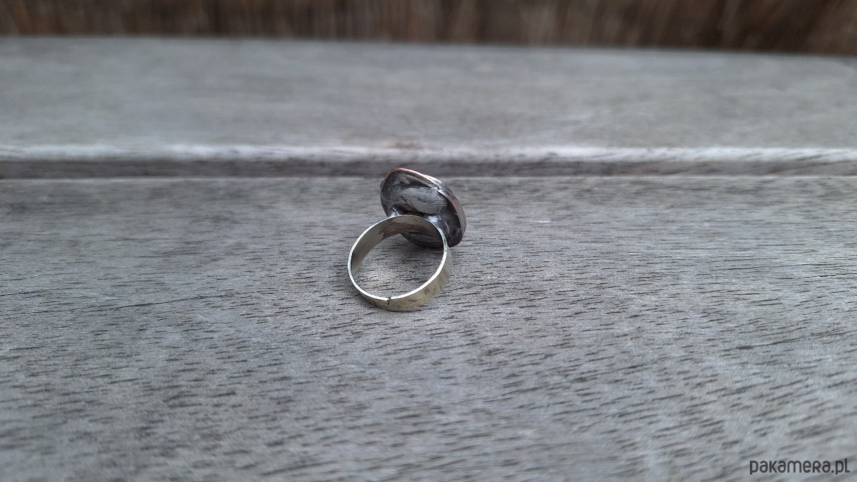 Pierścionek wykonany z miedzi, cyny i szkła. Wymiary ok. 2 na 1.5 cm. Regulowany. Nie jest ciężki.