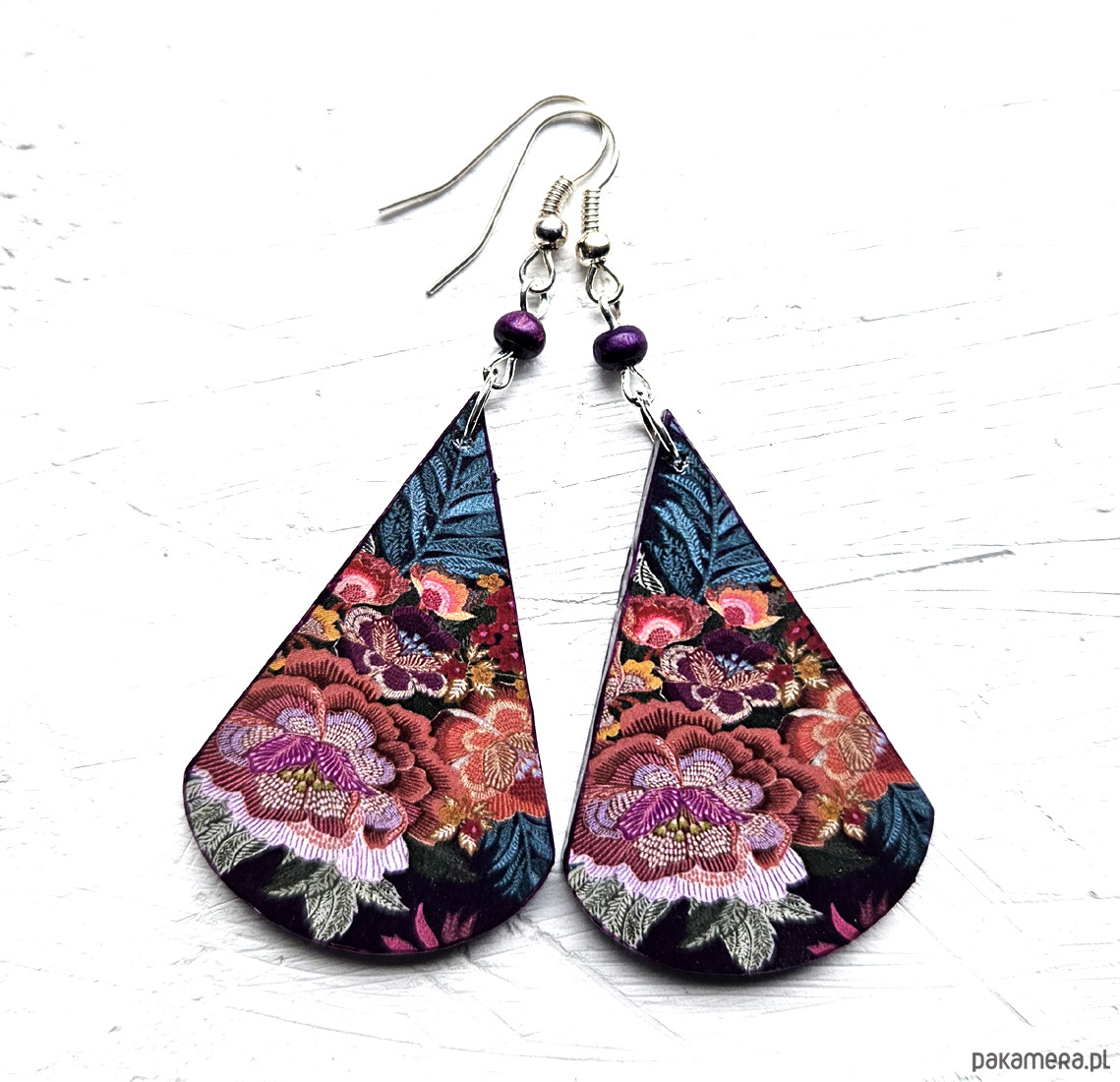 kolczyki drewniane, ozdobione metodą decoupage, dwustronne, starannie wykończone farbami akrylowymi i zabezpieczone wielokrotnie lakierem, bigle posrebrzane, długość kolczyków bez bigli: 5,5 cm, szerokość: 3 cm, bardzo lekkie
