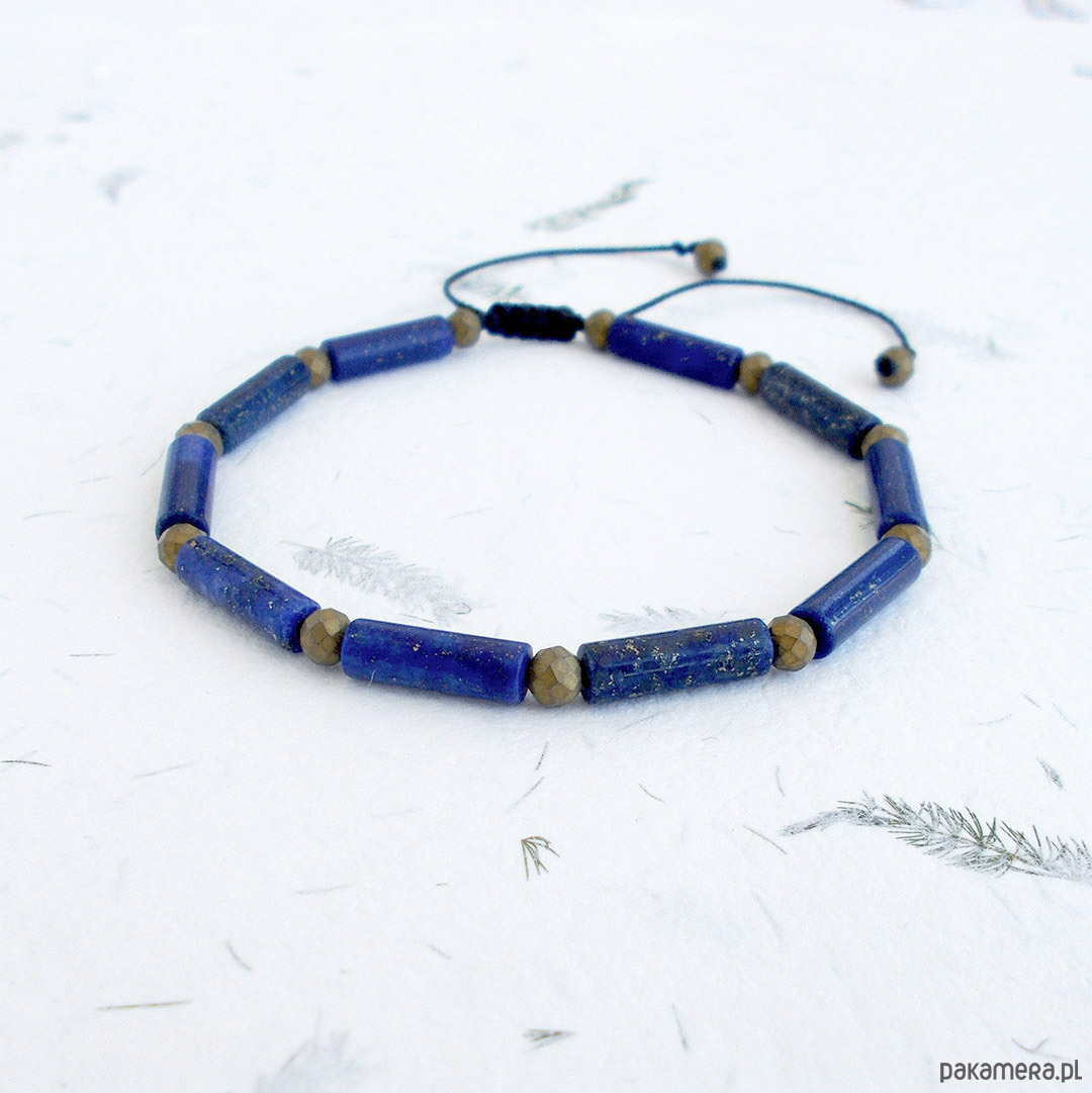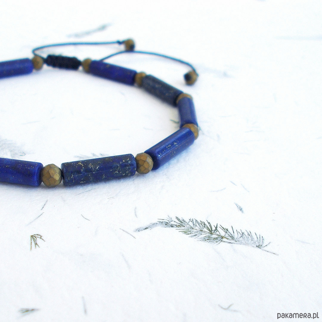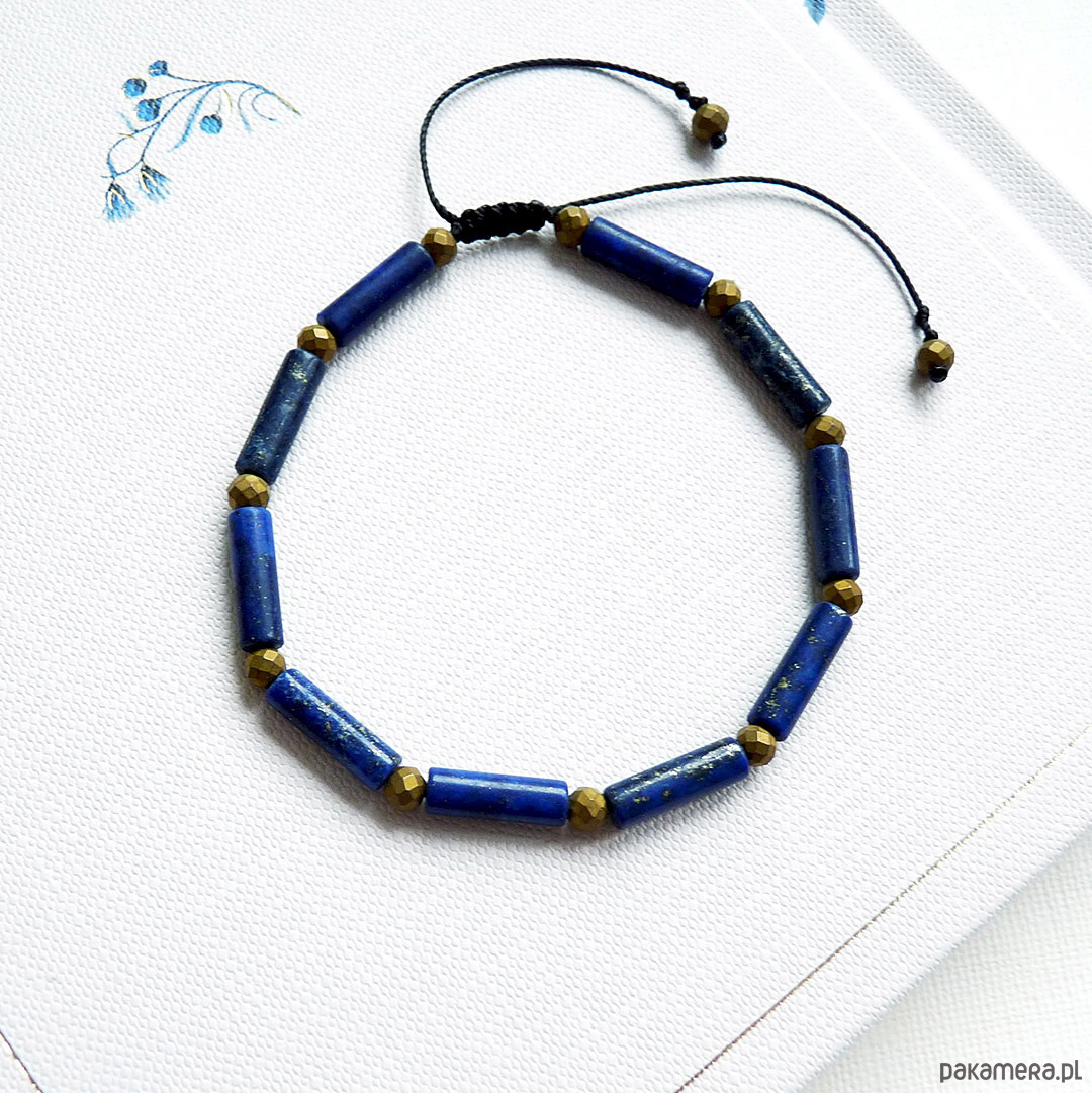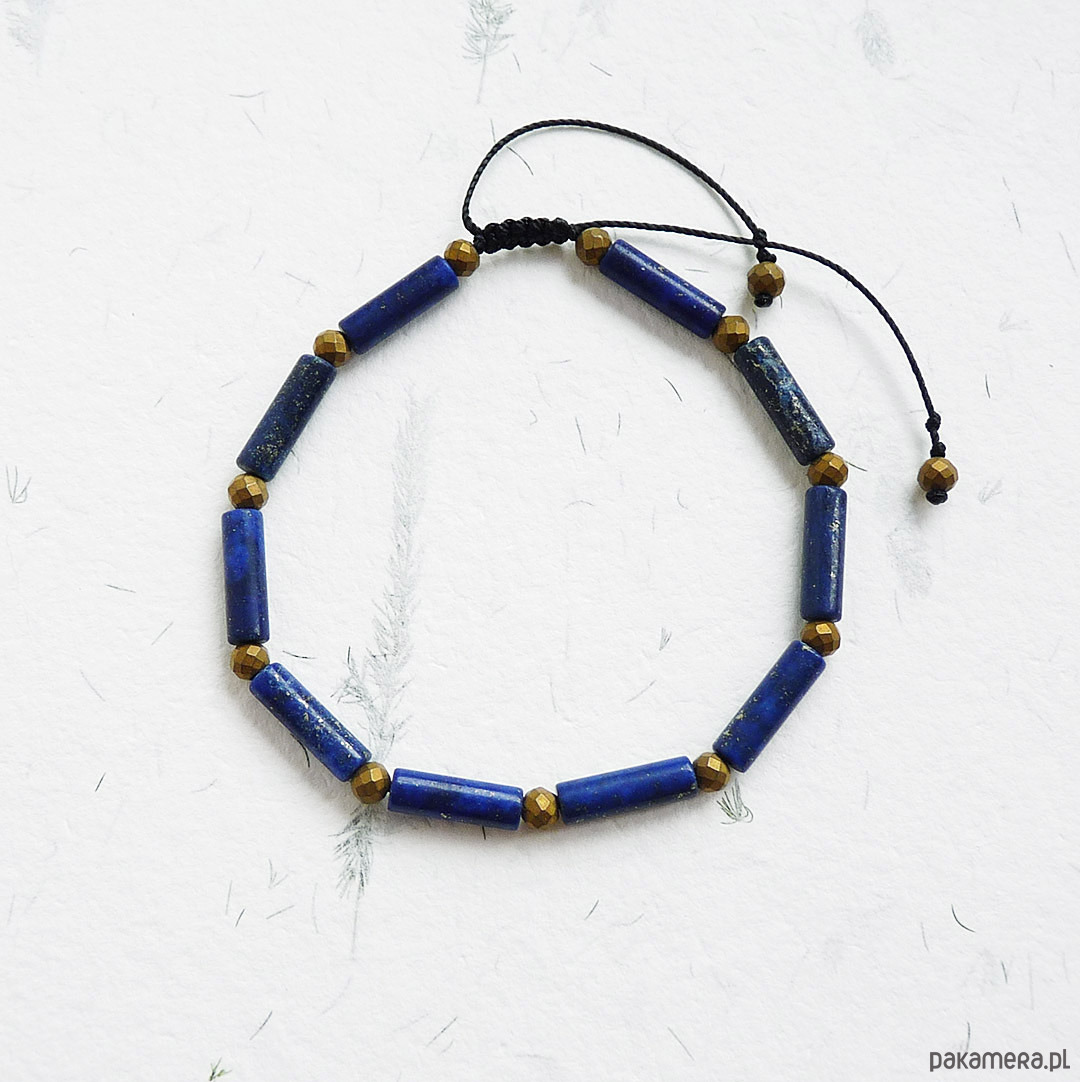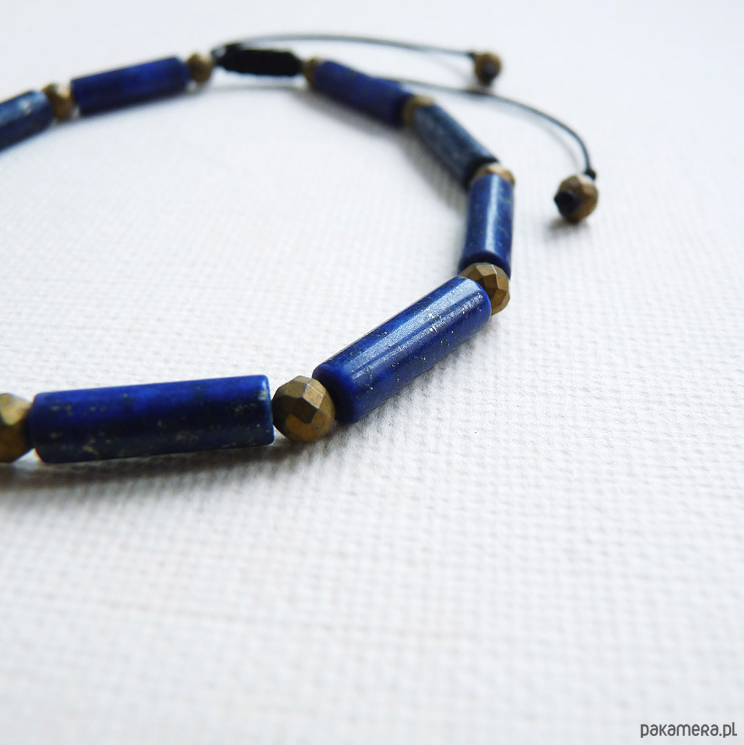 lapis lazuli wałek 12 mm, hematyt matowy stare złoto 4 mm, solidny czarny sznurek